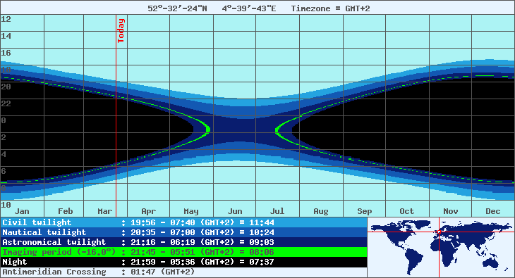 Astronomical Twilight toolFor those interested in the times and period of imaging based on various twilights I have made this small configurable twilight graph. Along the horizontal scale it shows the day of the year, along the vertical scale the hour of the day with noon at the top and bottom and midnight at the centre. The latitude, longitude and time zone can be changed to one's own location. The resulting graph shows civil, nautical and astronomical twilight and in addition a green band centred around a configurable solar altitude (default = -16 degrees), which indicates the start and end of the imaging period. In addition the antimeridian passage of the sun is given as an indication for the darkest moment of the night. Measurements have shown that at about 15-16 degrees below the horizon little improvement in SQM value can be expected, hence this configurable field (limit=-15 or limit=-15.5, etc). These measurement show SQM values vs solar altitude (http://www.hnsky.org/sqm_twilight.htm). Although this data is collected on one location only and should be backed up by more data measured elsewhere to gain more scientific value, it seems fair to start around this -15 degrees solar altitude. I expect that the SQM values also depend on the direction in which we want to image (in direction of or opposite to the setting/rising sun). Especially locations further from the equator than 50 degrees may benefit from the additional time. The red vertical line represents today's date, the twilight times and periods of which are shown below the graph. Your personalised twilight graphThe image is created by a PHP script and can be placed on your own website using the following HTML-code: IMG SRC=http://www.dehilster.info/astronomicaltwilight.php?latitude=52.5402&longitude=4.662&zone=2&limit=-13![]() Alternatively the following link can be modified and bookmarked: http://www.dehilster.info/astronomicaltwilight.php?latitude=52.5402&longitude=4.662&zone=2&limit=-16 The latitude, longitude, time zone and limit can be modified to match your observatory. North of equator and eastern hemisphere are positive figures. The limit is the altitude below the horizon at which the green line is drawn (default = -16). Other directives are: &date=[the date for which you want to see the graph, e.g. &date=15 October 2023] &dst=CEST (for European Daylight Saving Time) &dst=CAN (for Canadian Daylight Saving Time) &dst=UK (for UK Daylight Saving Time) &dst=US (for US Daylight Saving Time, but you need to specify the zone) Please let me know if you have special requirements regarding Daylight Saving Time. If you have any questions and/or remarks please let me know. |