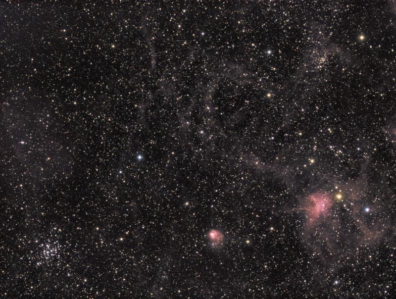 Processing in APP, post-processing in PSP, Topaz Denoise and Siril. Click here for the full image. NGC 7635 (Bubble Nebula)In May 2020, at the end of the 2019-2020 imaging season, I photographed the Bubble Nebula. It all started with a test with new ZWO 36mm unmounted H-alpha and S-ii filters. I had replaced the old one as those produced strong halos around bright objects. The Bubble Nebula is located in Cassiopeia at a distance of 7100 light years. From the image resolution of 0.72"/px and the dimensions of the bubble its diameter can be calculated as 6.8 light years. In total the image contains just over 7 hours of integration time: