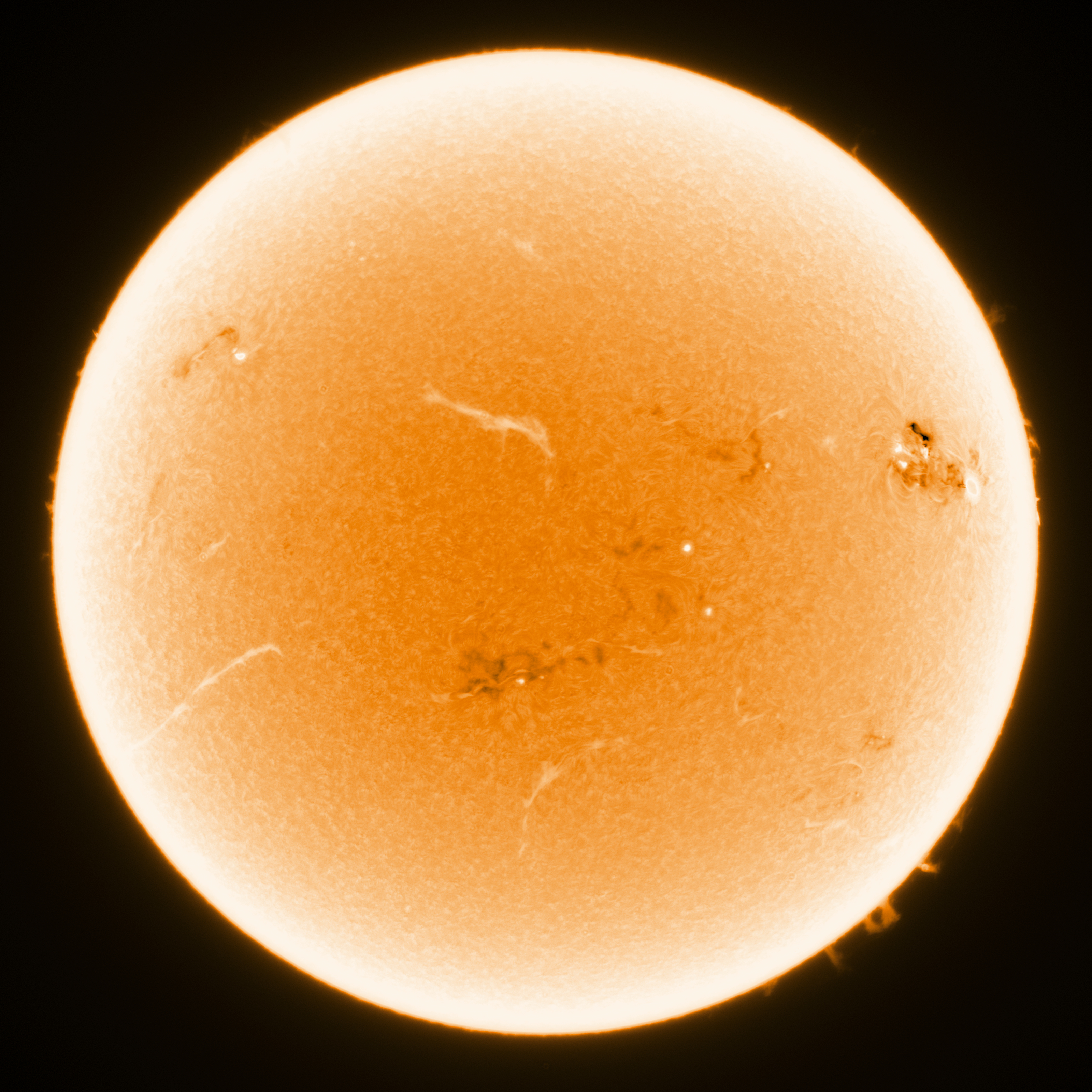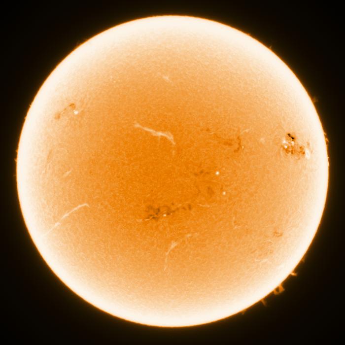 SunThe natural celestial objects nearest to earth are of course those found in our Solar System. Closest to earth is the moon, which gives stunning views, even at the lowest modest magnification. The Sun (see figure 92) is the closest star to earth. Light only takes 8 minutes to arrive here. Using the Lunt LS80THA nice images can be made of the granulation on its surface and of the solar flares (protuberances) around the edge. Using the SkyWatcher Esprit 150ED and a Baader white-light foil-filter images in the full visible spectrum can be taken, reveiling sunspots as if they were projected. All images on this page have been taken with a monochrome camera and are artificially coloured. 8 February 2026![]() Figure 1: The Sun imaged in H-alpha on 8 February 2026 @ 11:42UTC using Lunt LS80THA and ASI1600MM Pro Cool. On 8 February 2026 a very active zone appeared just north of AR4366 (the black area above the sunspot group near 3 o'clock in the image). Imaging in H-alpha was done around 11:42:50UTC using the Lunt LS80THA, TeleVue 2x PowerMate (so f/14), ZWO ADC and ZWO ASI1600MM Pro Cool. Some 250 frames were captured with FireCapture, manually triggered, only 25% of which were stacked in AutoStakkert!4 with 1.5px pre-blur, but without sharpening. In order to get rid of the last bayer-pattern artefacts the stack was given a 0.55px Gaussian blur in PSP and sharpened using an Unsharp Mask of first 1.1px and strength of 500, followed by another one of 10px and strength of 20 (no clipping in both cases). Then it was ran through ImPPG to invert the histogram, but without any deconvolution or sharpening. Finally it was given another 0.55% Gaussian Blur to remove Unsharp Mask artefacts, followed by my default colour, a default Sharpen More, and 19% Vibrancy. The original image can be found here. In whitelight the very active area just above AR4366 does not show. Image taken using SkyWatcher Esprit 150ED, ZWO green filter, and ZWO ASI1600MM Pro Cool, stack of best 23 frames out of 250. In post-processing only a Sharpen more was applied in PSP and the colour added. 30 November 2025On this day I caught yet another airplane while imaging the Sun. 29 June 2025![]() Figure 4: The Sun imaged on 29 June 2025 around 12:23:51UTC with the Lunt LS80THA and ZWO ASI1600MM Pro Cool. On 29 June 2025 a huge prominence detached from the solar surface. Using the Lunt LS80THA I imaged the Sun in H-alpha. Capture was done around 12:23:51UTC with the Lunt LS80THA, TeleVue 2x PowerMate (so f/14), ZWO ADC and ZWO ASI1600MM Pro Cool. Some 250 frames were captured with FireCapture, manually triggered, only 25% of which were stacked in AutoStakkert!4 with 1.5px pre-blur, but without sharpening. In order to get rid of the last bayer-pattern artefacts the stack was given a 0.55px Gaussian blur in PSP and sharpened using an Unsharp Mask of first 1.1px and strength of 500, followed by another one of 10px and strength of 20 (no clipping in both cases). Then it was ran through ImPPG to invert the histogram, but without any deconvolution or sharpening. Finally it was given another 0.55% Gaussian Blur to remove Unsharp Mask artefacts, followed by my default colour, a default Sharpen More, and 19% Vibrancy. The original image can be found here. ![]() Figure 5: The Sun imaged on 29 June 2025 around 12:45:39UTC with the Esprit150ED and ZWO ASI1600MM Pro Cool. Some twenty minutes later I captured the Sun in whitelight using the SkyWatcher Esprit 150ED, ZWO green filter and ZWO ASI1600MM Pro Cool. Using AutoStakkert!4 23 frames were stacked without sharpening. Then in PSP a default sharpen more was applied, followed by my default colour. The original image can be found here. 14 June 2025On 14 June 2025 we finally had some decent seeing of around 1 arc-second, so after the daily sunspot number count I installed a ZWO ASI1600MM Pro Cool behind the Lunt LS80THA to image the Sun in H-alpha. There was some light clouds that made it difficult to stack the data. Capture was done around 09:14UTC with the Lunt LS80THA, TeleVue 2x PowerMate (so f/14), ZWO ADC and ZWO ASI1600MM Pro Cool (I moved from the QHYCCD QHY163 mono to the ZWO camera earlier this year). Some 250 frames were captured with FireCapture, manually triggered, only 25% of which were stacked in AutoStakkert!4 with 1.5px pre-blur, but without sharpening. In order to get rid of the last bayer-pattern artefacts the stack was given a 0.55px Gaussian blur in PSP and sharpened using an Unsharp Mask of first 1.1px and strength of 500, followed by another one of 10px and strength of 20 (no clipping in both cases). Then it was ran through ImPPG to invert the histogram, but without any deconvolution or sharpening. Finally it was given another 0.55% Gaussian Blur to remove Unsharp Mask artefacts, followed by my default colour, a default Sharpen More, and 19% Vibrancy. The original image can be found here. I superimposed the Earth and Jupiter to scale in the image to show the enormity of the protuberance. Another three recordings were made that day, but not as good as the one shown above. Still they could be used to produce adjacent animation. Somewhat earlier that day, around 08:39UTC, imaging was done with the SkyWatcher Esprit 150ED, a ND5.0 solar foil filter, a ZWO green filter and ZWO ASI1600MM Pro Cool. A recording of 250 frames was processed in AutoStakkert without sharpening (23 frames stacked). Post-processing was done in PSP (Sharpen More, artificial colouring). The original image can be found here. 28 March 2025On this day we had a partial solar eclipse in the Netherlands. Some 160Gb of data was collected with the SkyWatcher Esprit 150ED and Lunt LS80THA of which this is the first image, taken with the Esprit around the eclipse maximum. Imaging was done with a ND5.0 solar foil filter, a ZWO green filter and ZWO ASI1600MM Pro Cool. A recording of 100 frames was processed in AutoStakkert without sharpening. Postprocessing was done in PSP (Sharpen More, artificial colouring). The origina