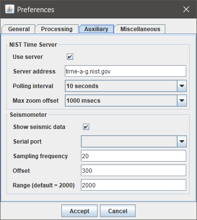 The seismometer operates using an USB to serial analogue to digital converter (AD-converter). The serial ports pull-down list is populated each time the preferences dialogue is openened. The USB AD-cenverter can thus be connected while MountMonitor is running as long as the preferences dialogue is closed.
