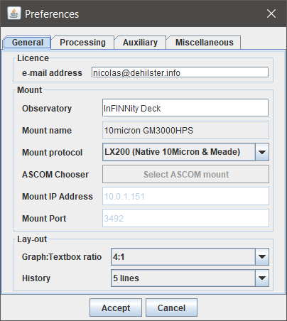 The basic edition of MountMonitor only monitors RA and DEC. The registered version allows monitoring of an attached seismometer. For this an e-mail address should be provided, which is used for communication with the developer and to check the license status. When supplying an e-mail address the user is automatically informed of updates. For the basic functionality the e-mail address can be left blank and no internet connection is required. For the seismometer licence an e-mail address and internet connection (only required at start-up) are mandatory. When no internet connection is available MountMonitor automatically reverts to the basic mode at next start-up.