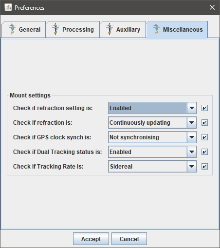 Mount settings panel currently has a variety of settings that can be used to check if they have been properly set in the mount. Enabling these settings makes MountMonitor to check at start-up and after every slew whether or not the mount has these options set as indicated by the options in their respective pull-down lists. If enabled an alert pop-up will warn the user to correct the setting. Both the warnings and the successful verifications are logged in the log file.