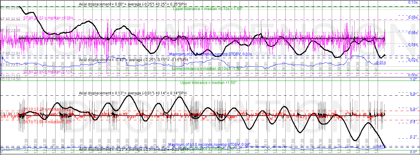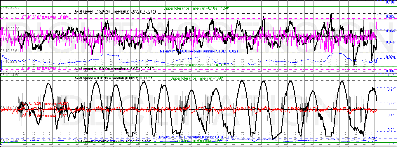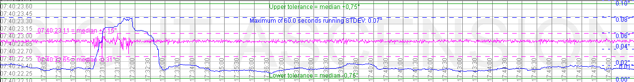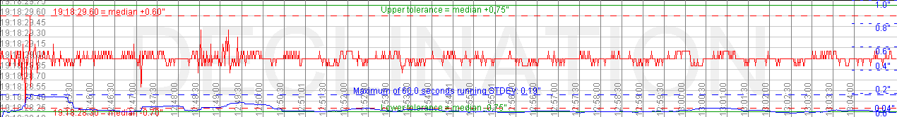 - As a linear regression (shown as an extra fat black line): using the Running Average Length setting from the preferences menu a linear regression is calculated over a longer period of time, producing a much smoother graph. The disadvantage of this method is that it may smoothen-out small deviations and that it delays the graph by the length of the Running Average Length (but the graphs can be shifted). It is for this reason that the axial speed data is presented in three ways. The values of the speeds are annotated along the min/max lines and shown in arc-seconds per second ["/s].
