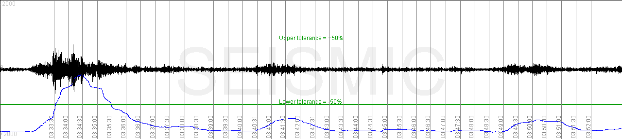 Seismic data is drawn in black. In the background the word “SEISMIC” is written in light grey. The vertical scale is manual and can be set in the preferences menu. At the left hand side the maximum and minumum scale values for the seismic data are shown in grey.