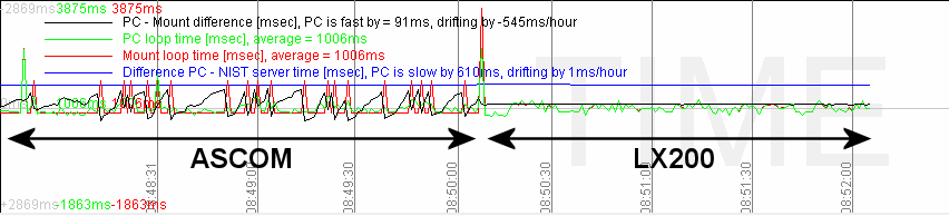 The quality of the time-graph may depend on the connection. The 10Micron GM3000HPS clearly shows a difference in timing accuracy between the LX200-protocol and ASCOM protocol as can be seen in below graph.