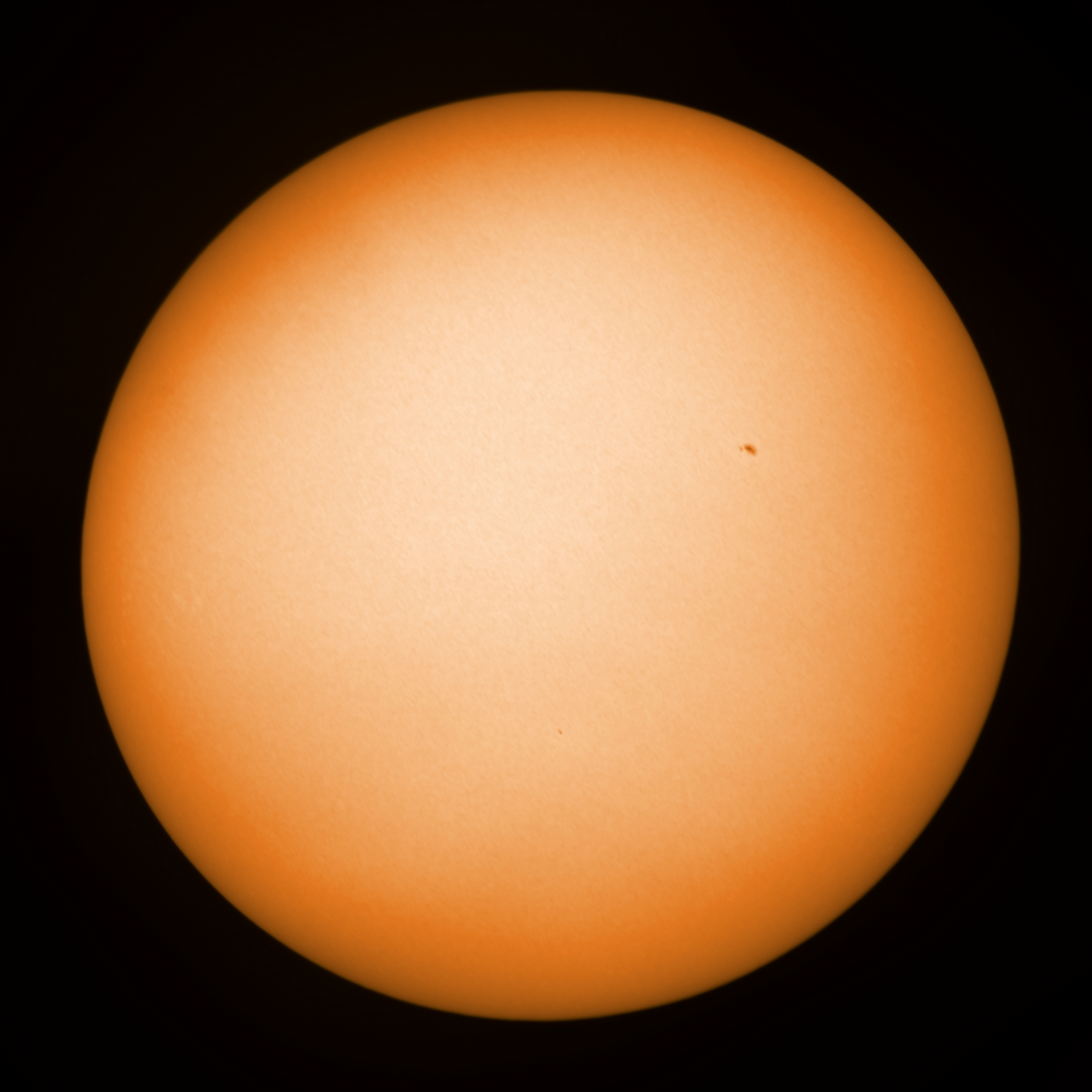 Observation date/time: 14 May 2021 @ 18:40 UTC Telescope: GTT60 (Galileo Type Telescope) Focal length: 1490mm (plano convex singlet) Aperture: 60mm Stop: 30mm Eyepiece: -75mm (plano concave singlet, 24mm aperture) Observation type: projection (350mm distance, 80mm diameter) Reference: Earth's rotation axis =================================================================== Total number of sunspots: 1 | |