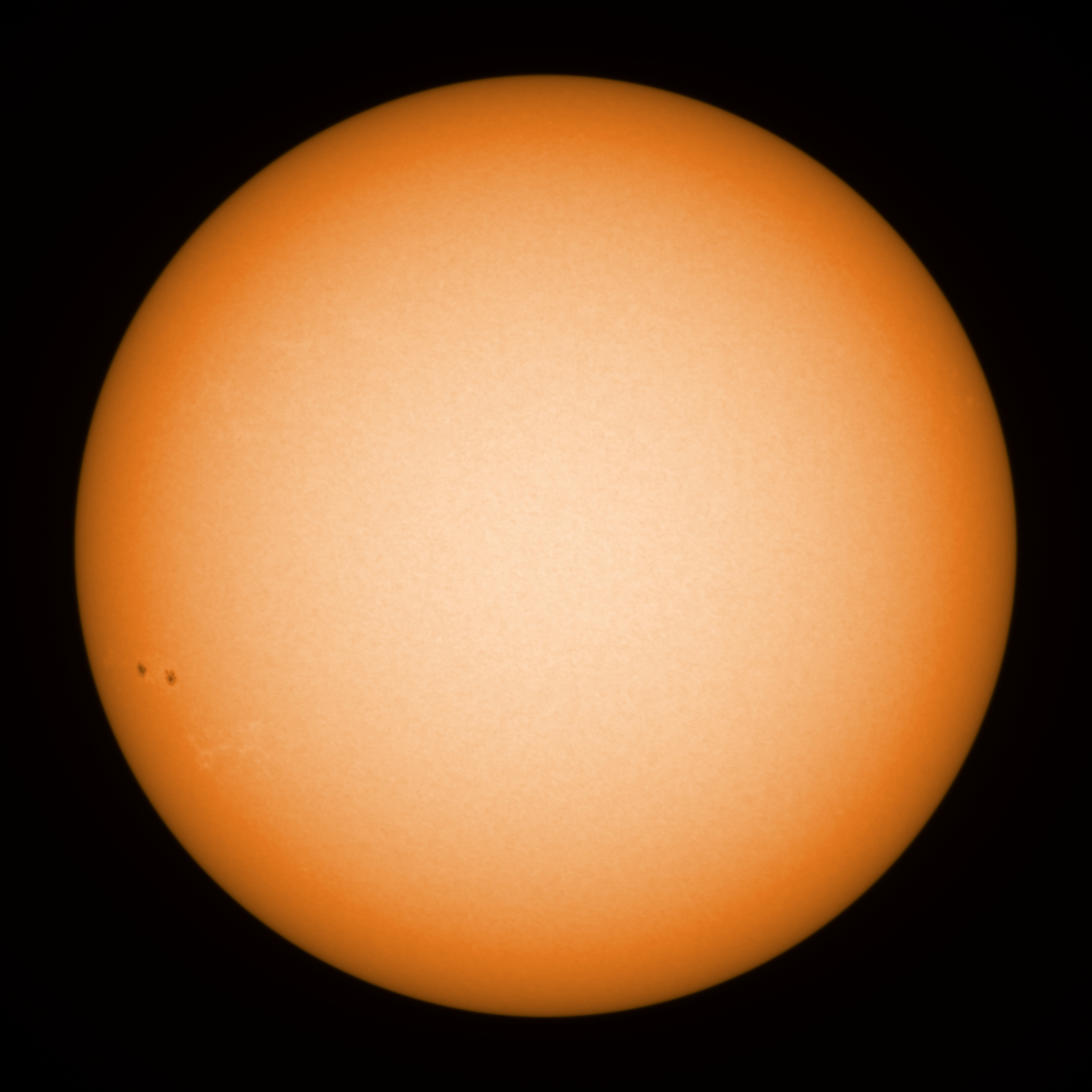 Observation date/time: 26 June 2021 @ 14:35 UTC Telescope: GTT60 (Galileo Type Telescope) Focal length: 1490mm (plano convex singlet) Aperture: 60mm Stop: 30mm Eyepiece: -75mm (plano concave singlet, 24mm aperture) Observation type: projection (353mm distance, 80mm diameter) Reference: Earth's rotation axis =================================================================== Total number of sunspots: 2 | |