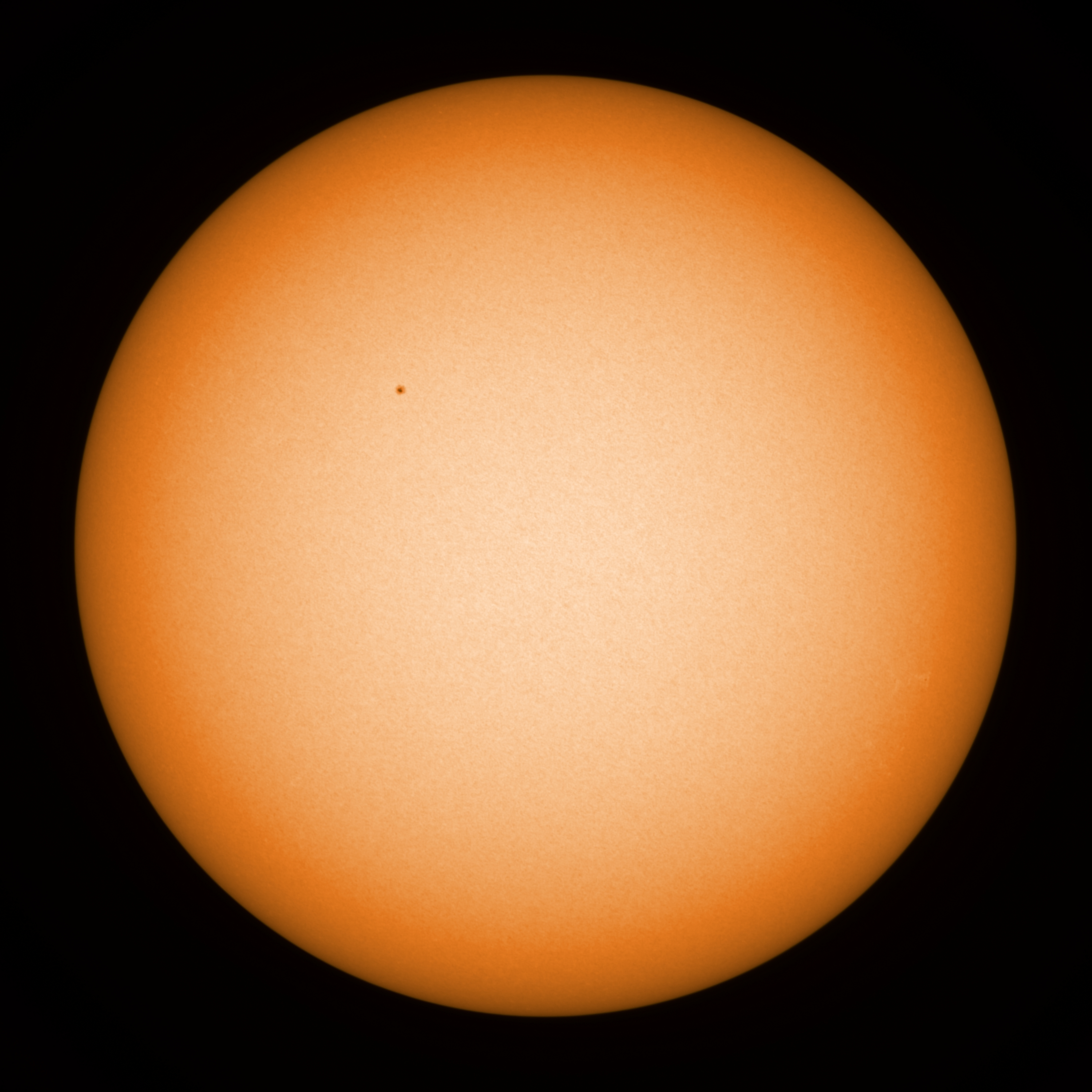Observation date/time: 15 July 2021 @ 13:39 UTC Telescope: GTT60 (Galileo Type Telescope) Focal length: 1490mm (plano convex singlet) Aperture: 60mm Stop: 30mm Eyepiece: -75mm (plano concave singlet, 24mm aperture) Observation type: projection (353mm distance, 80mm diameter) Reference: Earth's rotation axis =================================================================== Total number of sunspots: 1 | |