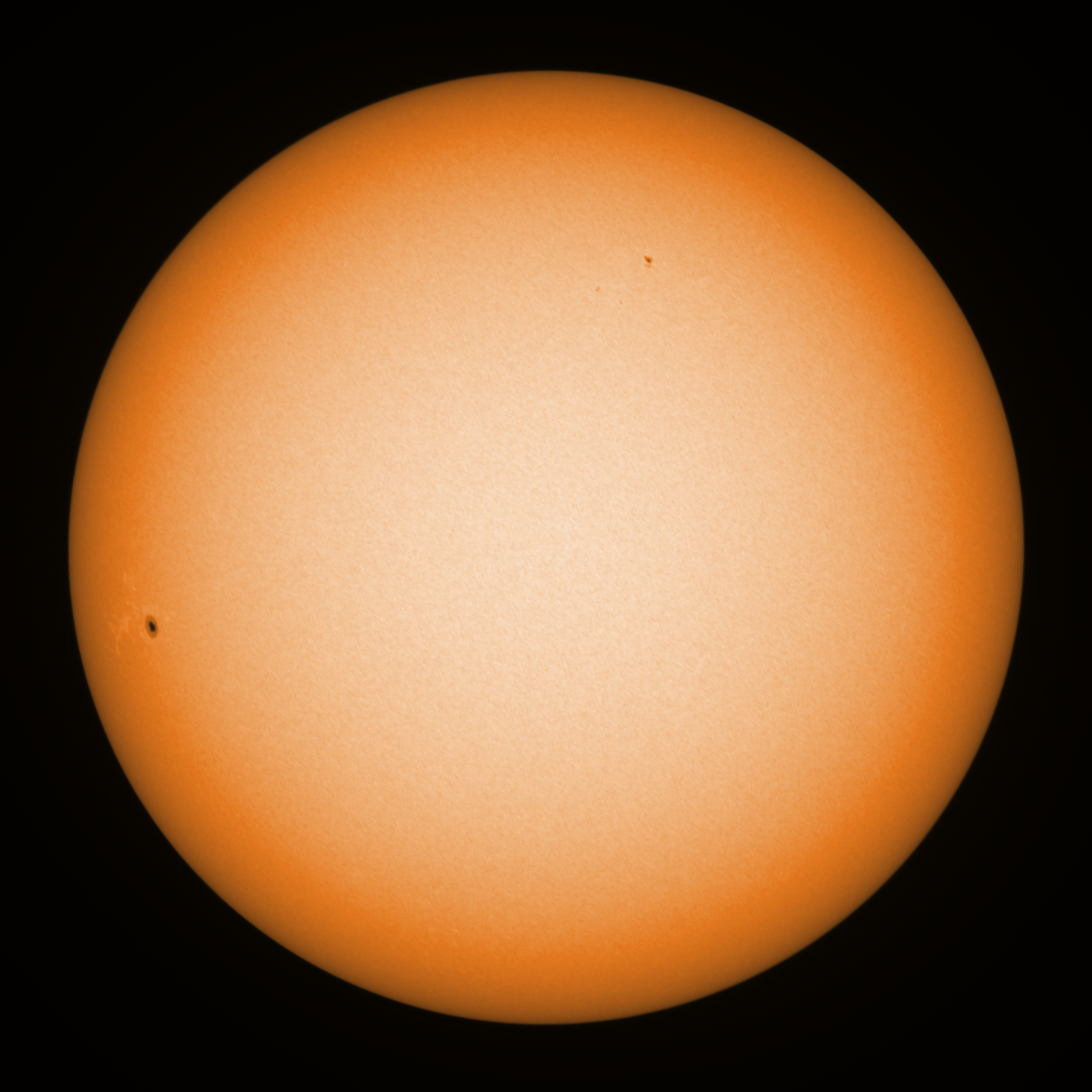 Observation date/time: 05 October 15:23 UTC Telescope: GTT60 (Galileo Type Telescope) Focal length: 1490mm (plano convex singlet) Aperture: 60mm Stop: 30mm Eyepiece: -75mm (plano concave singlet, 24mm aperture) Observation type: projection (351mm distance, 80mm diameter) Reference: Earth's rotation axis Exposure (transparency): 0.230ms Seeing (SSSMon): 1.5"-2.0" =================================================================== Total number of sunspots: 2 | |