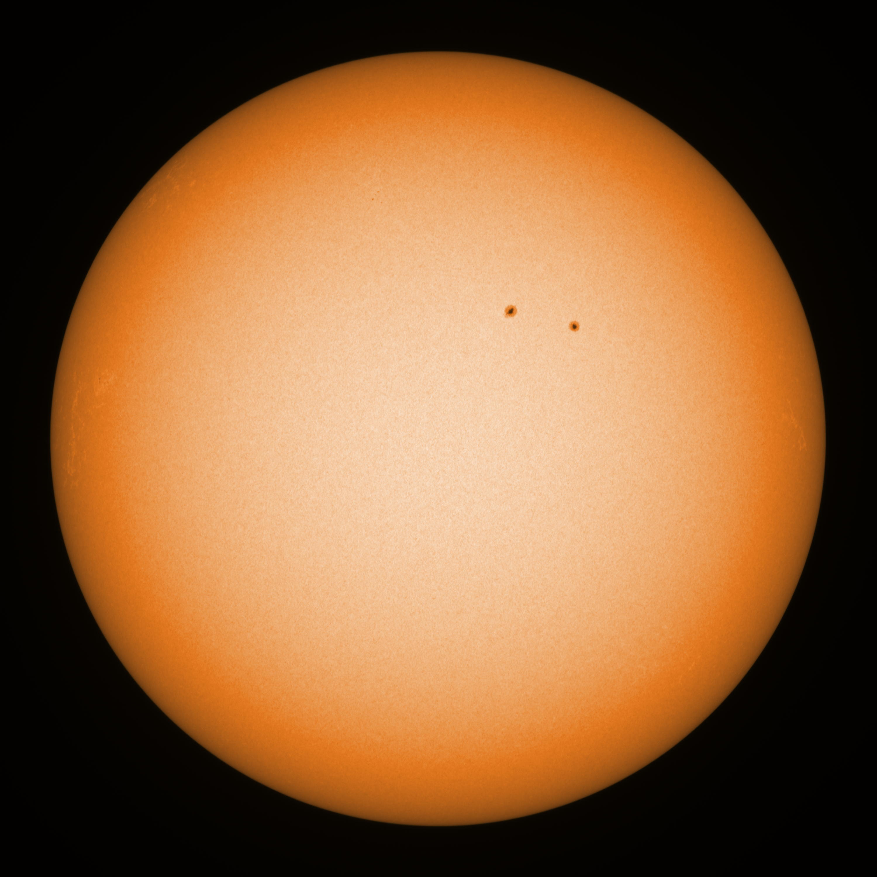 Observation date/time: 27 February 12:11 UTC Telescope: GTT60 (Galileo Type Telescope) Focal length: 1490mm (plano convex singlet) Aperture: 60mm Stop: 30mm Eyepiece: -75mm (plano concave singlet, 24mm aperture) Observation type: projection (343mm distance, 80mm diameter) Reference: Earth's rotation axis Exposure (transparency): 0.160ms Seeing (SSSMon): 2.5 - 3.0" =================================================================== Total number of sunspots: 2 | |
