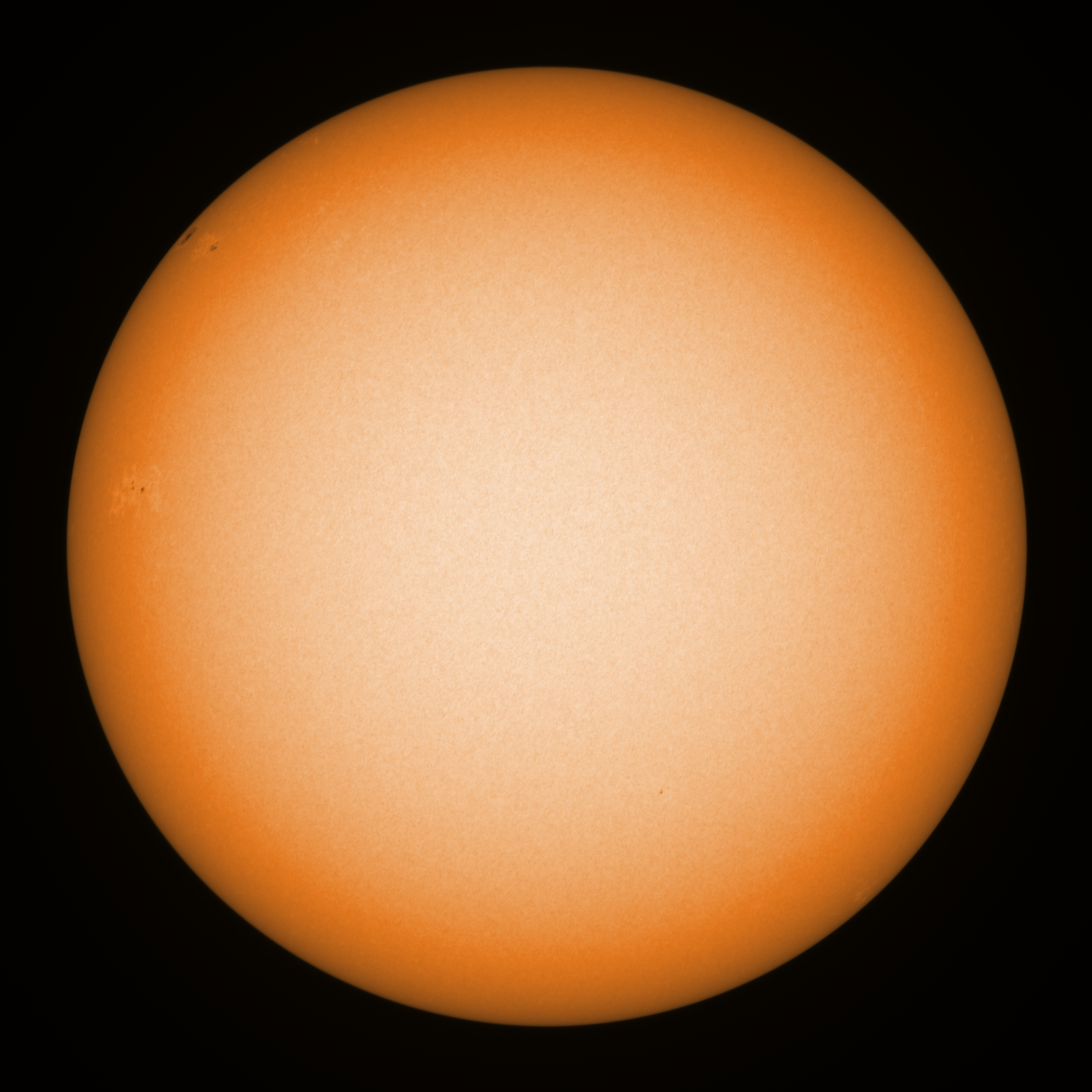 Observation date/time: 23 March 09:48 UTC Telescope: GTT60 (Galileo Type Telescope) Focal length: 1490mm (plano convex singlet) Aperture: 60mm Stop: 30mm Eyepiece: -75mm (plano concave singlet, 24mm aperture) Observation type: projection (343mm distance, 80mm diameter) Reference: Earth's rotation axis Exposure (transparency): 0.210ms Seeing (SSSMon): 5.5-7.0" =================================================================== Total number of sunspots: 6 | |