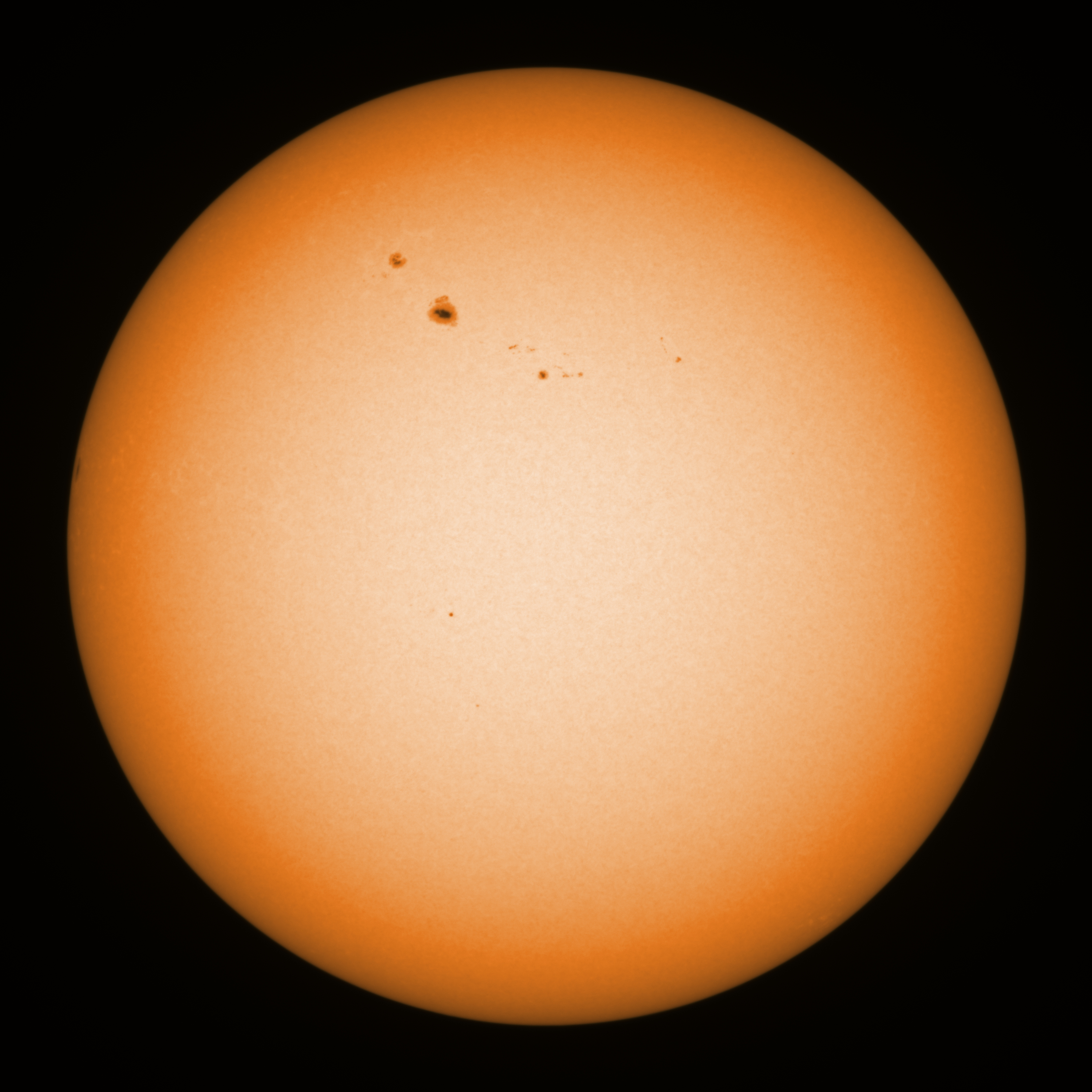 Observation date/time: 27 March 09:55 UTC Telescope: GTT60 (Galileo Type Telescope) Focal length: 1490mm (plano convex singlet) Aperture: 60mm Stop: 30mm Eyepiece: -75mm (plano concave singlet, 24mm aperture) Observation type: projection (343mm distance, 80mm diameter) Reference: Earth's rotation axis Exposure (transparency): 0.160ms Seeing (SSSMon): 5.5-6.0" =================================================================== Total number of sunspots: 17 | |