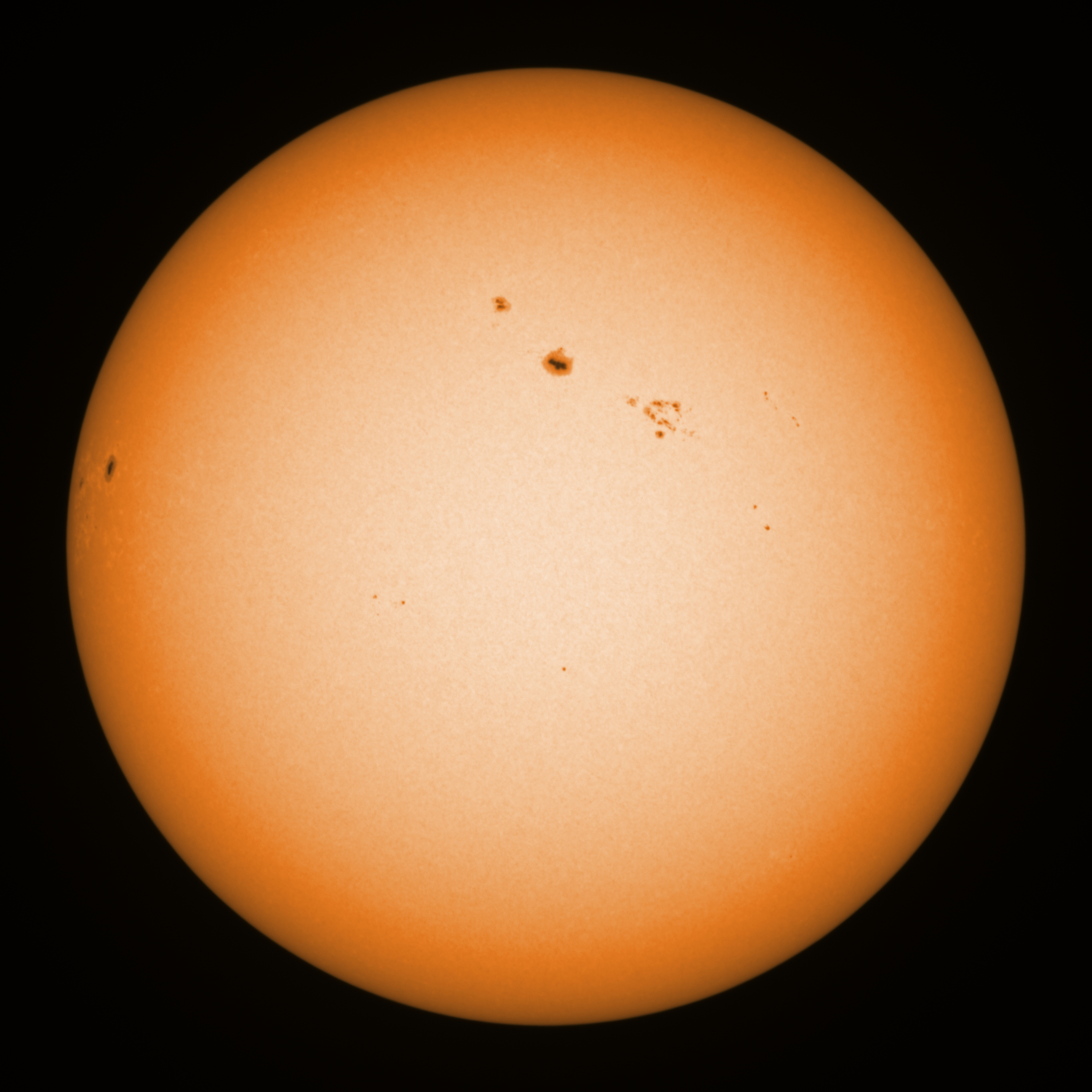 Observation date/time: 28 March 14:45 UTC Telescope: GTT60 (Galileo Type Telescope) Focal length: 1490mm (plano convex singlet) Aperture: 60mm Stop: 30mm Eyepiece: -75mm (plano concave singlet, 24mm aperture) Observation type: projection (343mm distance, 80mm diameter) Reference: Earth's rotation axis Exposure (transparency): 0.230ms Seeing (SSSMon): 6.0-8.5" =================================================================== Total number of sunspots: 28 | |