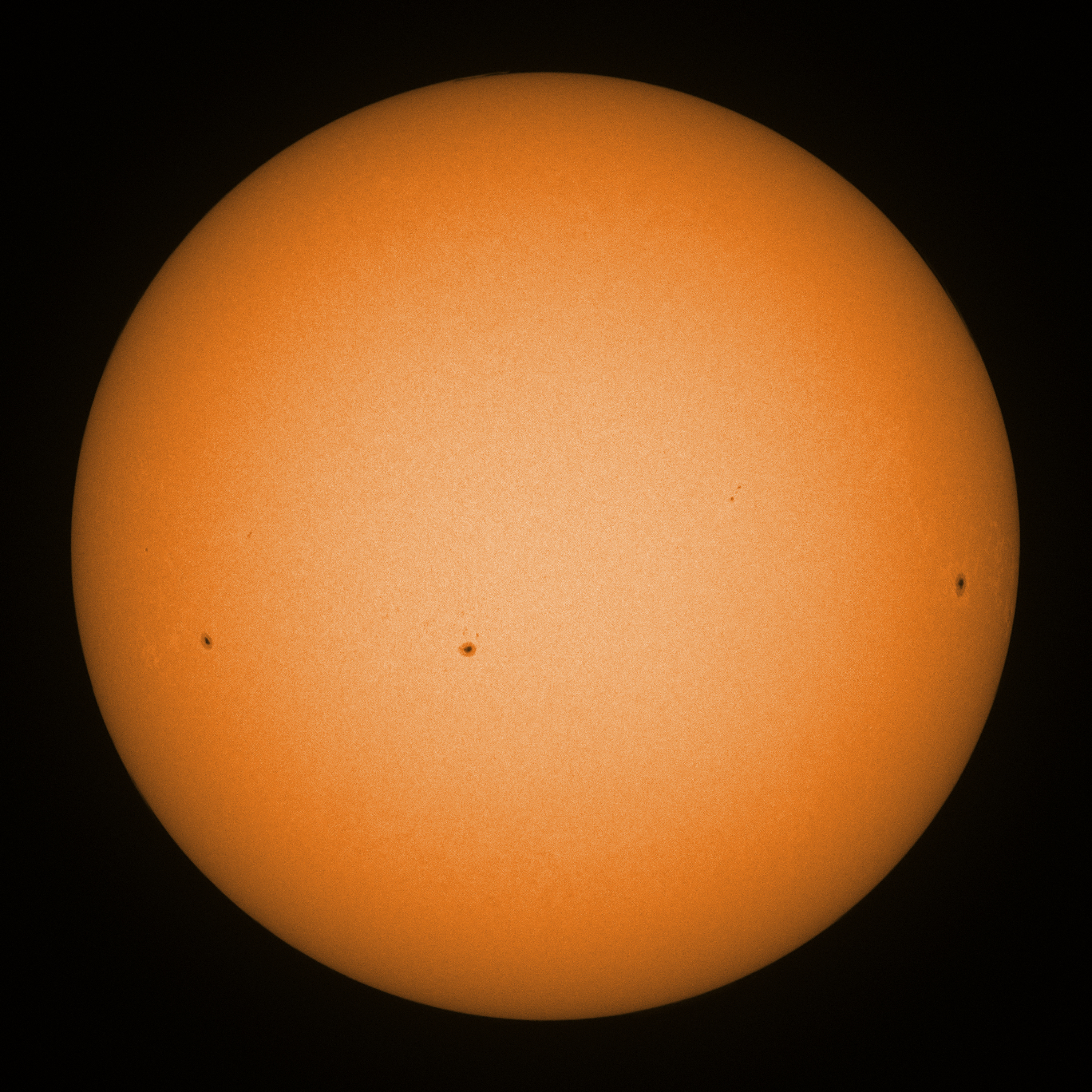 Observation date/time: 29 April 14:00 UTC Telescope: GTT60 (Galileo Type Telescope) Focal length: 1490mm (plano convex singlet) Aperture: 60mm Stop: 30mm Eyepiece: -75mm (plano concave singlet, 24mm aperture) Observation type: projection (346mm distance, 80mm diameter) Reference: Earth's rotation axis Exposure (transparency): 0.230ms Seeing (SSSMon): 6.0-8.0" =================================================================== Total number of sunspots: 8 | |