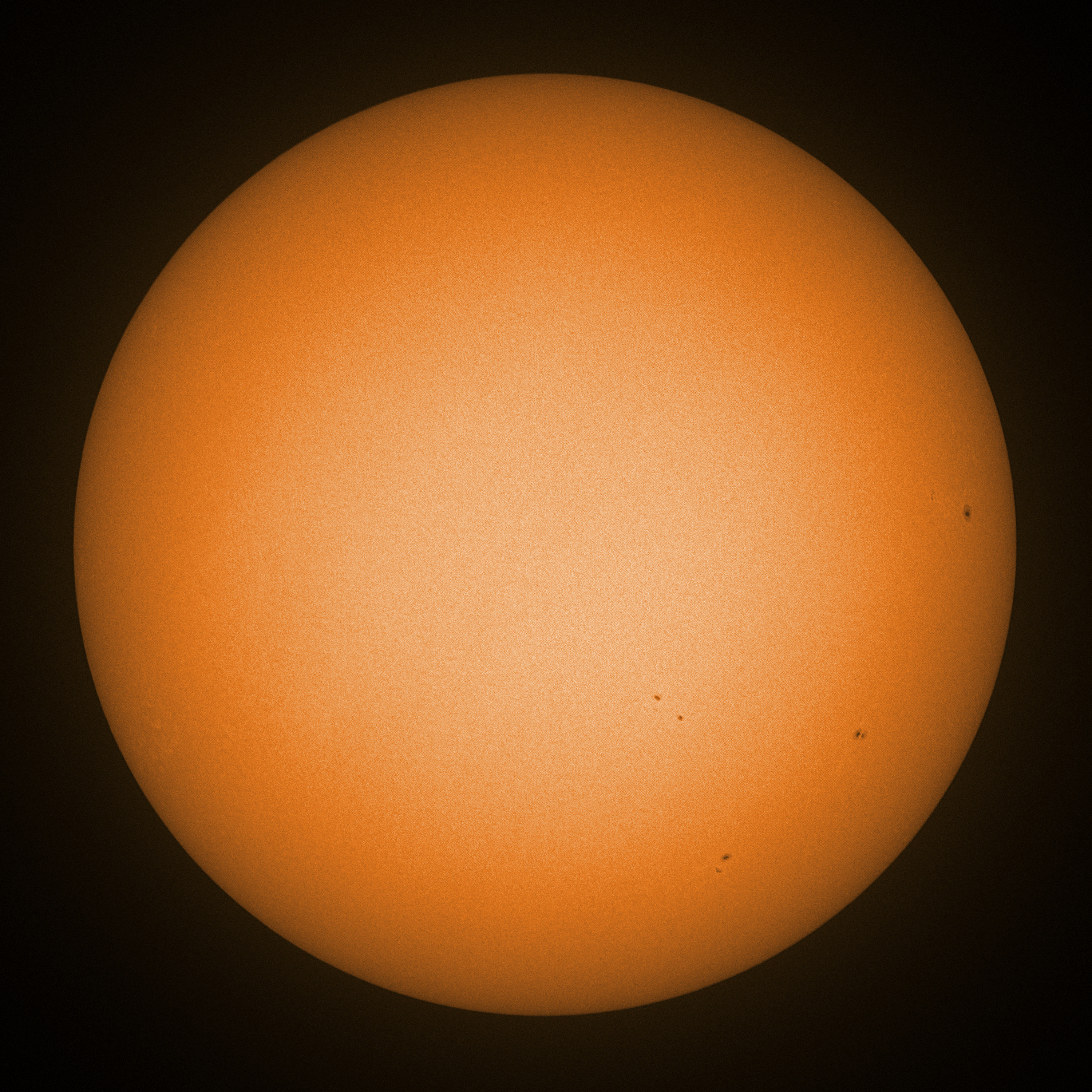 Observation date/time: 03 June 17:42 UTC Telescope: GTT60 (Galileo Type Telescope) Focal length: 1490mm (plano convex singlet) Aperture: 60mm Stop: 30mm Eyepiece: -75mm (plano concave singlet, 24mm aperture) Observation type: projection (349mm distance, 80mm diameter) Reference: Earth's rotation axis Exposure (transparency): 0.520ms Seeing (SSSMon): 5.0-5.5" =================================================================== Total number of sunspots: 7 | |