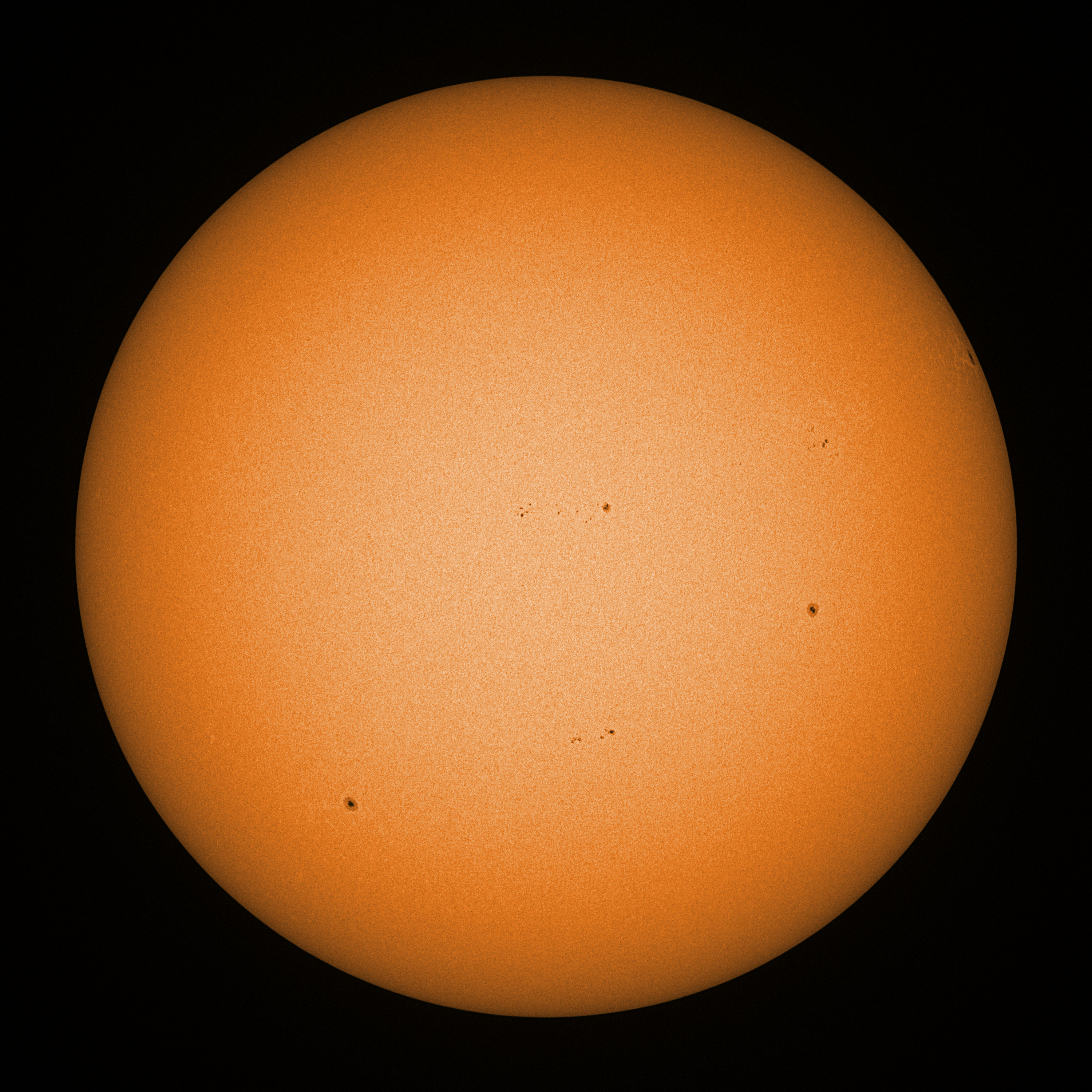 Observation date/time: 23 July 07:55 UTC Telescope: GTT60 (Galileo Type Telescope) Focal length: 1490mm (plano convex singlet) Aperture: 60mm Stop: 30mm Eyepiece: -75mm (plano concave singlet, 24mm aperture) Observation type: projection (349mm distance, 80mm diameter) Reference: Earth's rotation axis Exposure (transparency): 0.210ms Seeing (SSSMon): 2.5-5.5" =================================================================== Total number of sunspots: 21 | |