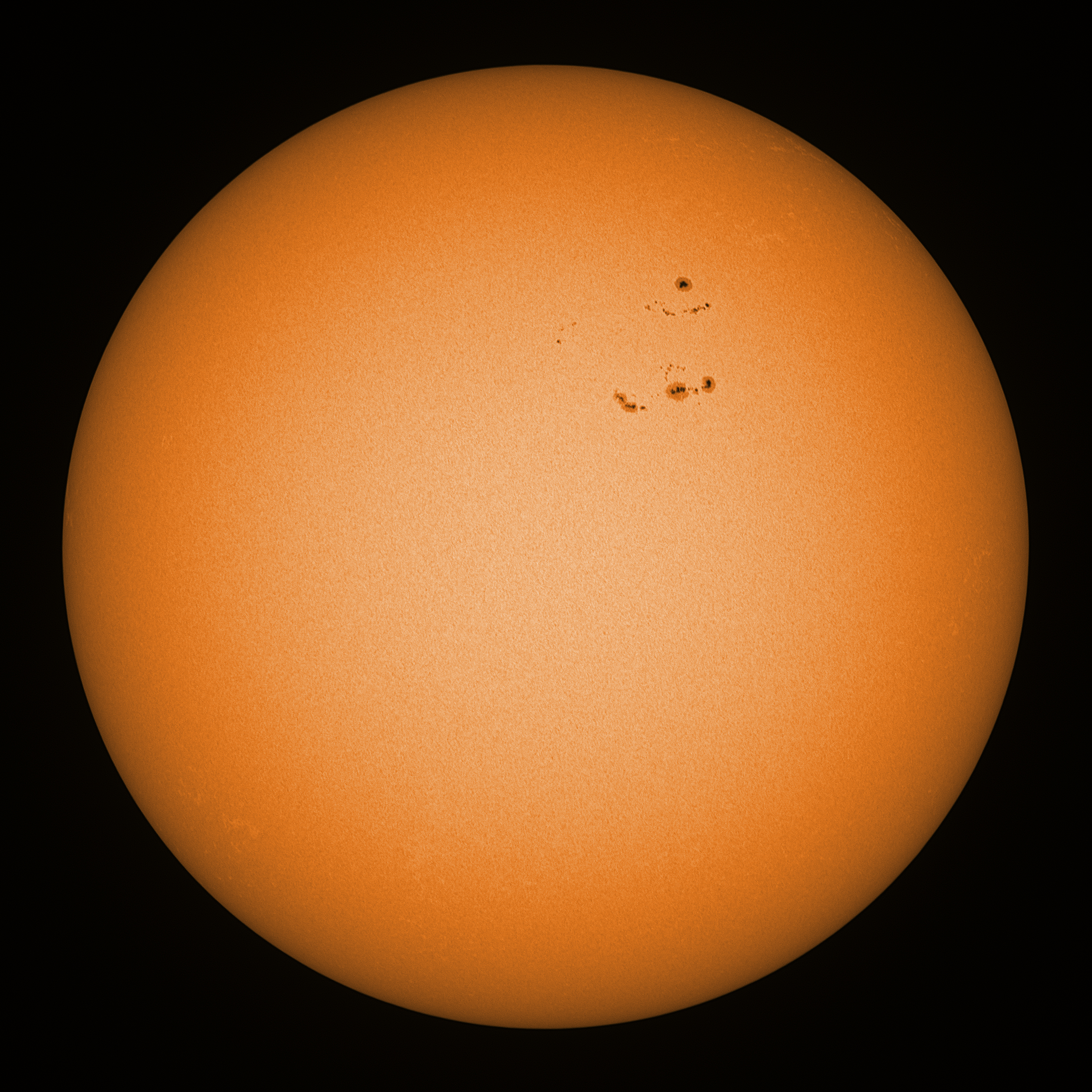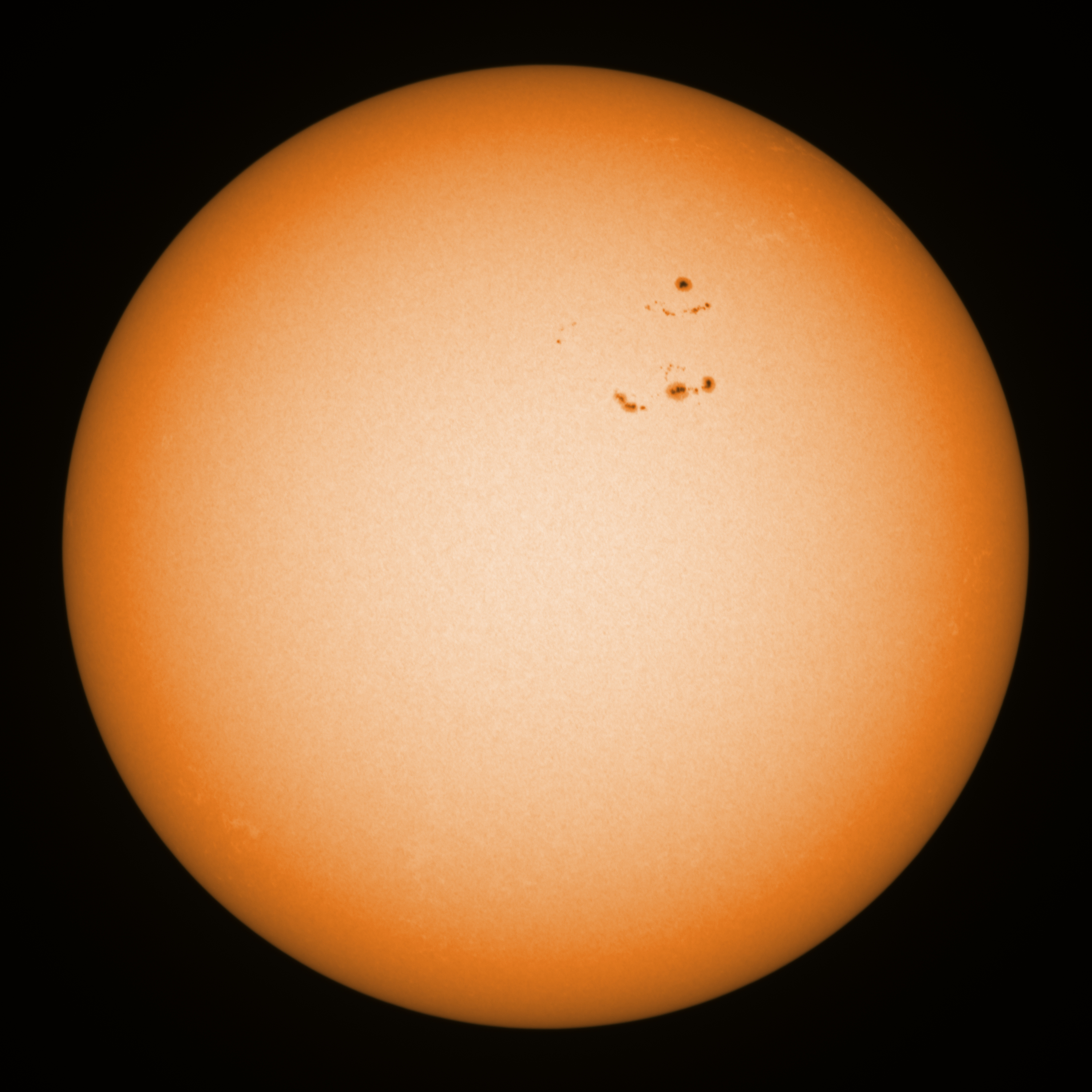 Observation date/time: 12 November 12:44 UTC Telescope: GTT60 (Galileo Type Telescope) Focal length: 1490mm (plano convex singlet) Aperture: 60mm Stop: 30mm Eyepiece: -75mm (plano concave singlet, 24mm aperture) Observation type: projection (343mm distance, 80mm diameter) Reference: Earth's rotation axis Exposure (transparency): 0.190ms Seeing (SSSMon): 2.5-3.0" (2.0" at best) =================================================================== Total number of sunspots: 21 | |