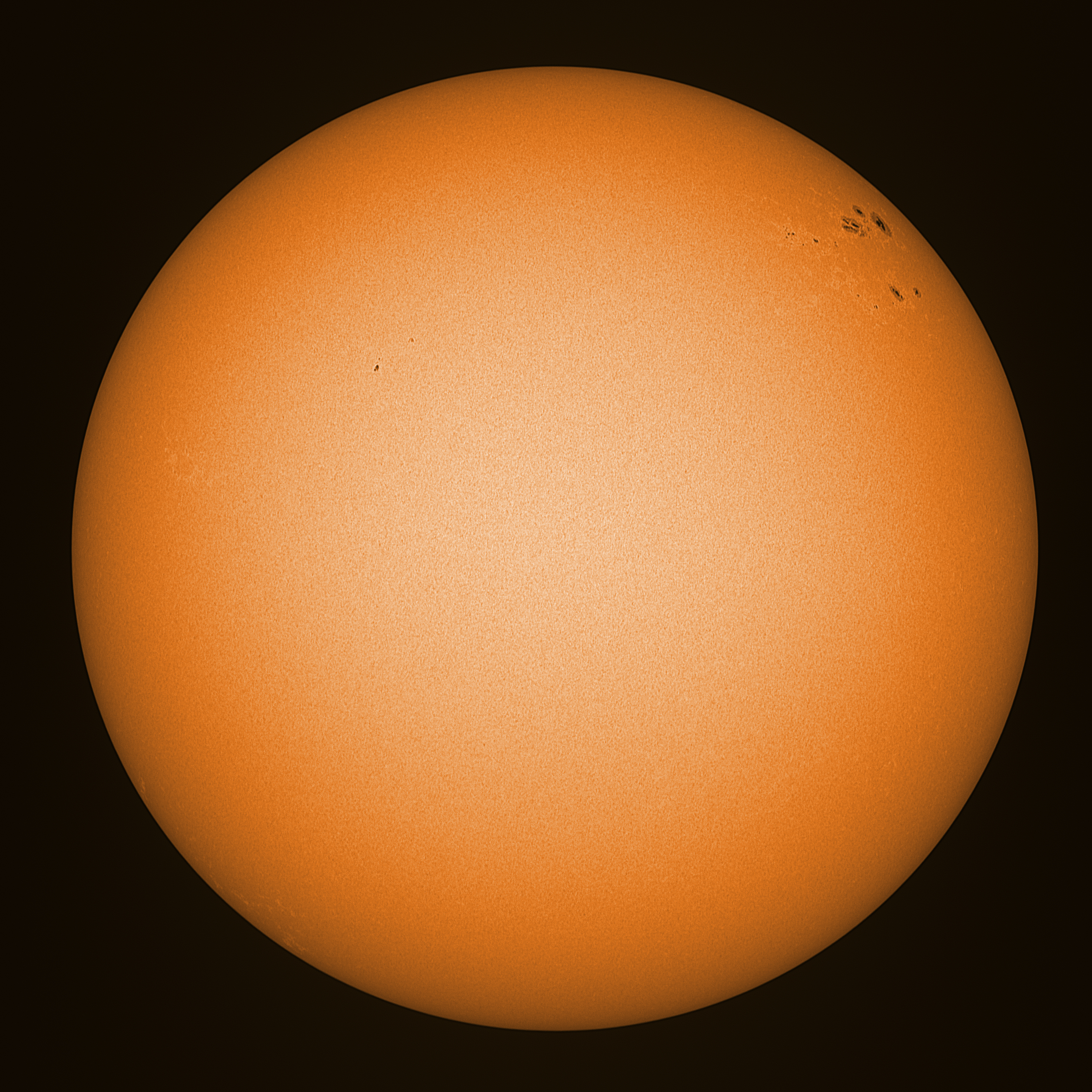 Observation date/time: 15 November 11:24 UTC Telescope: GTT60 (Galileo Type Telescope) Focal length: 1490mm (plano convex singlet) Aperture: 60mm Stop: 30mm Eyepiece: -75mm (plano concave singlet, 24mm aperture) Observation type: projection (343mm distance, 80mm diameter) Reference: Earth's rotation axis Exposure (transparency): 0.240ms Seeing (SSSMon): 1.5-2.0" (1.0" at best) =================================================================== Total number of sunspots: 14 | |
