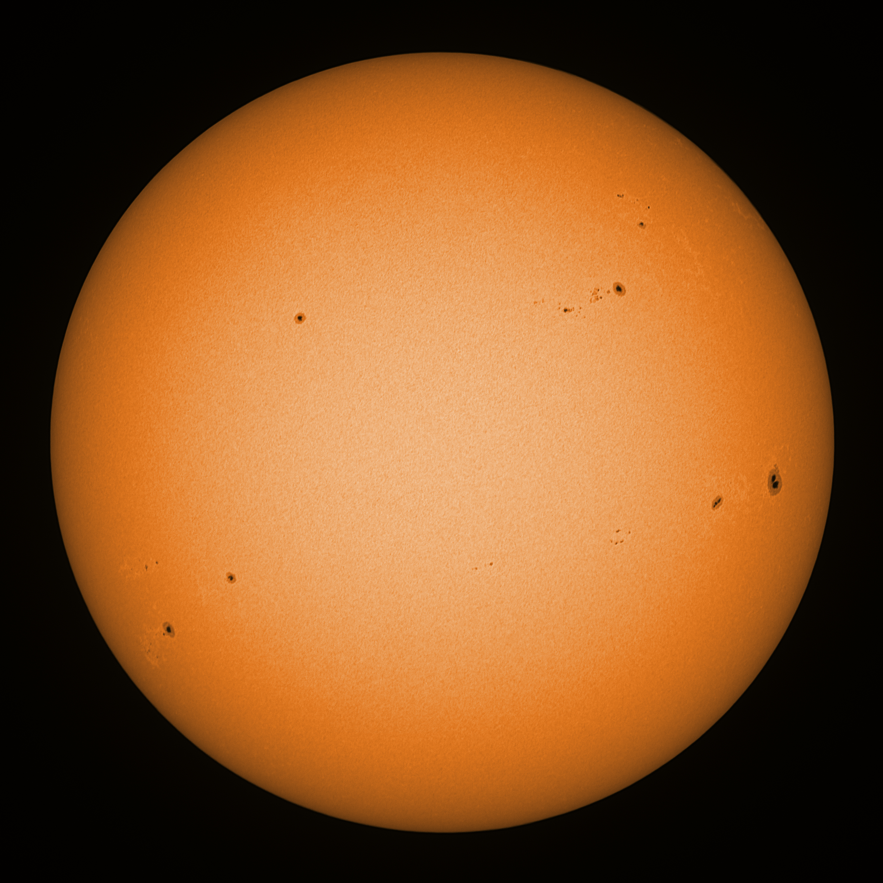 Observation date/time: 11 December 10:16 UTC Telescope: GTT60 (Galileo Type Telescope) Focal length: 1490mm (plano convex singlet) Aperture: 60mm Stop: 30mm Eyepiece: -75mm (plano concave singlet, 24mm aperture) Observation type: projection (340mm distance, 80mm diameter) Reference: Earth's rotation axis Exposure (transparency): 0.372ms Seeing (SSSMon): 2.0-2.5" (1.5" at best) =================================================================== Total number of sunspots: 34 | |