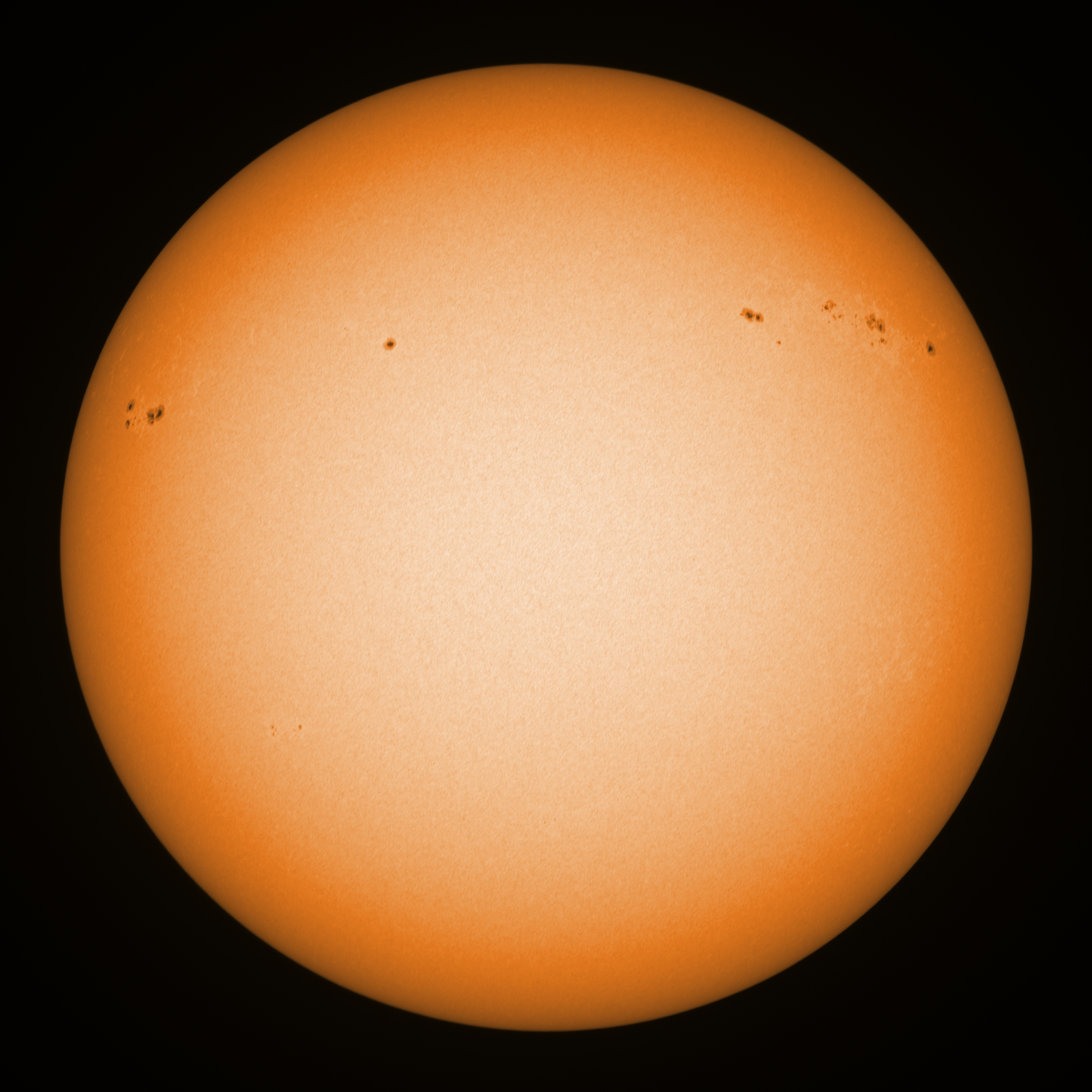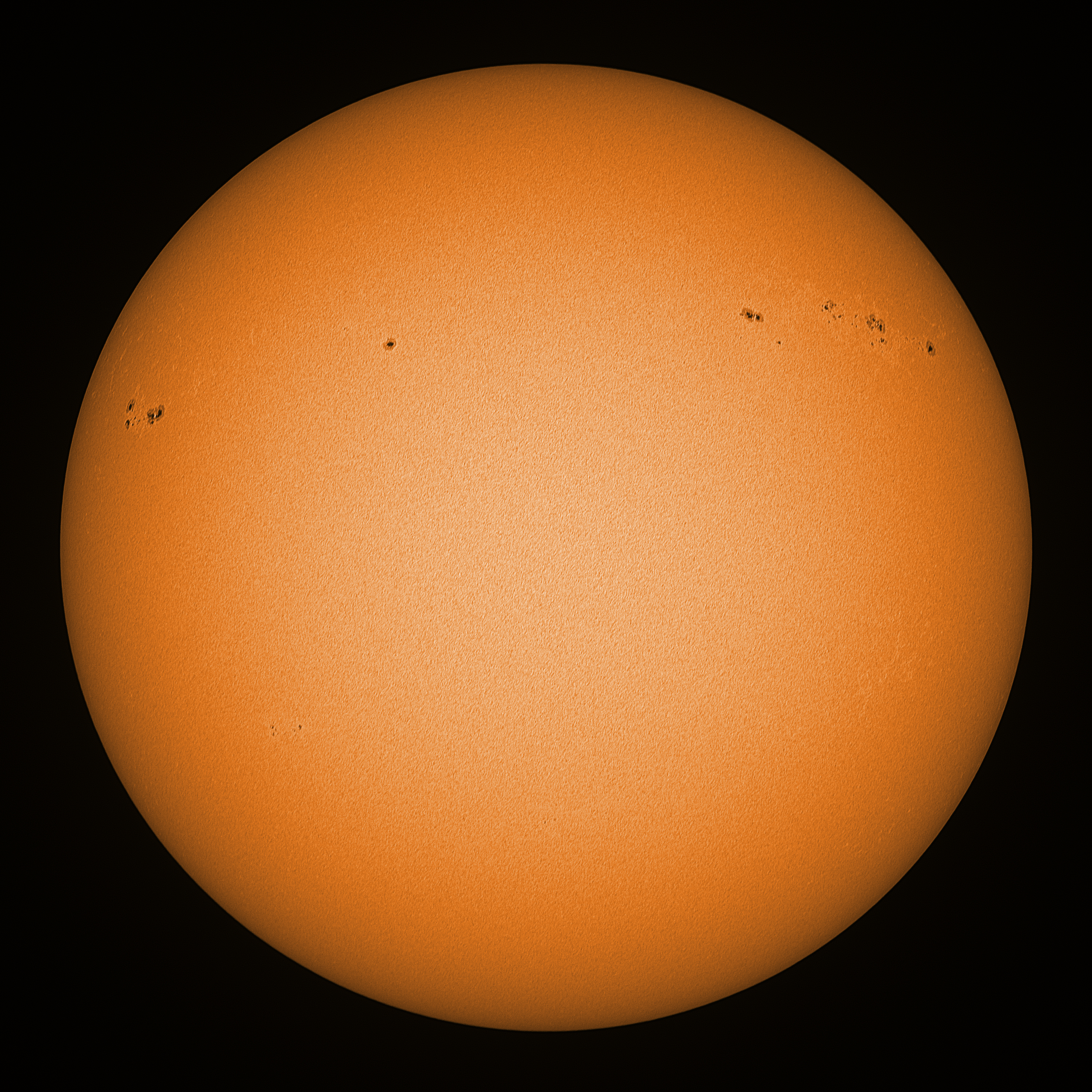 Observation date/time: 27 December 10:31 UTC Telescope: GTT60 (Galileo Type Telescope) Focal length: 1490mm (plano convex singlet) Aperture: 60mm Stop: 30mm Eyepiece: -75mm (plano concave singlet, 24mm aperture) Observation type: projection (340mm distance, 80mm diameter) Reference: Earth's rotation axis Exposure (transparency): 0.260ms Seeing (SSSMon): 1.0-1.5" (0.8" at best) =================================================================== Total number of sunspots: 24 | |