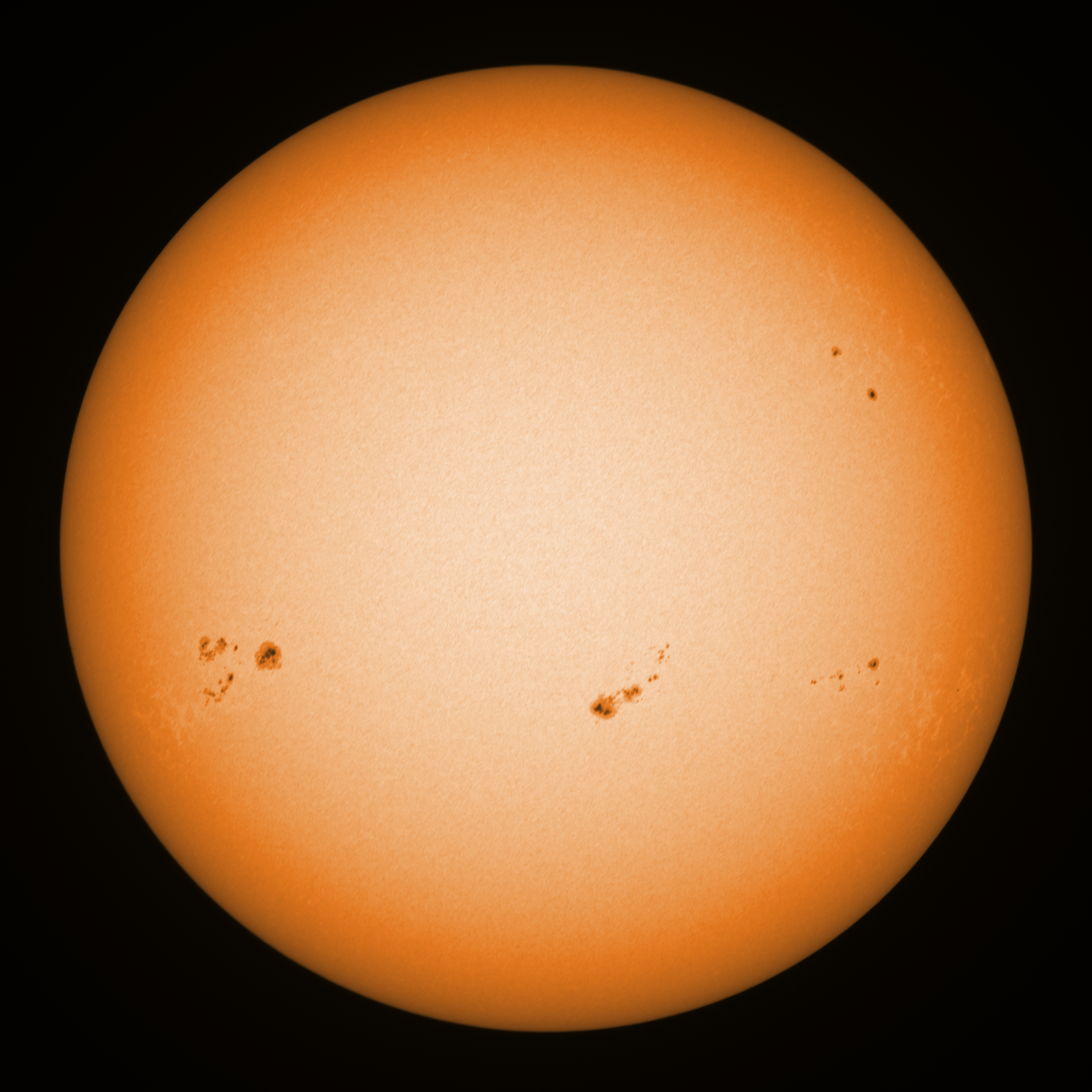Observation date/time: 08 January 10:03 UTC Telescope: GTT60 (Galileo Type Telescope) Focal length: 1490mm (plano convex singlet) Aperture: 60mm Stop: 30mm Eyepiece: -75mm (plano concave singlet, 24mm aperture) Observation type: projection (340mm distance, 80mm diameter) Reference: Earth's rotation axis Exposure (transparency): 0.280ms Seeing (SSSMon): 1.2" (0.8" at best) =================================================================== Total number of sunspots: 39 | |