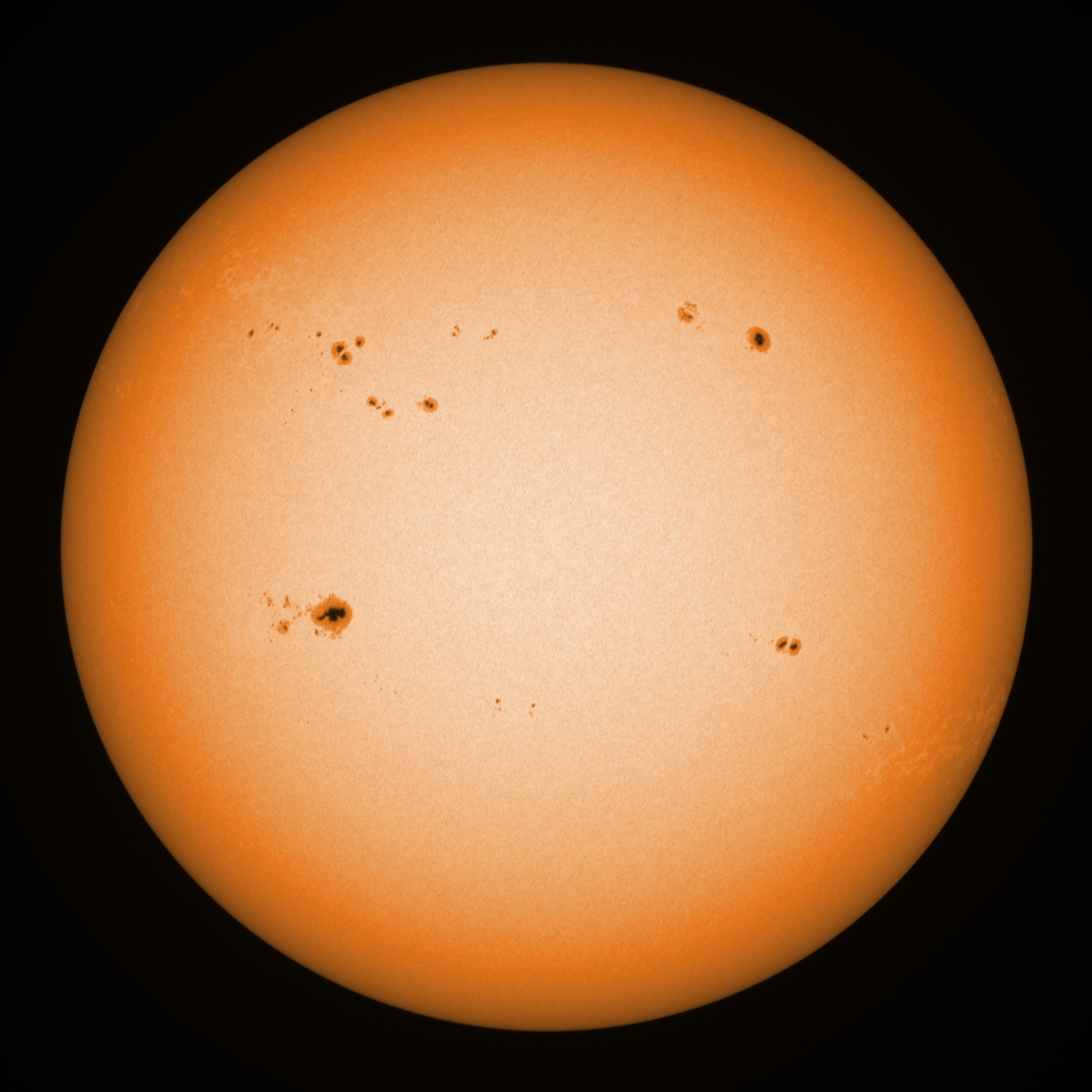 Observation date/time: 17 January 10:49 UTC Telescope: GTT60 (Galileo Type Telescope) Focal length: 1490mm (plano convex singlet) Aperture: 60mm Stop: 30mm Eyepiece: -75mm (plano concave singlet, 24mm aperture) Observation type: projection (340mm distance, 80mm diameter) Reference: Earth's rotation axis Exposure (transparency): 0.200ms Seeing (SSSMon): 2.0-2.5" (1.5" at best) =================================================================== Total number of sunspots: 53 | |