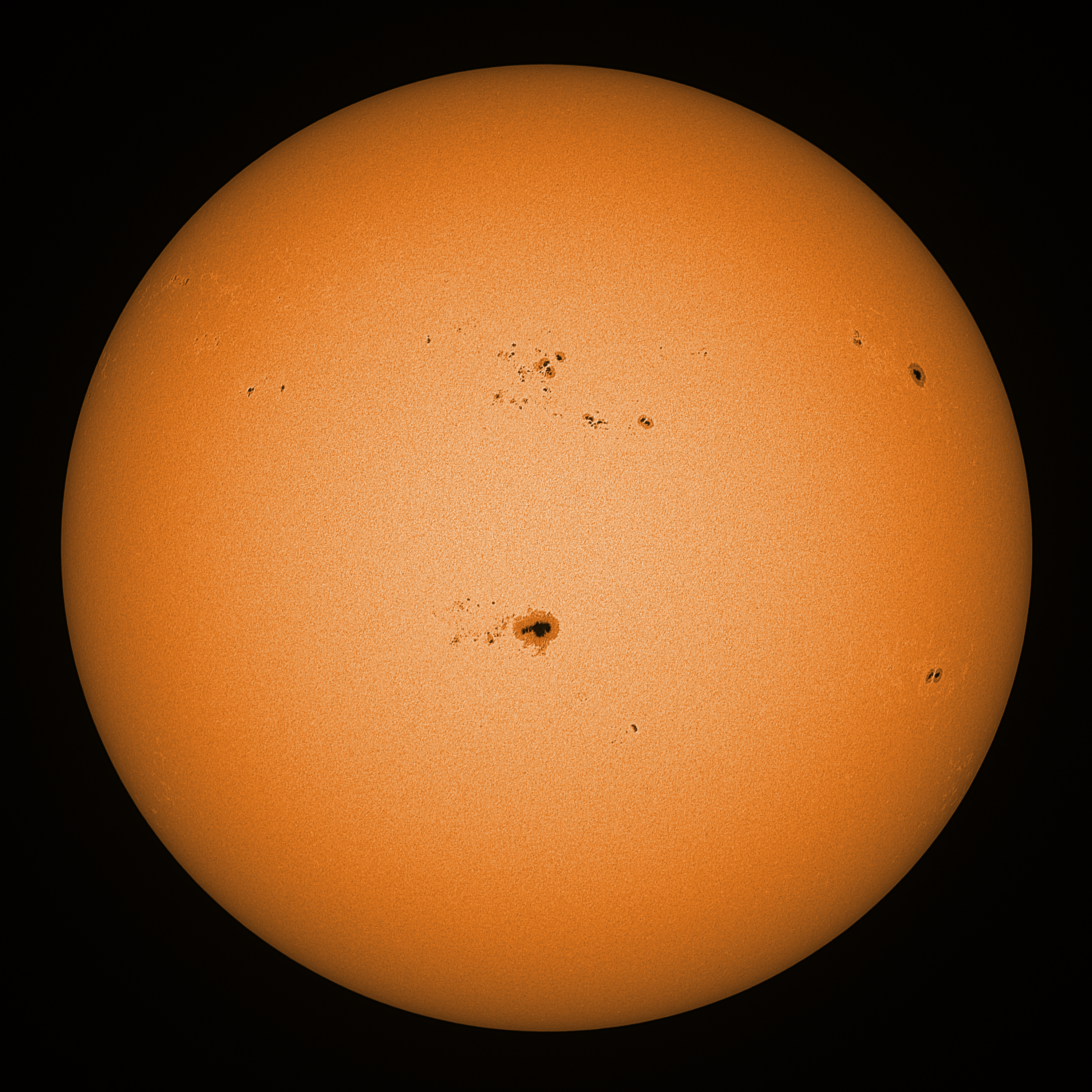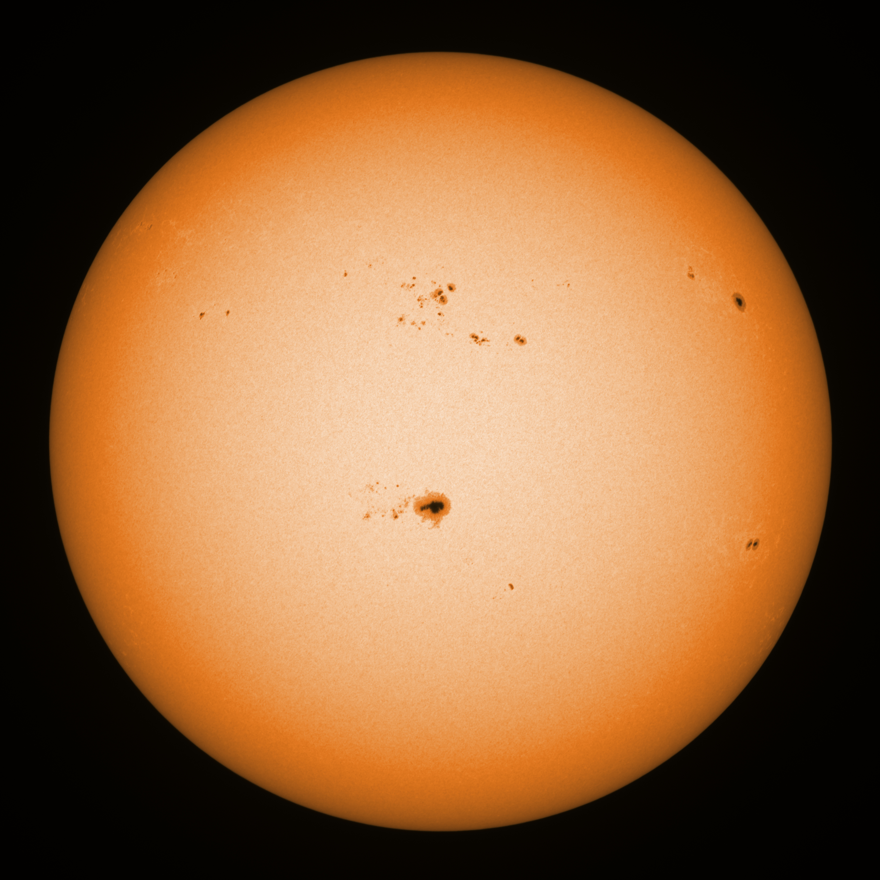 Observation date/time: 19 January 09:46 UTC Telescope: GTT60 (Galileo Type Telescope) Focal length: 1490mm (plano convex singlet) Aperture: 60mm Stop: 30mm Eyepiece: -75mm (plano concave singlet, 24mm aperture) Observation type: projection (341mm distance, 80mm diameter) Reference: Earth's rotation axis Exposure (transparency): 0.750ms (using 82nm bandwidth green filter) Seeing (SSSMon): 2.0-2.5" (1.5" at best) =================================================================== Total number of sunspots: 64 | |