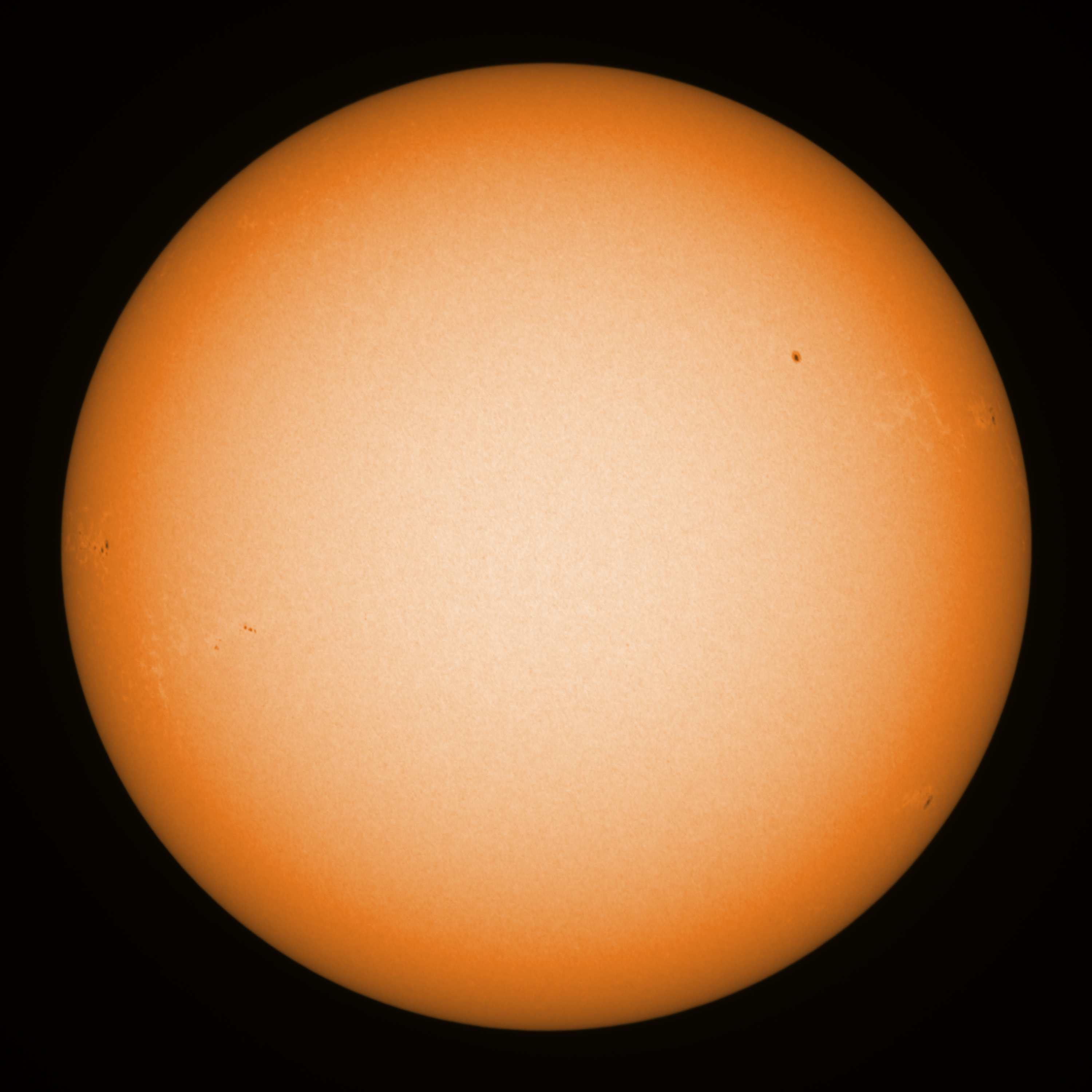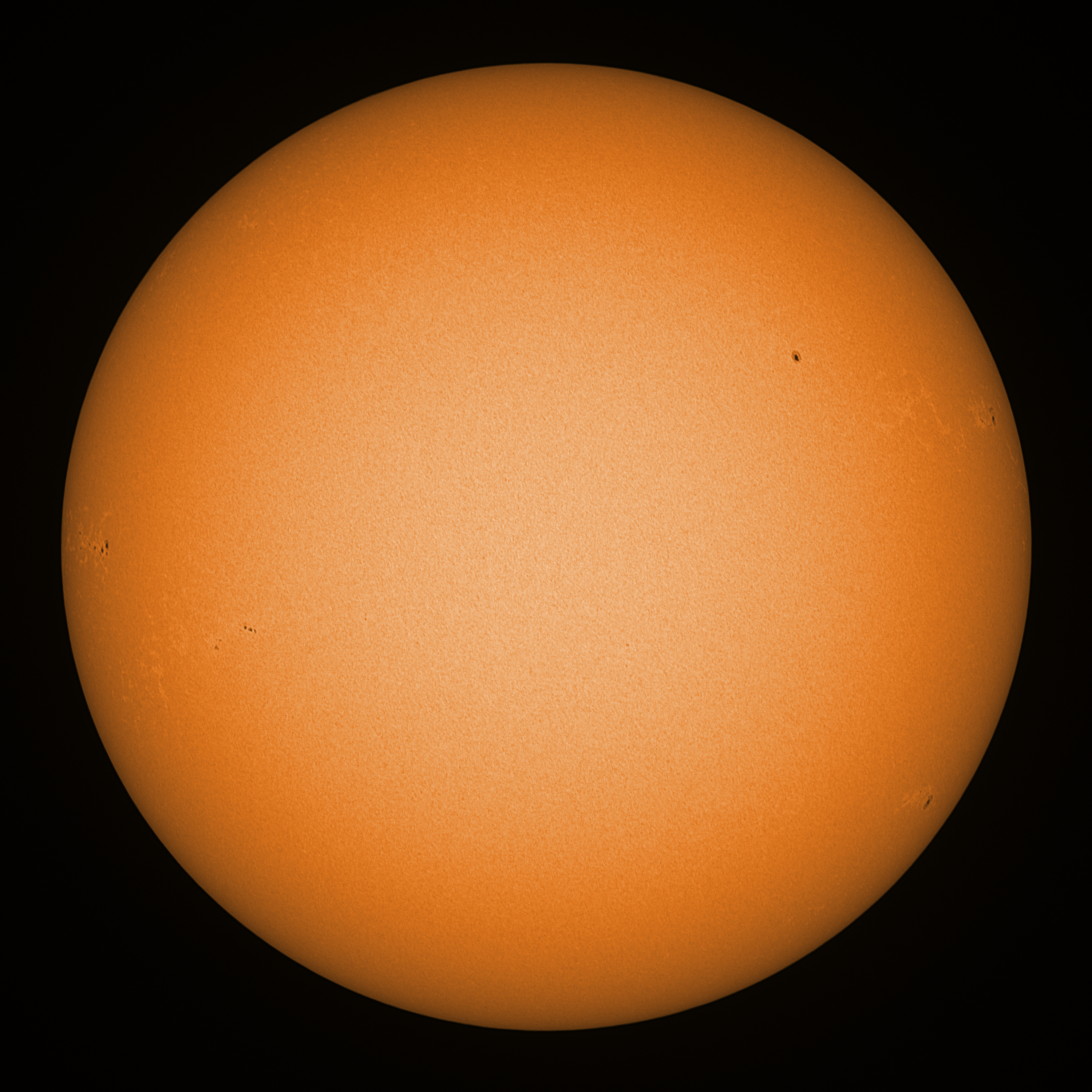 Observation date/time: 31 January 11:36 UTC Telescope: GTT60 (Galileo Type Telescope) Focal length: 1490mm (plano convex singlet) Aperture: 60mm Stop: 30mm Eyepiece: -75mm (plano concave singlet, 24mm aperture) Observation type: projection (341mm distance, 80mm diameter) Reference: Earth's rotation axis Exposure (transparency): 0.700ms (using 82nm bandwidth green filter) Seeing (SSSMon): 2.5-4.0" (1.5" at best) =================================================================== Total number of sunspots: 10 | |