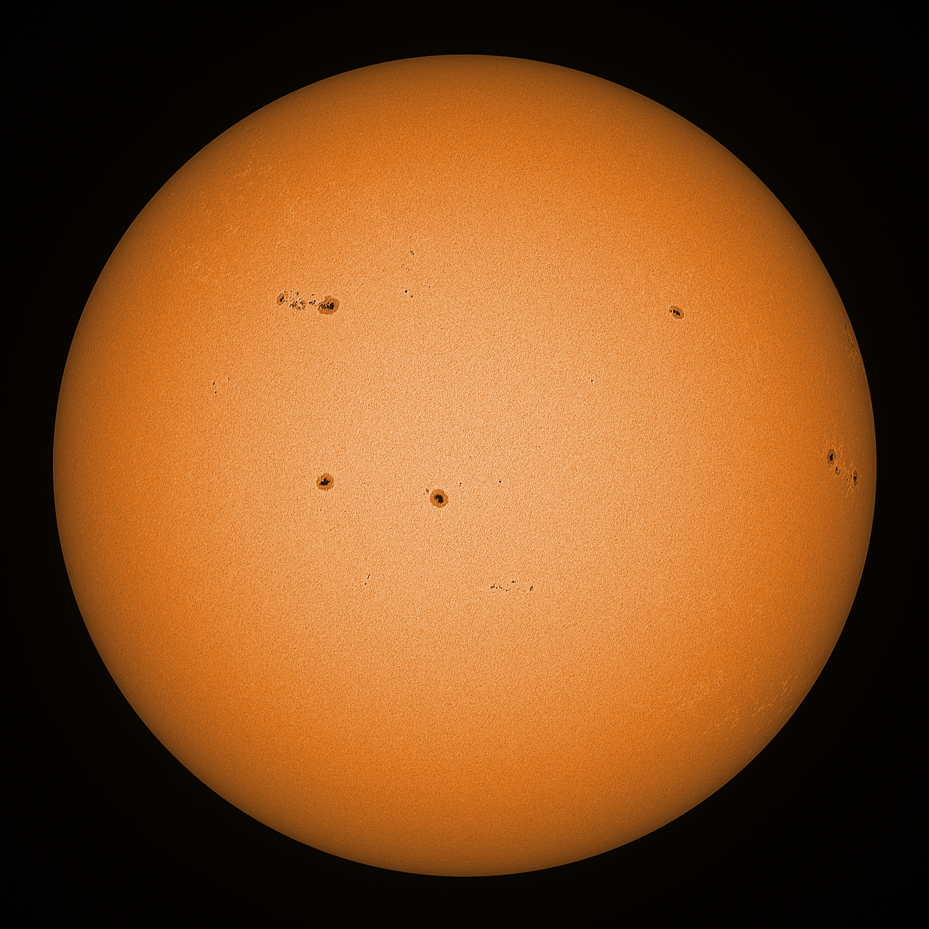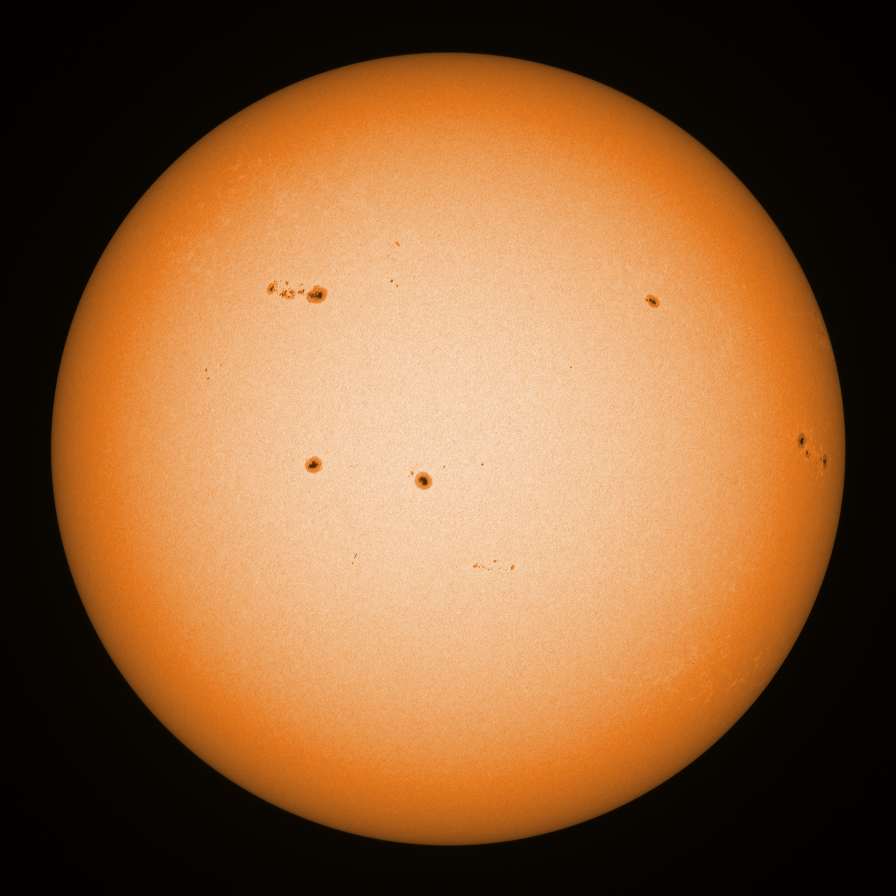 Observation date/time: 14 February 10:20 UTC Telescope: GTT60 (Galileo Type Telescope) Focal length: 1490mm (plano convex singlet) Aperture: 60mm Stop: 30mm Eyepiece: -75mm (plano concave singlet, 24mm aperture) Observation type: projection (341mm distance, 80mm diameter) Reference: Earth's rotation axis Exposure (transparency): 0.700ms (using 82nm bandwidth green filter) Seeing (SSSMon): 1.5-2.0" (1.5" at best) =================================================================== Total number of sunspots: 38 | |