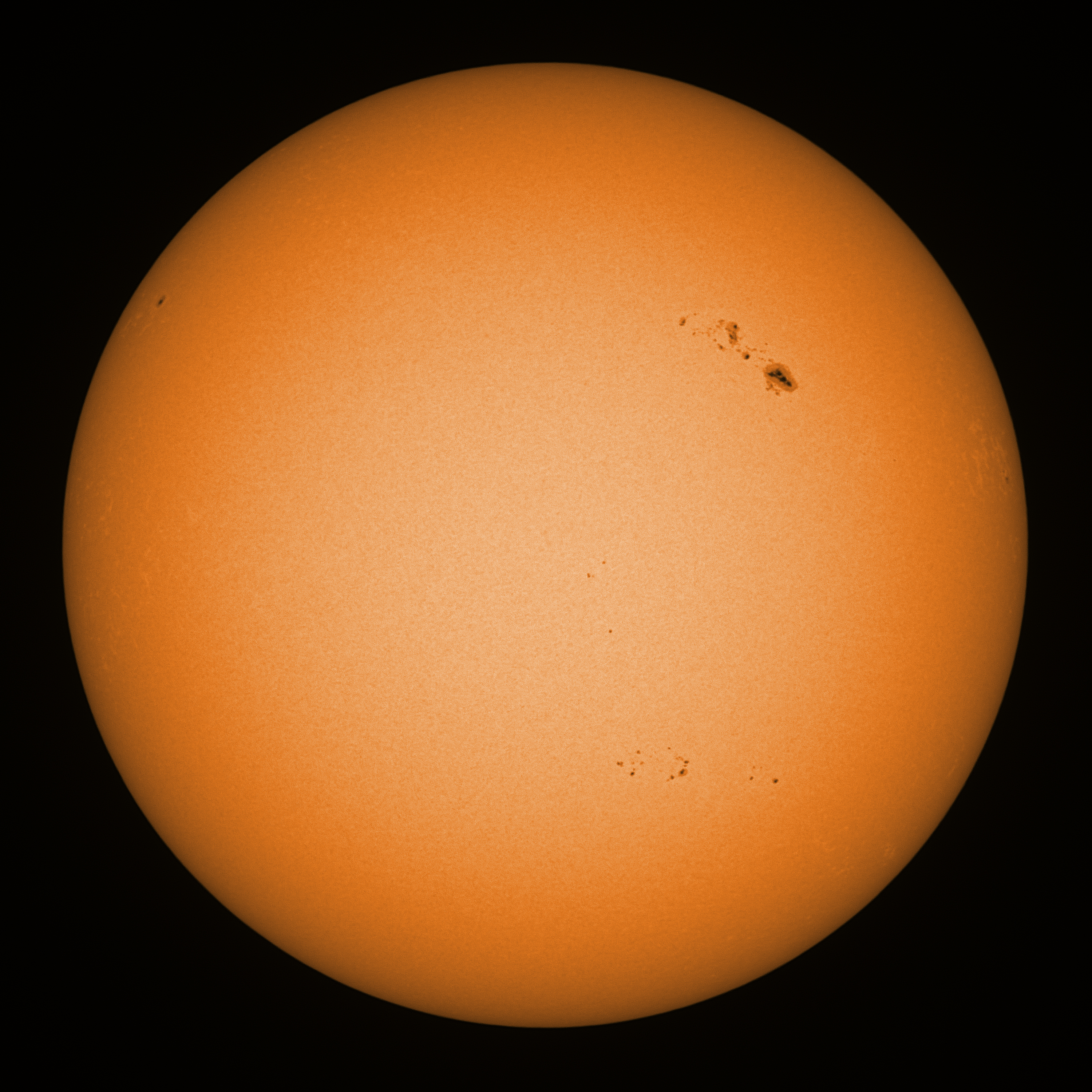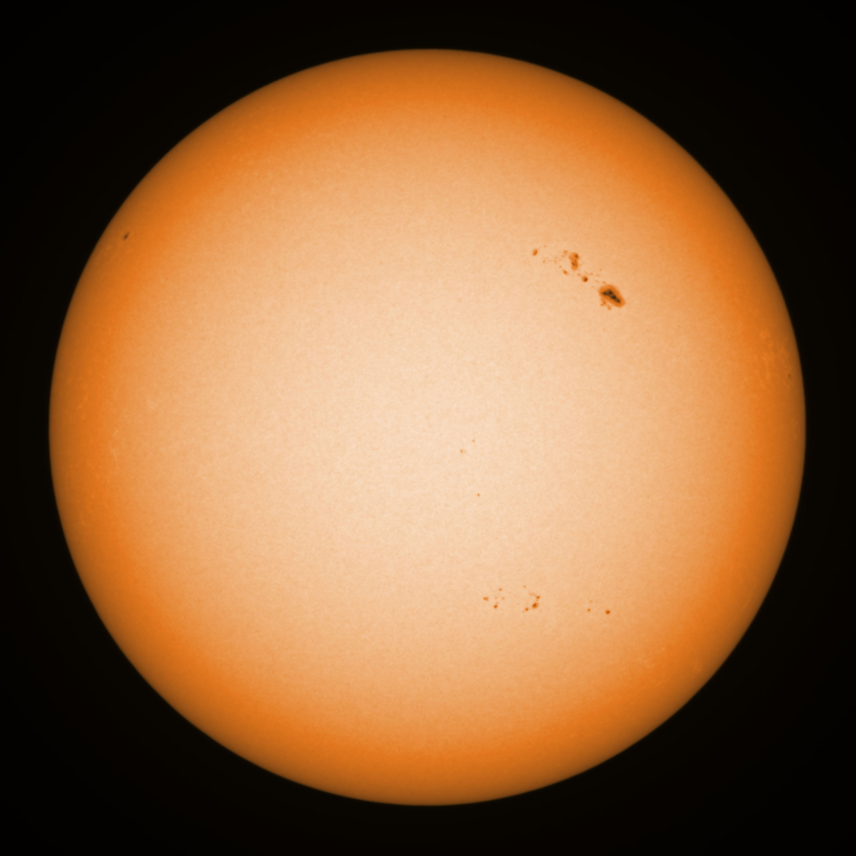 Observation date/time: 27 February 13:48 UTC Telescope: GTT60 (Galileo Type Telescope) Focal length: 1490mm (plano convex singlet) Aperture: 60mm Stop: 30mm Eyepiece: -75mm (plano concave singlet, 24mm aperture) Observation type: projection (341mm distance, 80mm diameter) Reference: Earth's rotation axis Exposure (transparency): 0.550ms (using 82nm bandwidth green filter) Seeing (SSSMon): 3.5-5.0" (3.0" at best) =================================================================== Total number of sunspots: 31 | |