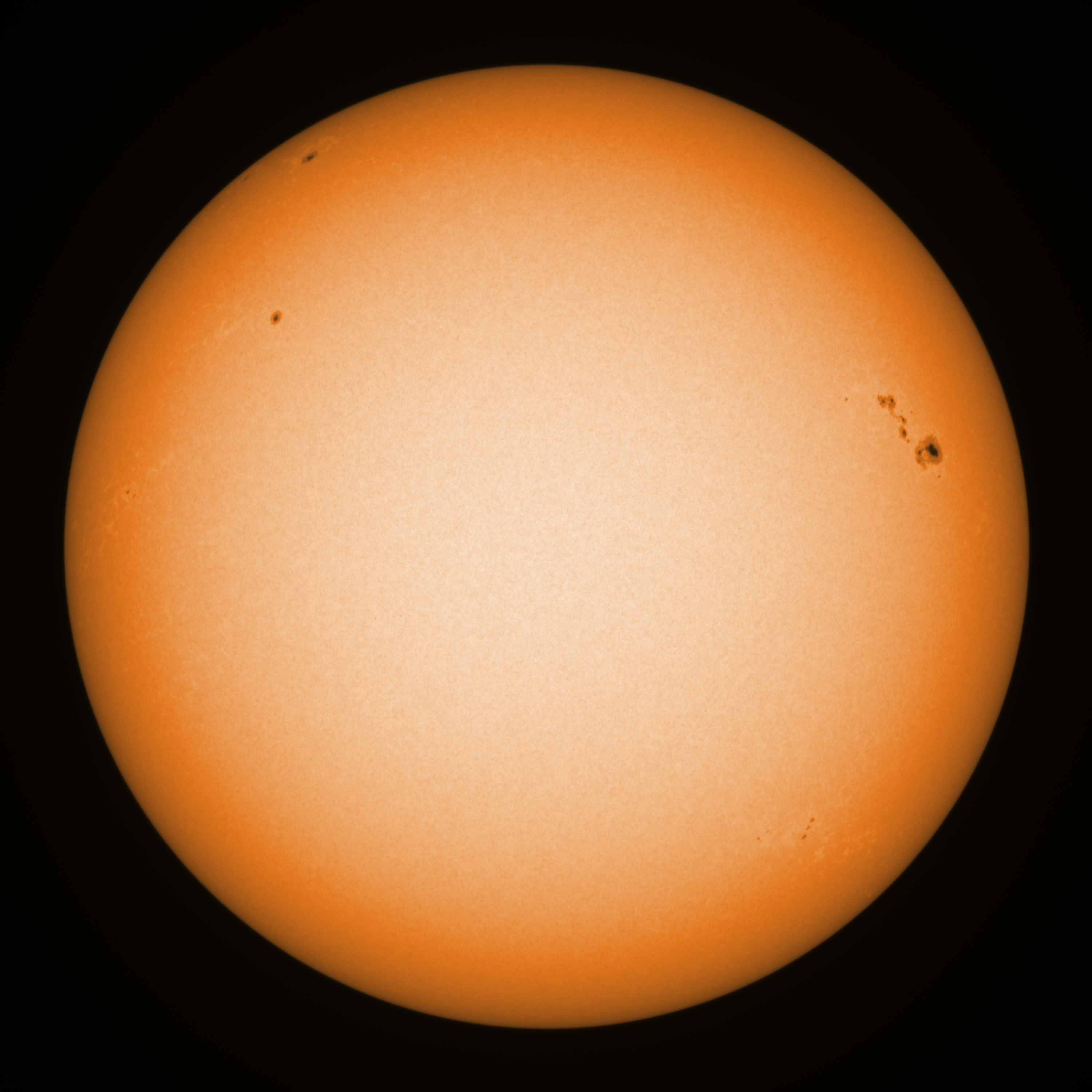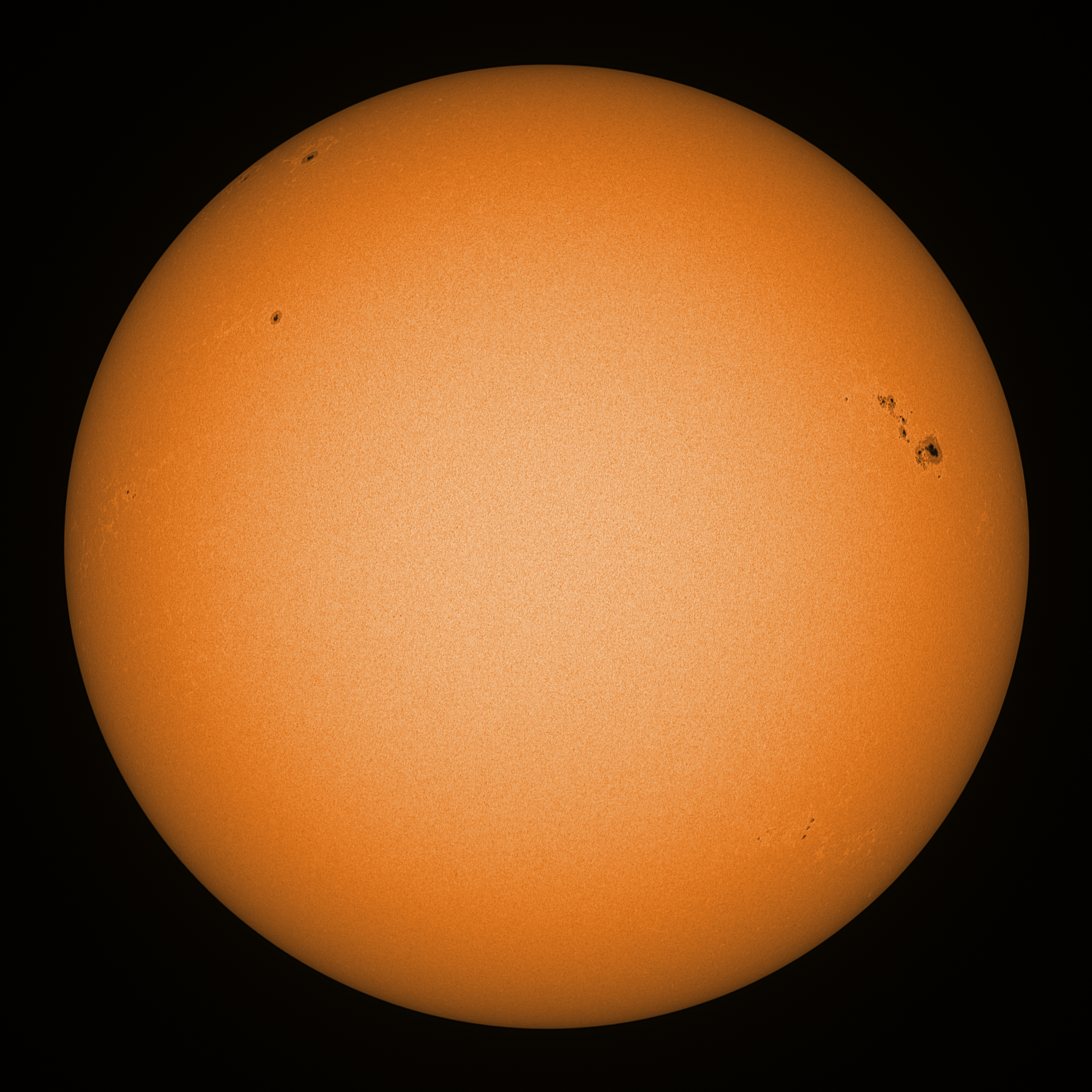 Observation date/time: 01 March 11:03 UTC Telescope: GTT60 (Galileo Type Telescope) Focal length: 1490mm (plano convex singlet) Aperture: 60mm Stop: 30mm Eyepiece: -75mm (plano concave singlet, 24mm aperture) Observation type: projection (341mm distance, 80mm diameter) Reference: Earth's rotation axis Exposure (transparency): 0.500ms (using 82nm bandwidth green filter) Seeing (SSSMon): 5.0-5.5" (3.5" at best) =================================================================== Total number of sunspots: 22 | |