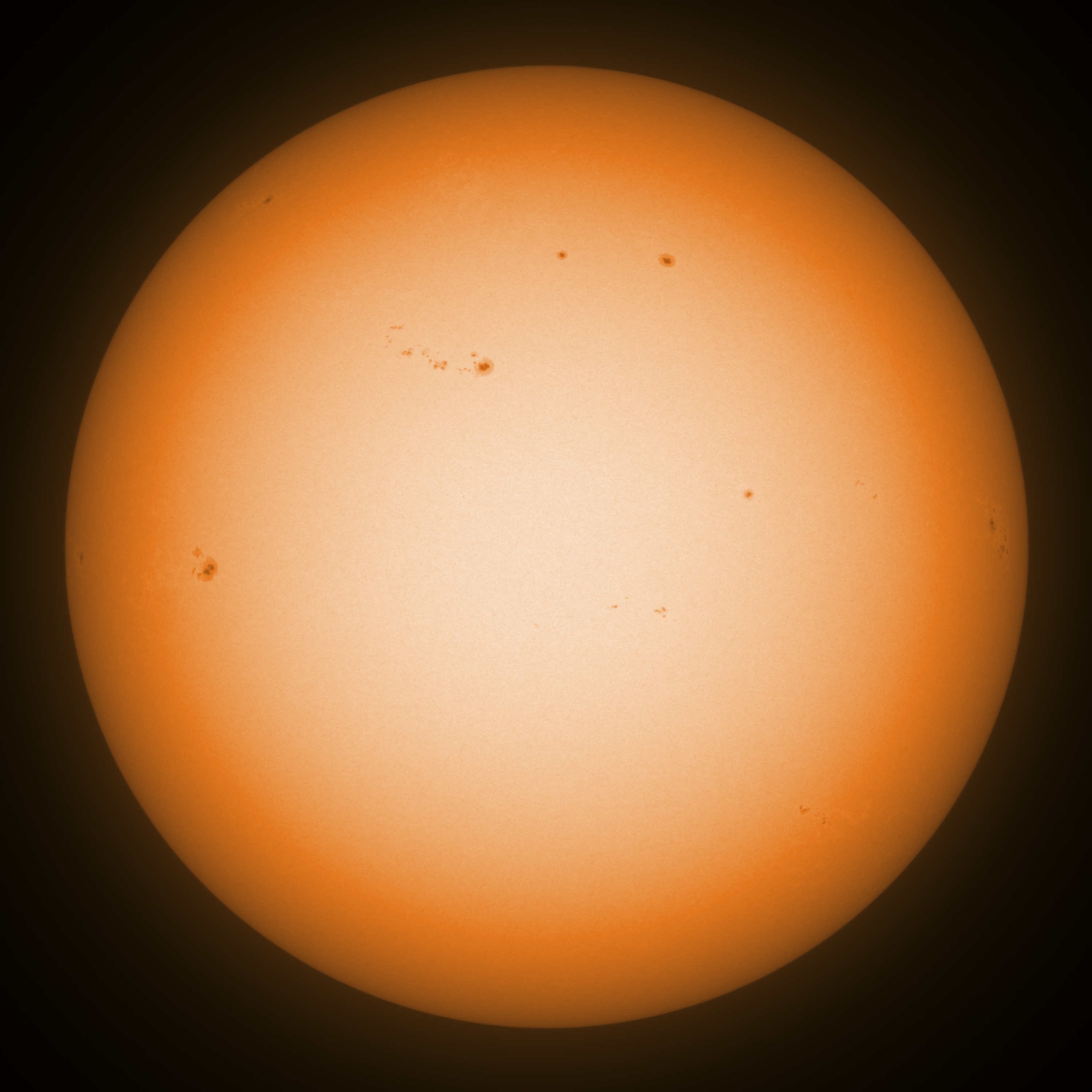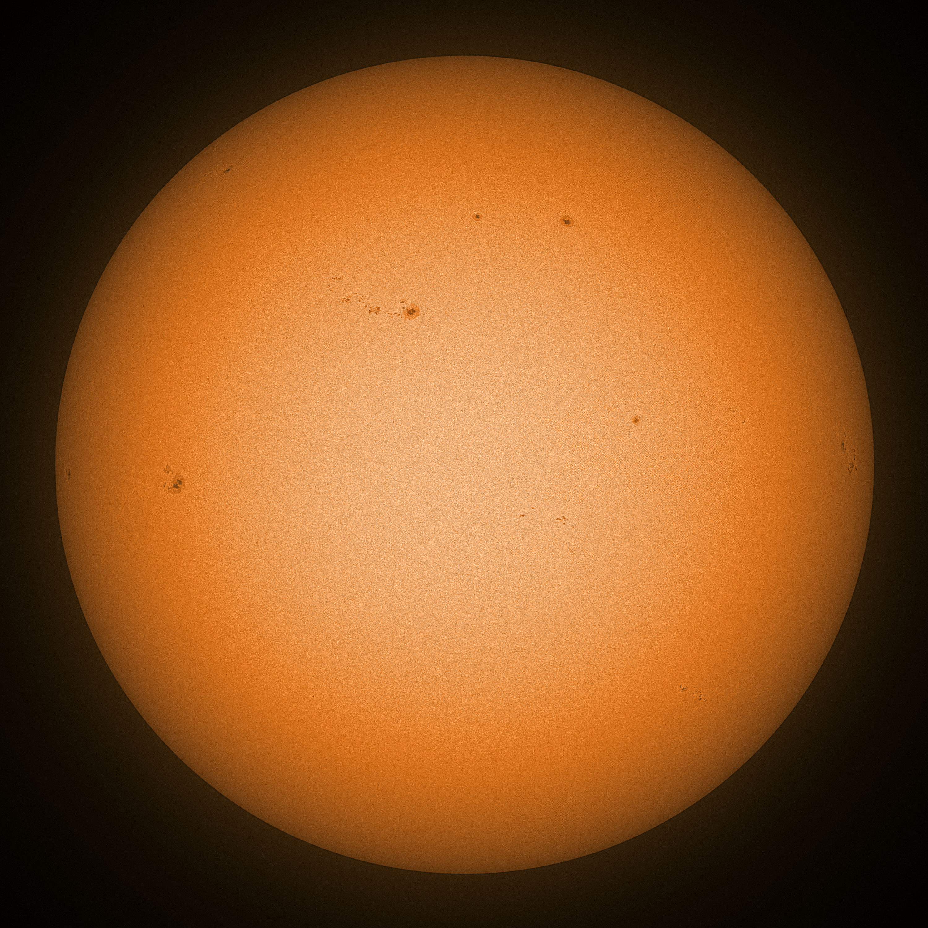 Observation date/time: 06 March 09:12 UTC Telescope: GTT60 (Galileo Type Telescope) Focal length: 1490mm (plano convex singlet) Aperture: 60mm Stop: 30mm Eyepiece: -75mm (plano concave singlet, 24mm aperture) Observation type: projection (341mm distance, 80mm diameter) Reference: Earth's rotation axis Exposure (transparency): 1.350ms (using 82nm bandwidth green filter) Seeing (SSSMon): 2.5"-3.5" (1.5" at best) =================================================================== Total number of sunspots: 31 | |