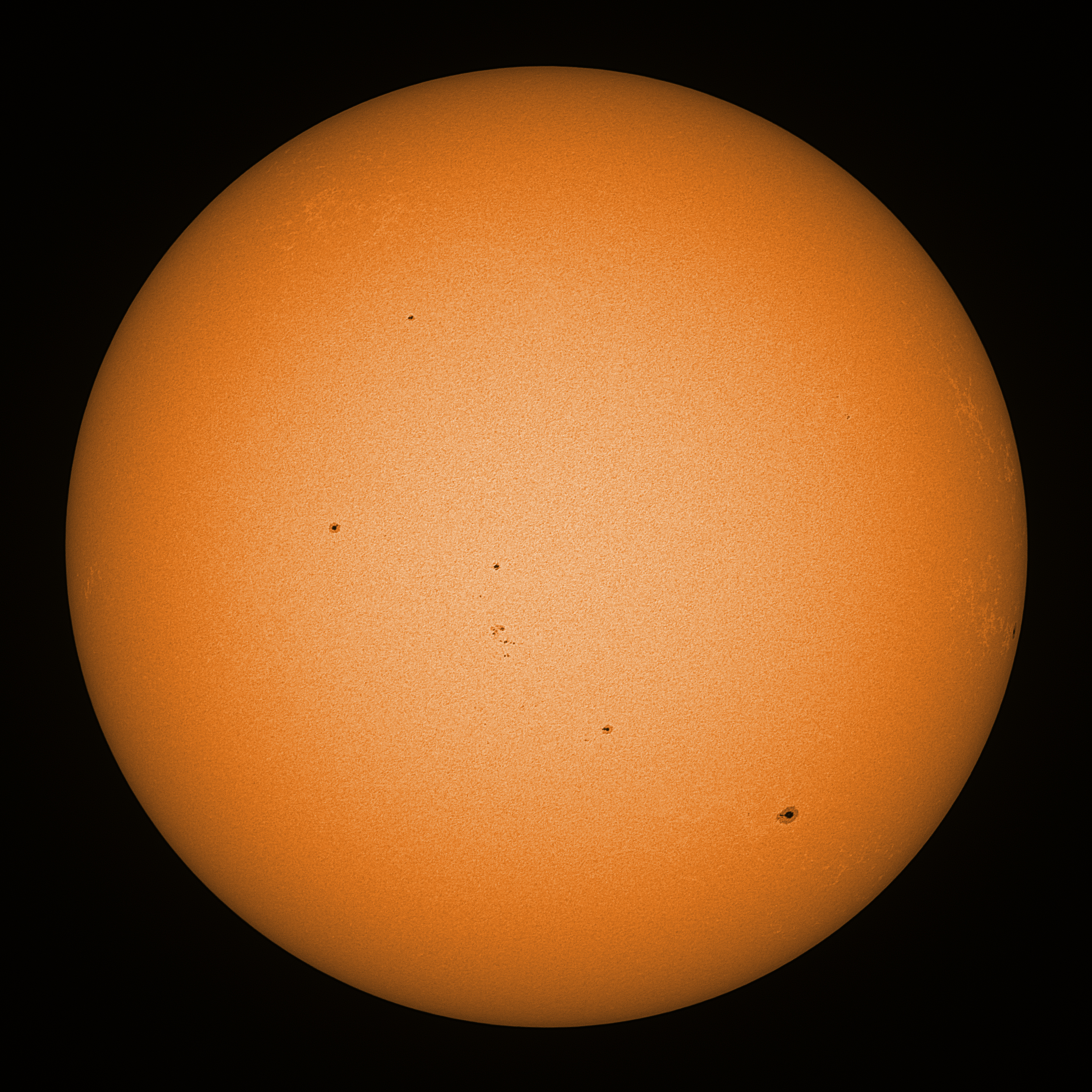 Observation date/time: 13 March 09:20 UTC Telescope: GTT60 (Galileo Type Telescope) Focal length: 1490mm (plano convex singlet) Aperture: 60mm Stop: 30mm Eyepiece: -75mm (plano concave singlet, 24mm aperture) Observation type: projection (341mm distance, 80mm diameter) Reference: Earth's rotation axis Exposure (transparency): 0.550ms (using 82nm bandwidth green filter) Seeing (SSSMon): 1.5"-1.6" (1.0" at best) =================================================================== Total number of sunspots: 23 | |