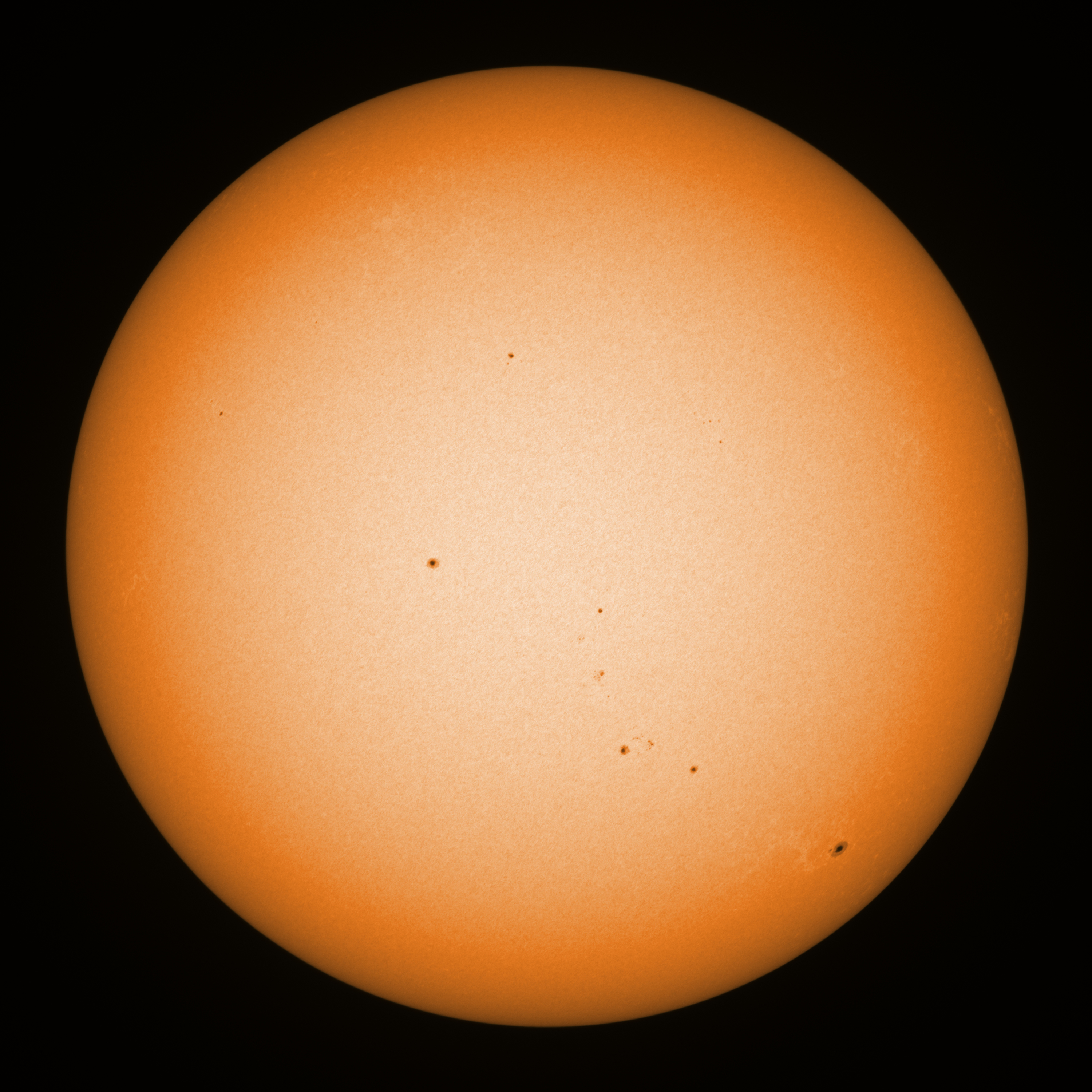 Observation date/time: 14 March 10:24 UTC Telescope: GTT60 (Galileo Type Telescope) Focal length: 1490mm (plano convex singlet) Aperture: 60mm Stop: 30mm Eyepiece: -75mm (plano concave singlet, 24mm aperture) Observation type: projection (341mm distance, 80mm diameter) Reference: Earth's rotation axis Exposure (transparency): 0.500ms (using 82nm bandwidth green filter) Seeing (SSSMon): 3.5" (2.5" at best) =================================================================== Total number of sunspots: 16 | |