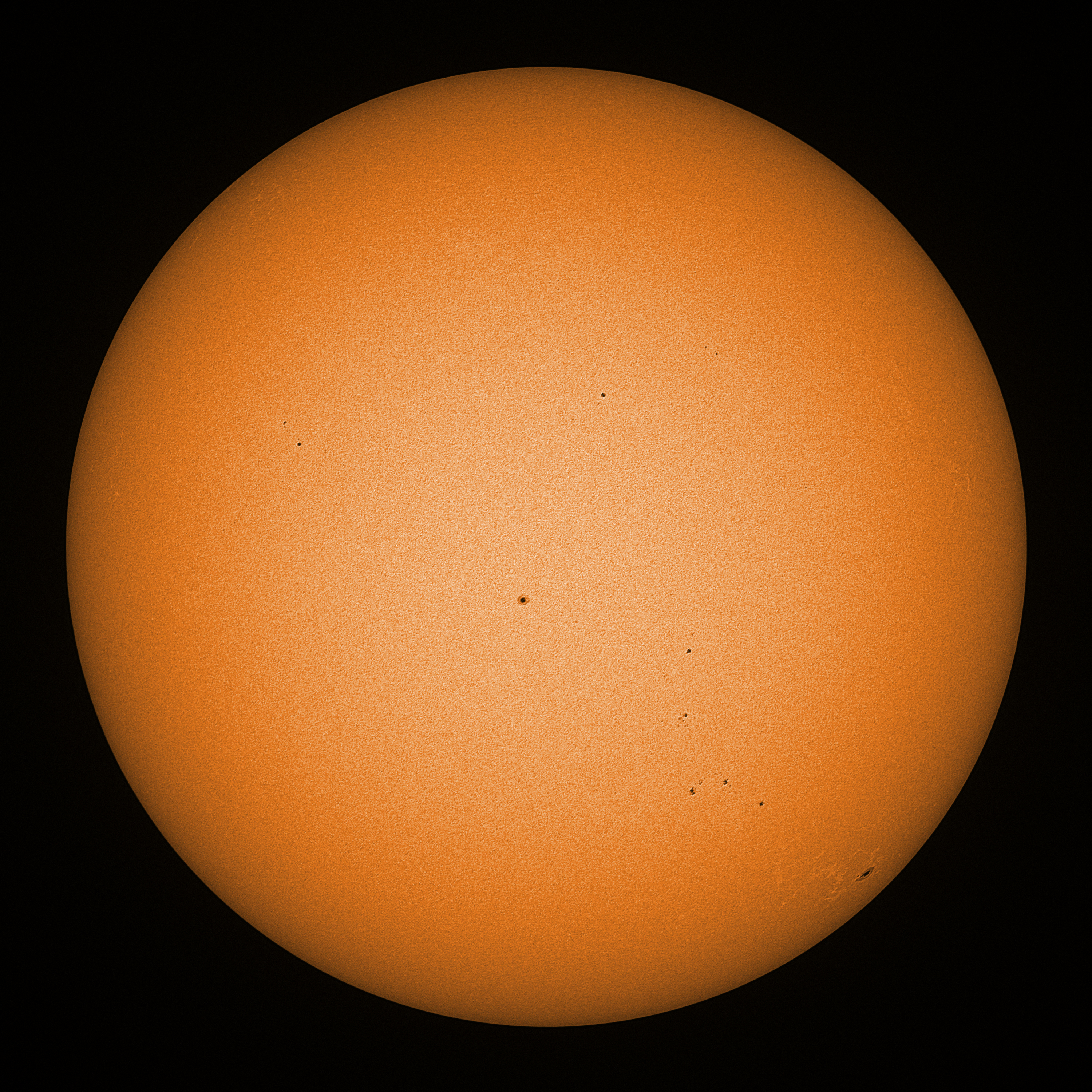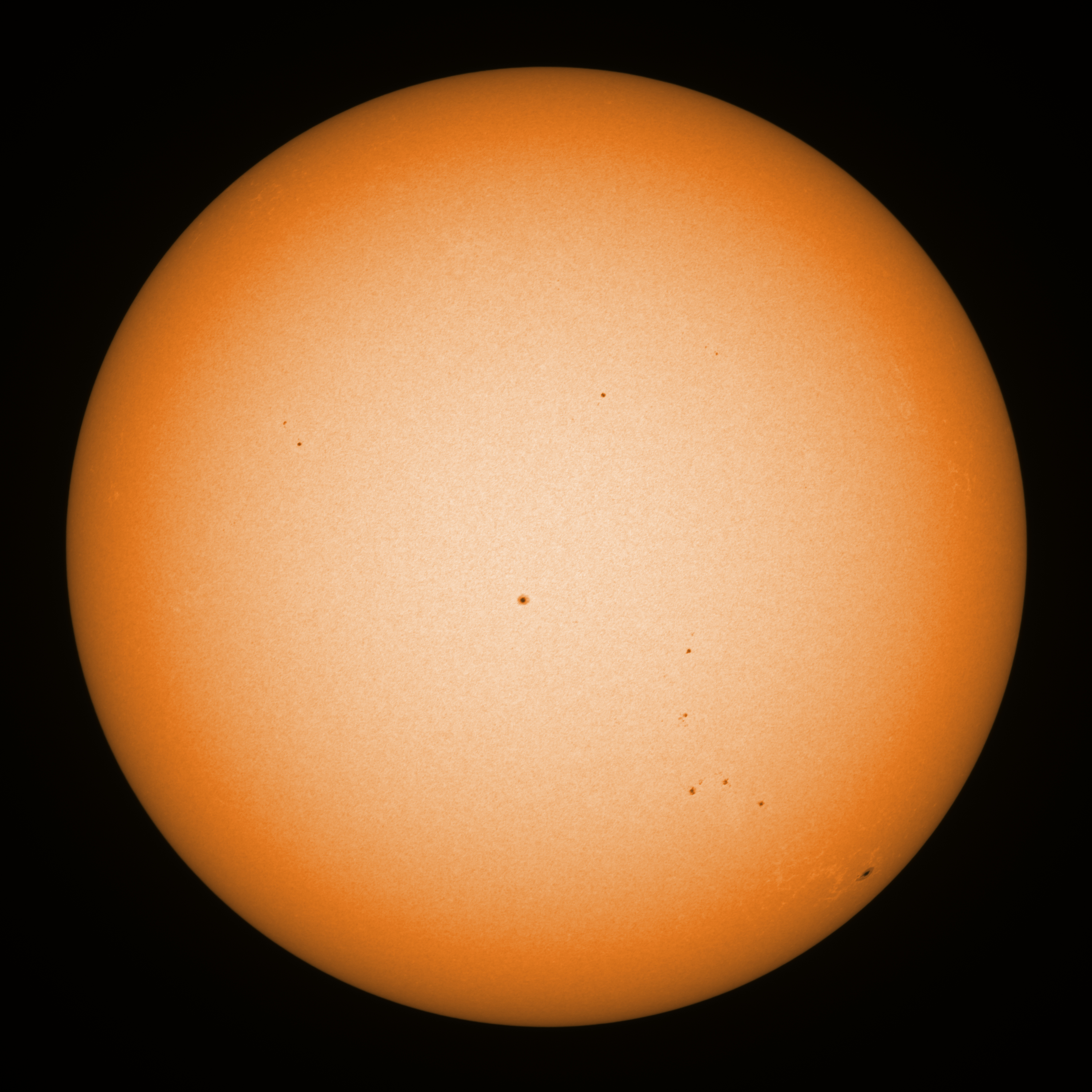 Observation date/time: 15 March 08:45 UTC Telescope: GTT60 (Galileo Type Telescope) Focal length: 1490mm (plano convex singlet) Aperture: 60mm Stop: 30mm Eyepiece: -75mm (plano concave singlet, 24mm aperture) Observation type: projection (342mm distance, 80mm diameter) Reference: Earth's rotation axis Exposure (transparency): 0.500ms (using 82nm bandwidth green filter) Seeing (SSSMon): 2.5"-3.0" (1.5" at best) =================================================================== Total number of sunspots: 16 | |
