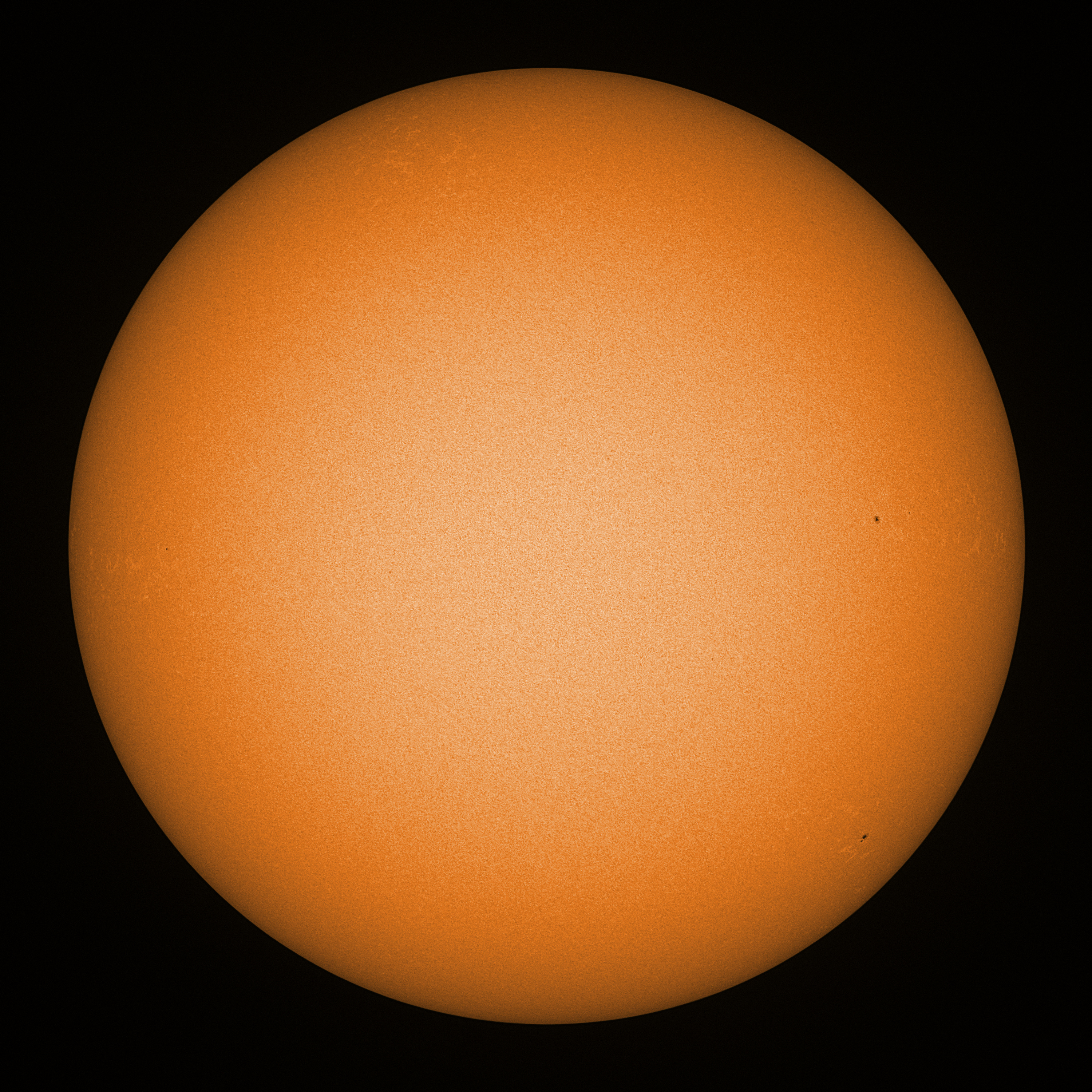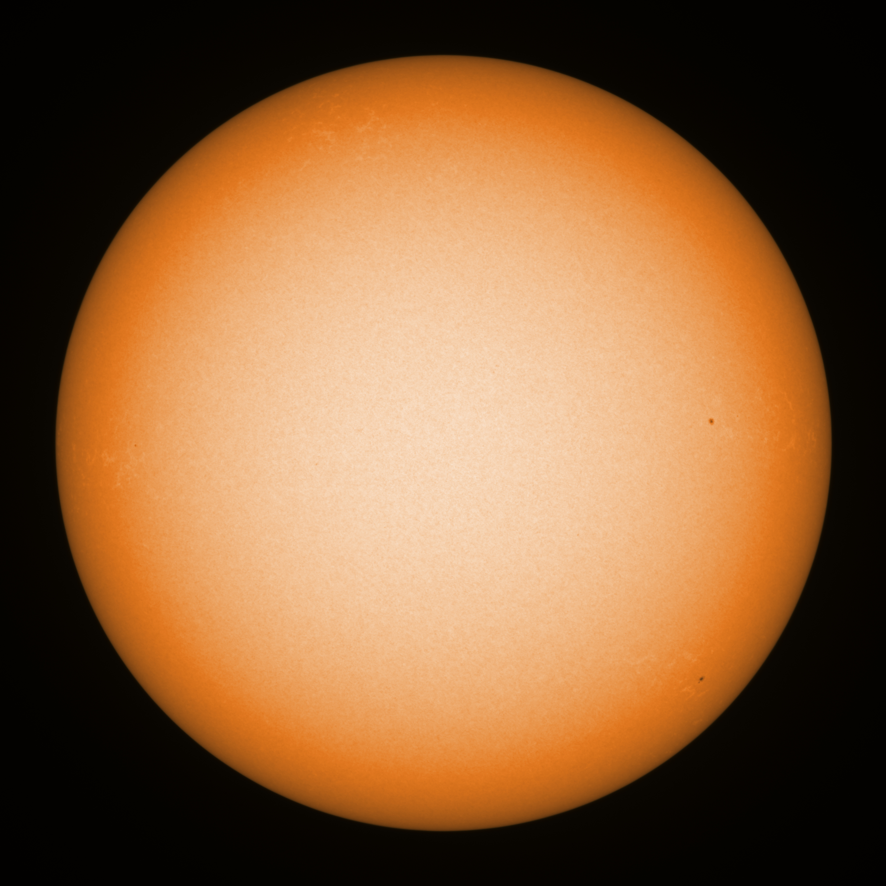 Observation date/time: 02 April 2023 09:53 UTC Telescope: GTT60 (Galileo Type Telescope) Focal length: 1490mm (plano convex singlet) Aperture: 60mm Stop: 30mm Eyepiece: -75mm (plano concave singlet, 24mm aperture) Observation type: projection (343mm distance, 80mm diameter) Reference: Earth's rotation axis Exposure (transparency): 0.450ms (using 82nm bandwidth green filter) Seeing (SSSMon): 4.0"-4.5" (3.5" at best) =================================================================== Total number of sunspots: 2 | |