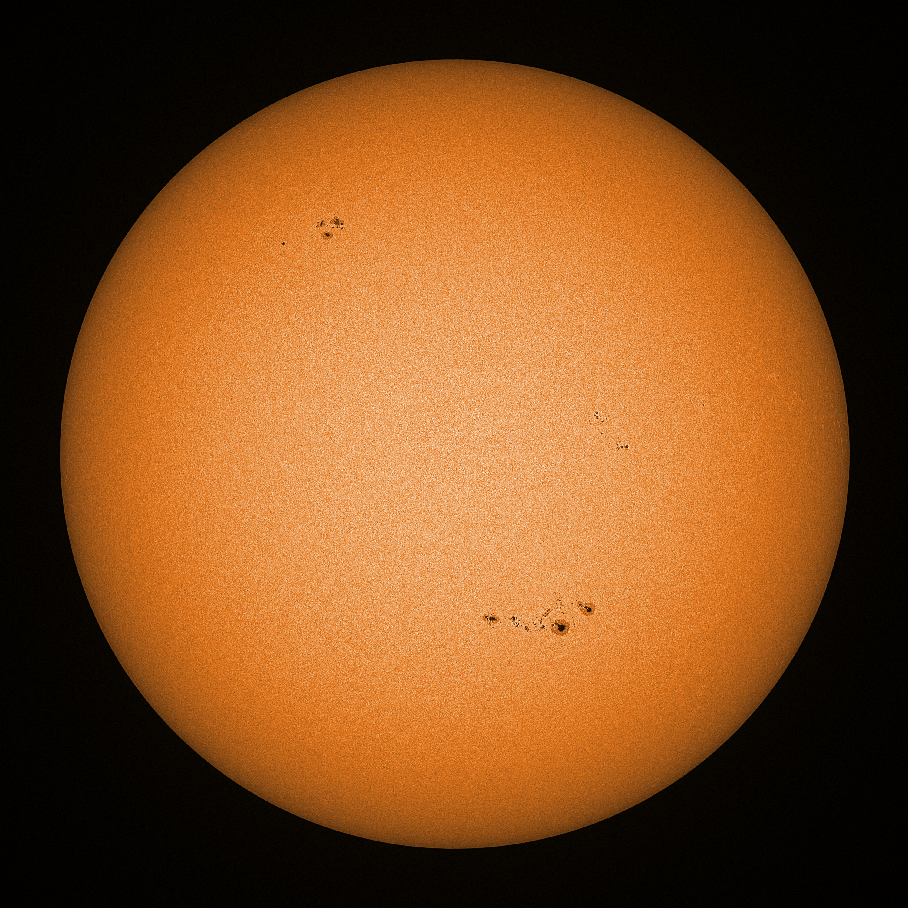 Observation date/time: 29 April 2023 08:33 UTC Telescope: GTT60 (Galileo Type Telescope) Focal length: 1490mm (plano convex singlet) Aperture: 60mm Stop: 30mm Eyepiece: -75mm (plano concave singlet, 24mm aperture) Observation type: projection (346mm distance, 80mm diameter) Reference: Earth's rotation axis Exposure (transparency): 0.450ms (using 82nm bandwidth green filter) Seeing (SSSMon): 4.5"-5.0" (3.0" at best) =================================================================== Total number of sunspots: 37 | |