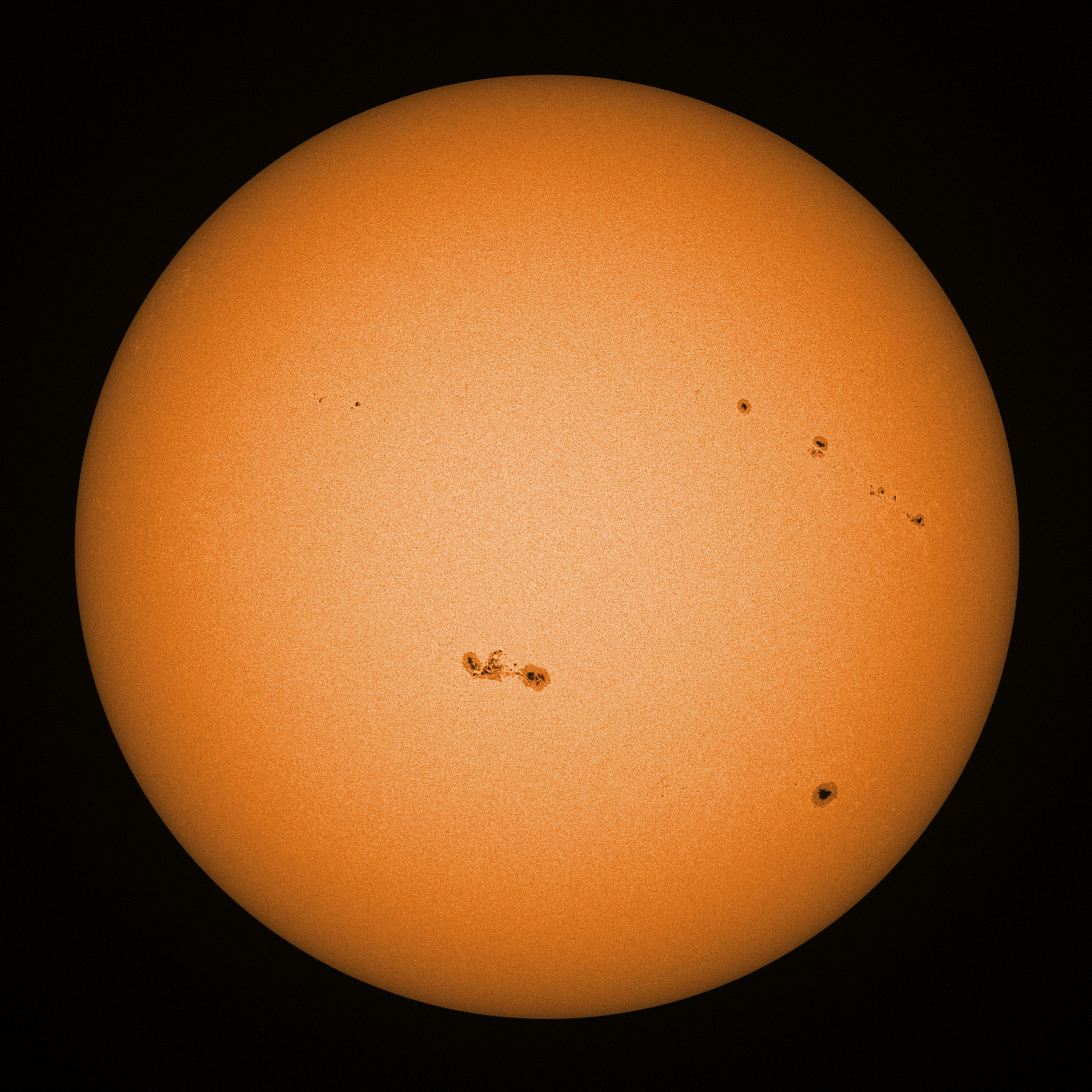 Observation date/time: 27 May 2023 09:38 UTC Telescope: GTT60 (Galileo Type Telescope) Focal length: 1490mm (plano convex singlet) Aperture: 60mm Stop: 30mm Eyepiece: -75mm (plano concave singlet, 24mm aperture) Observation type: projection (349mm distance, 80mm diameter) Reference: Earth's rotation axis Exposure (transparency): 0.500ms (using 82nm bandwidth green filter) Seeing (SSSMon): 7.0"-7.5" (4.5" at best) =================================================================== Total number of sunspots: 26 | |
