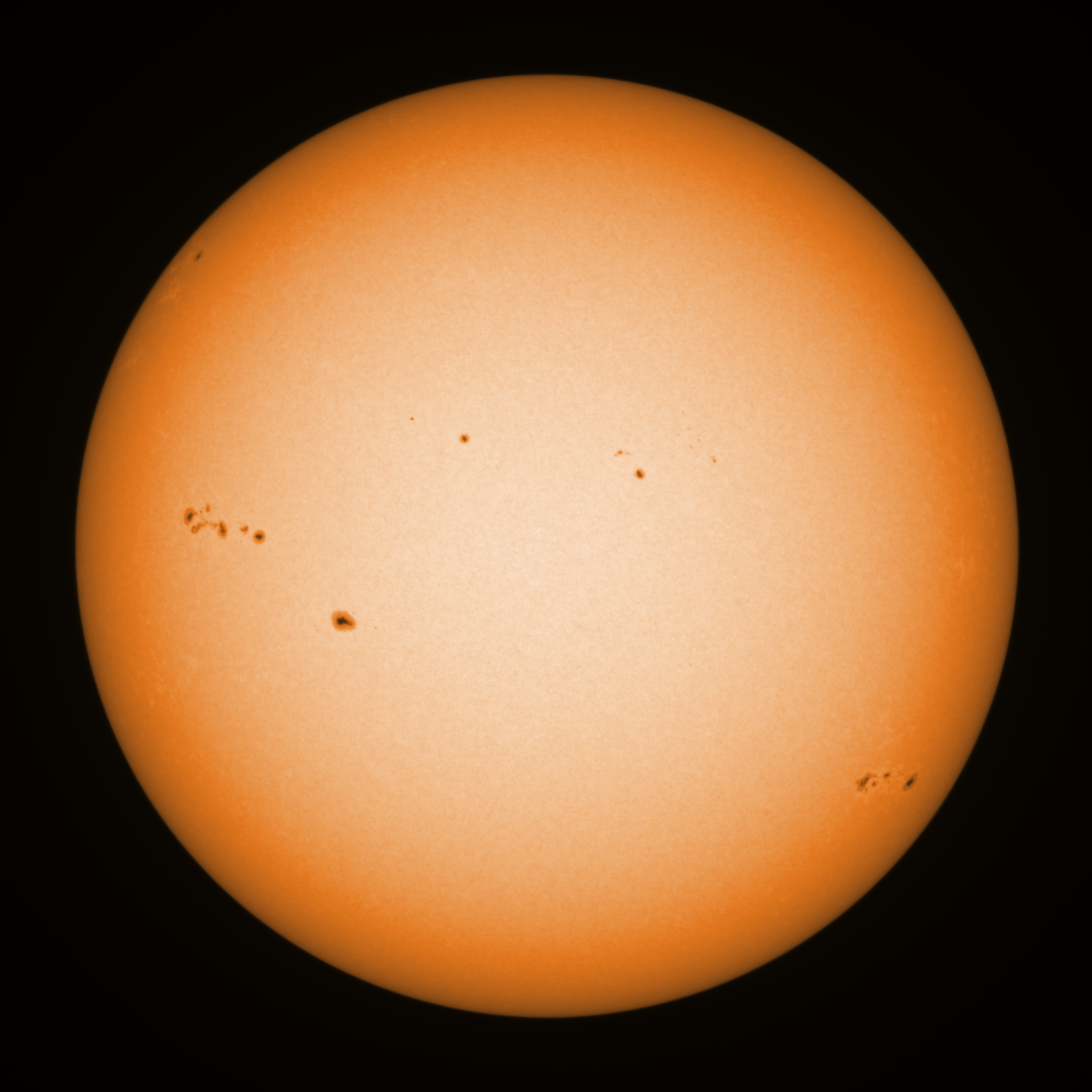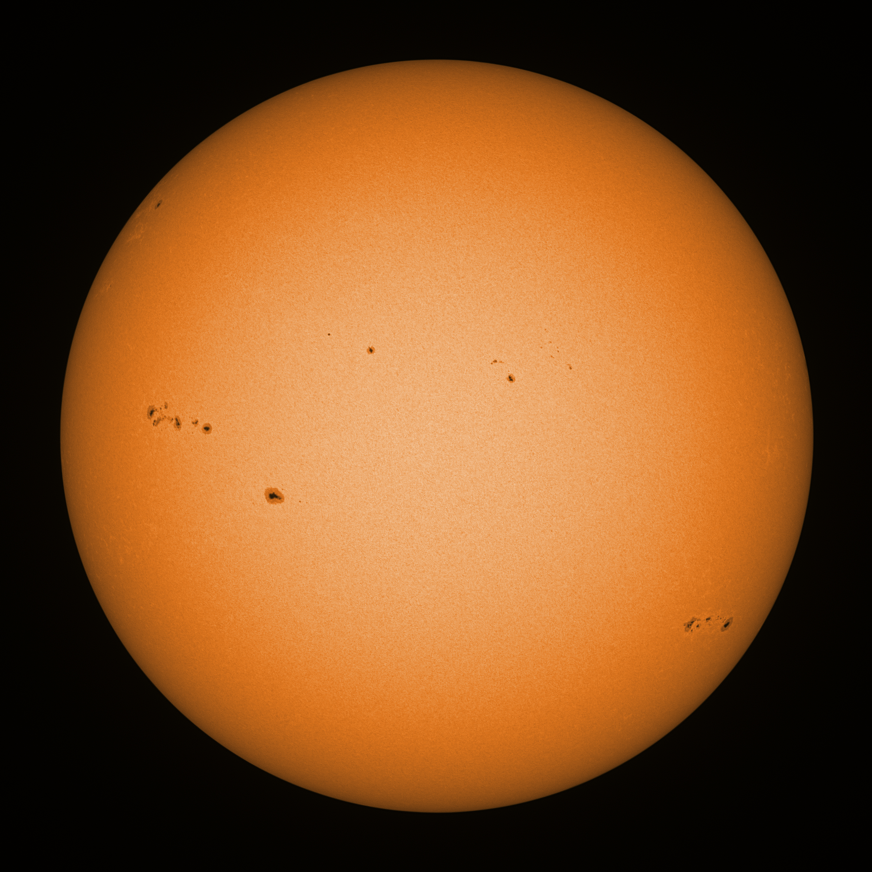Observation date/time: 03 June 2023 08:54 UTC Telescope: GTT60 (Galileo Type Telescope) Focal length: 1490mm (plano convex singlet) Aperture: 60mm Stop: 30mm Eyepiece: -75mm (plano concave singlet, 24mm aperture) Observation type: projection (352mm distance, 80mm diameter) Reference: Earth's rotation axis Exposure (transparency): 0.450ms (using 82nm bandwidth green filter) Seeing (SSSMon): 6.5"-7.0" (4.5" at best) =================================================================== Total number of sunspots: 26 | |