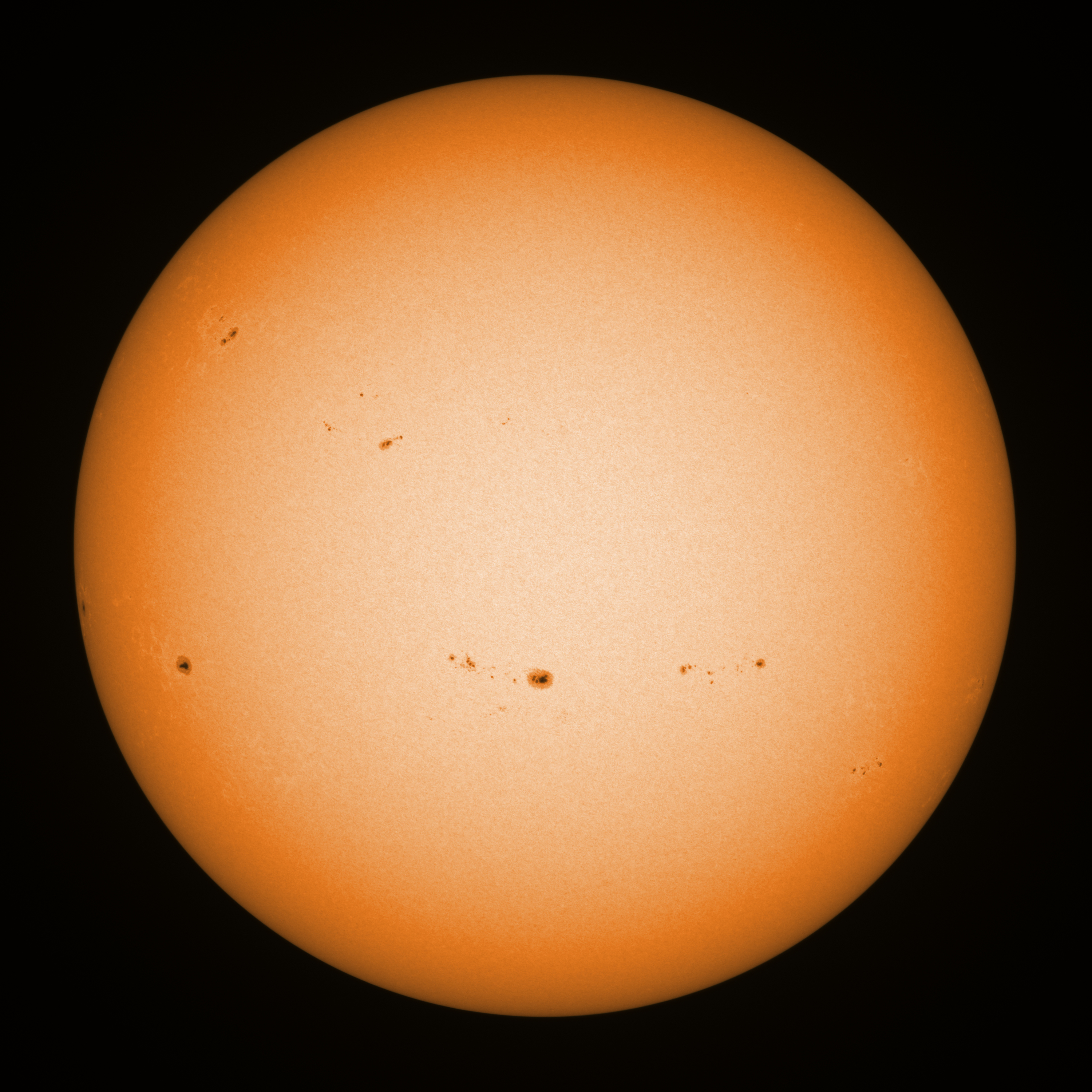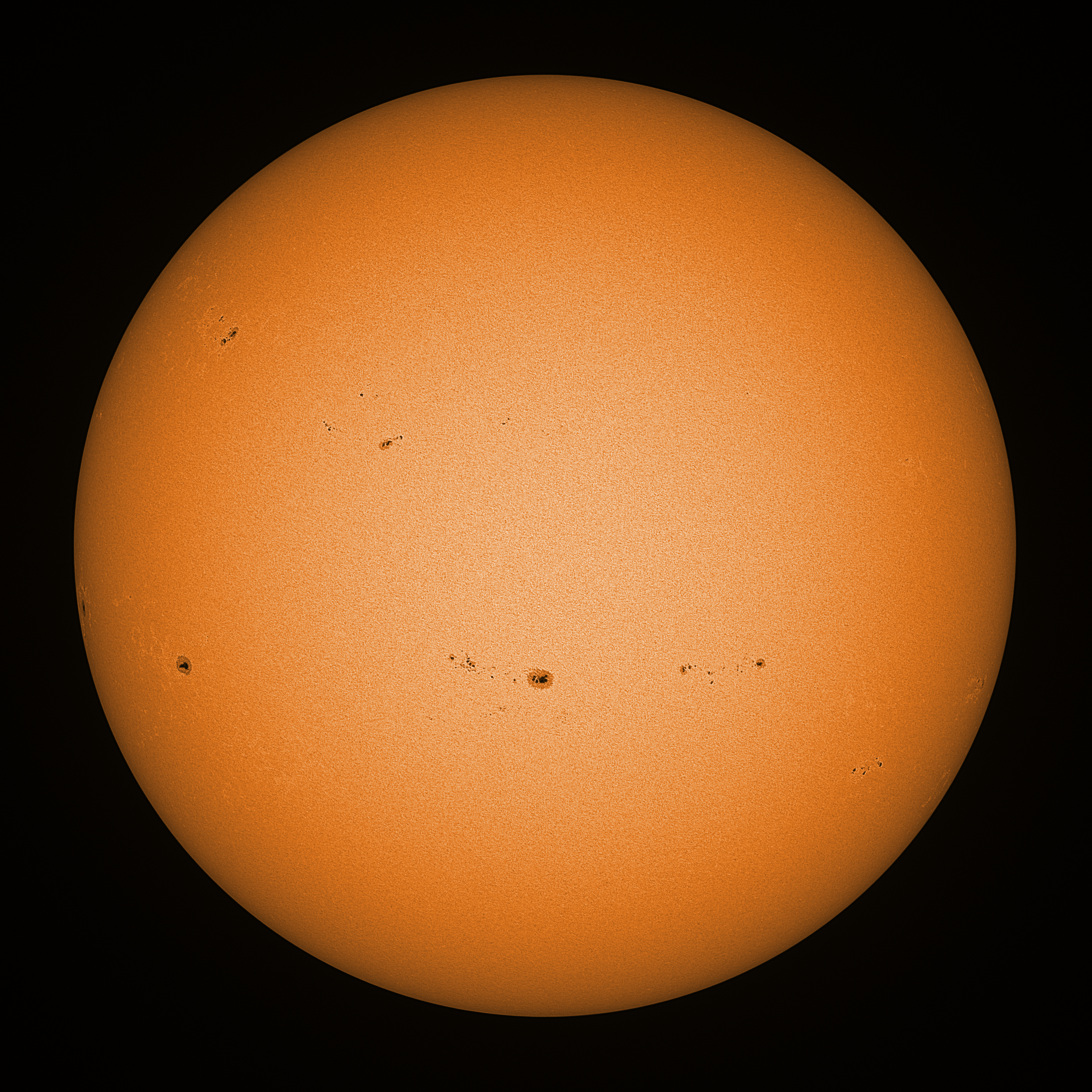 Observation date/time: 19 June 2023 11:56 UTC Telescope: GTT60 (Galileo Type Telescope) Focal length: 1490mm (plano convex singlet) Aperture: 60mm Stop: 30mm Eyepiece: -75mm (plano concave singlet, 24mm aperture) Observation type: projection (352mm distance, 80mm diameter) Reference: Earth's rotation axis Exposure (transparency): 0.450ms (using 82nm bandwidth green filter) Seeing (SSSMon): 4.0"-4.5" (3.0" at best) =================================================================== Total number of sunspots: 38 | |