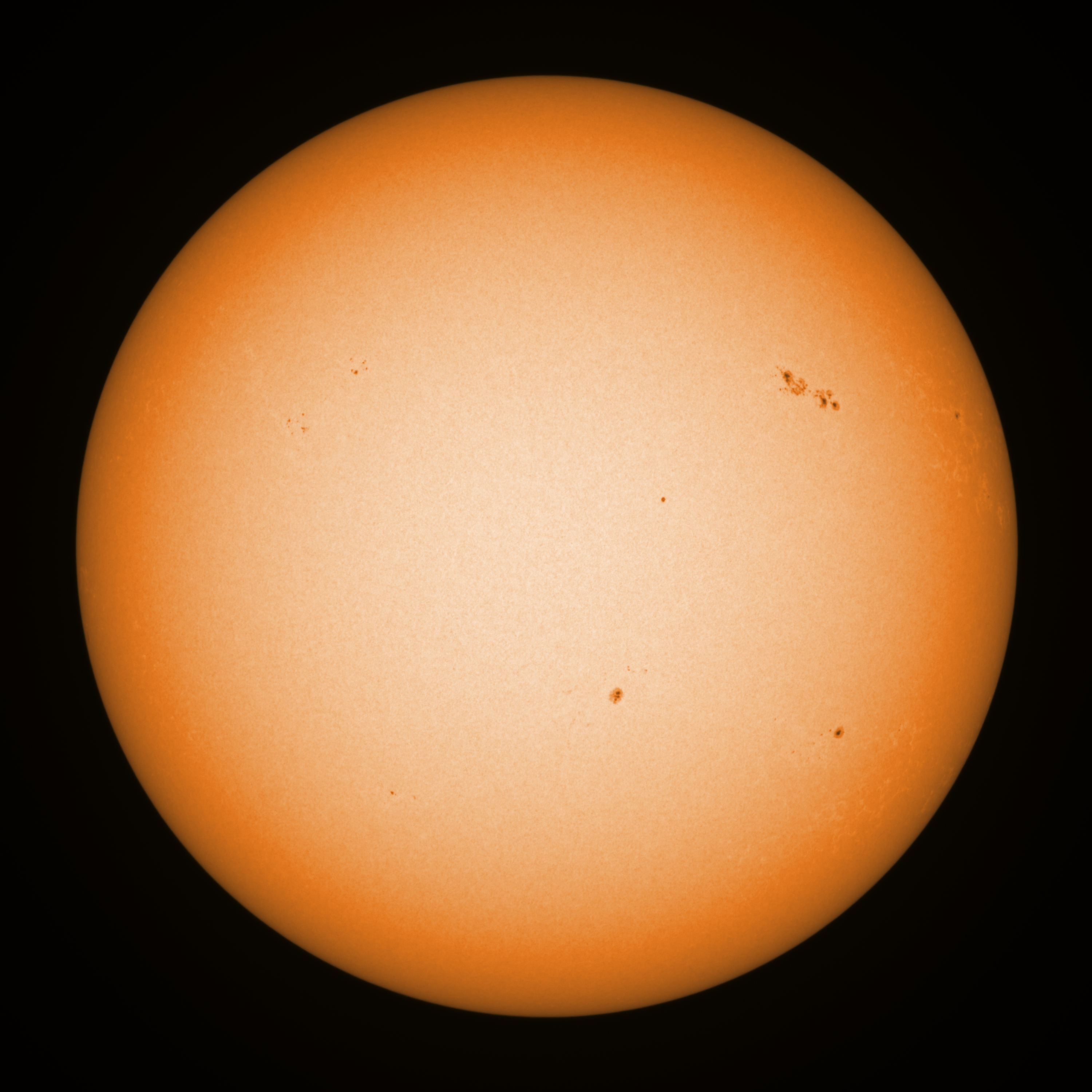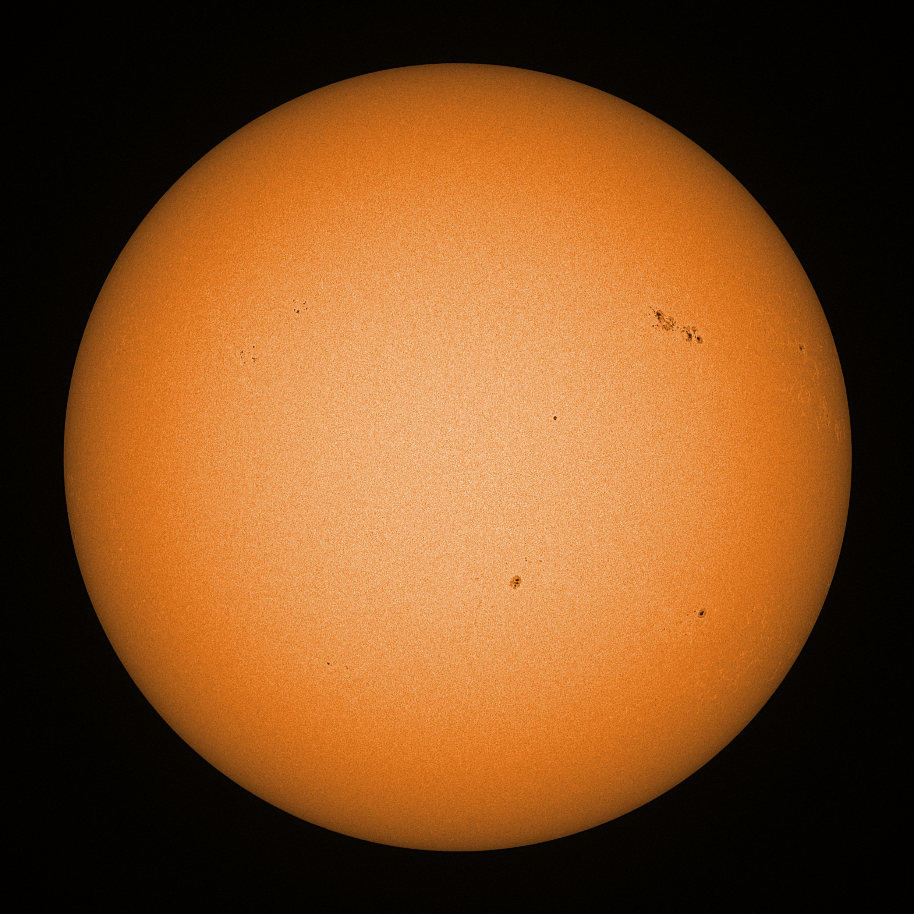 Observation date/time: 25 June 2023 08:32 UTC Telescope: GTT60 (Galileo Type Telescope) Focal length: 1490mm (plano convex singlet) Aperture: 60mm Stop: 30mm Eyepiece: -75mm (plano concave singlet, 24mm aperture) Observation type: projection (352mm distance, 80mm diameter) Reference: Earth's rotation axis Exposure (transparency): 0.400ms (using 82nm bandwidth green filter) Seeing (SSSMon): 1.5"-2.5" (1.0" at best) =================================================================== Total number of sunspots: 37 | |