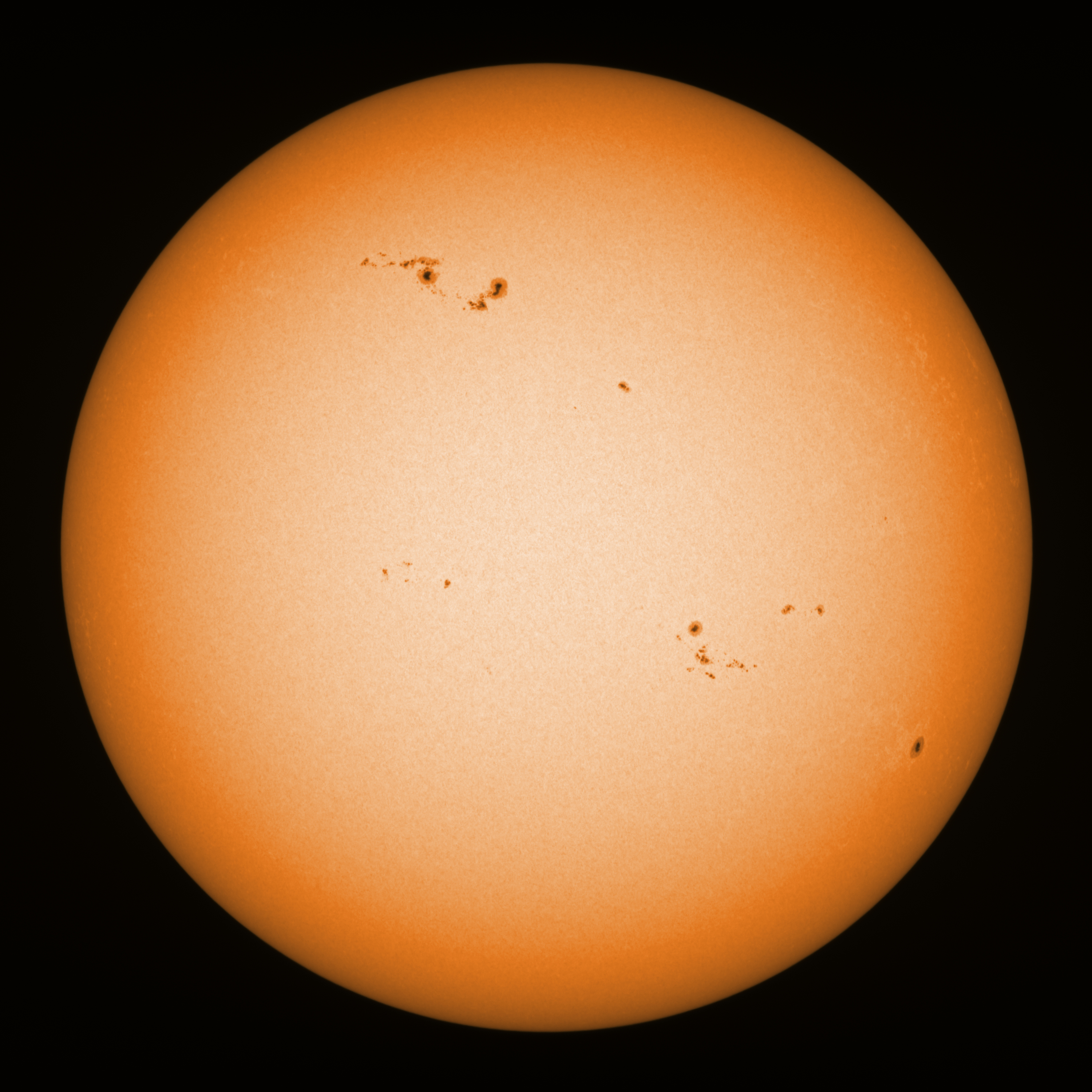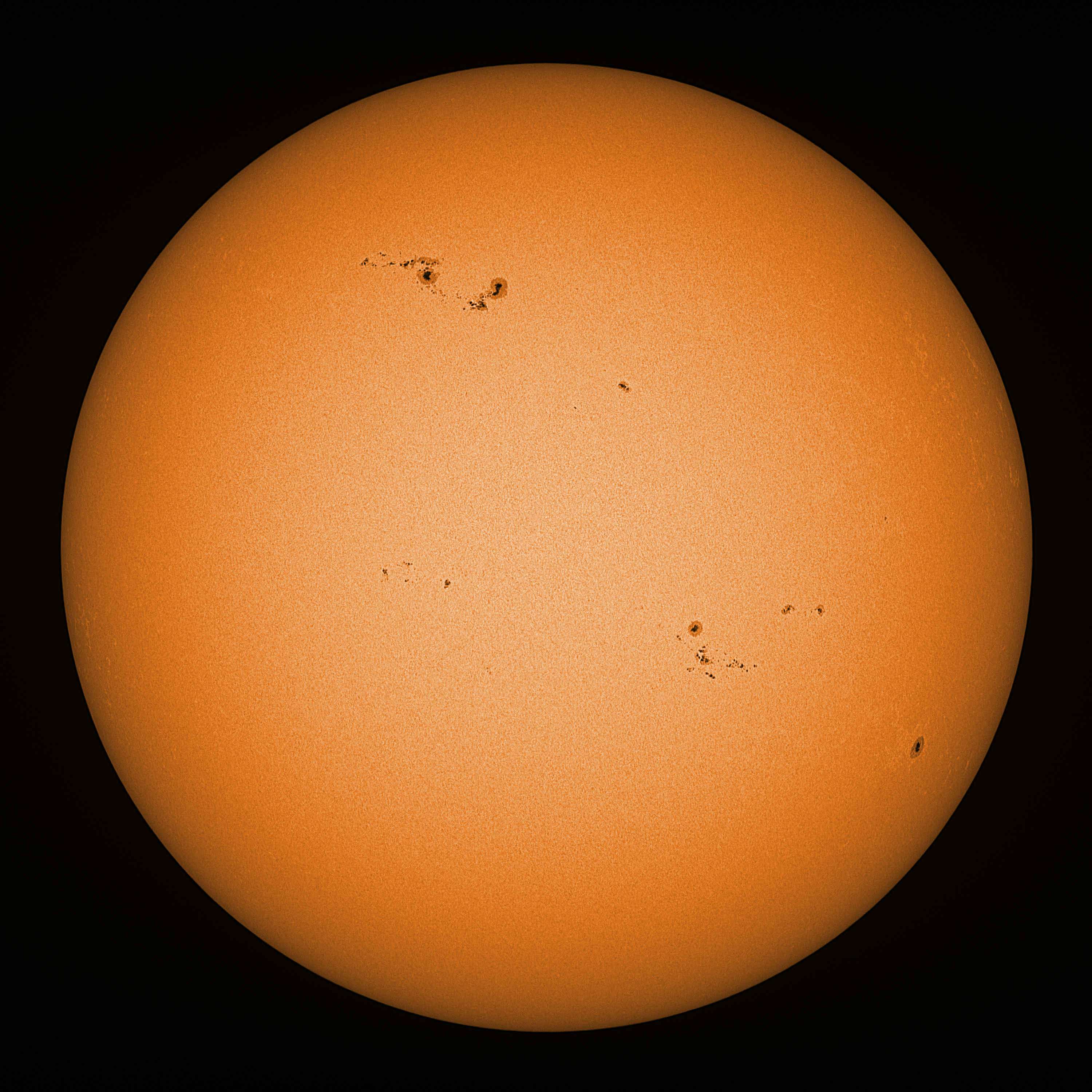 Observation date/time: 22 January 2024 10:27 UTC Telescope: GTT60 (Galileo Type Telescope) Focal length: 1490mm (plano convex singlet) Aperture: 60mm Stop: 30mm Eyepiece: -75mm (plano concave singlet, 24mm aperture) Observation type: projection (343mm distance, 80mm diameter) Reference: Earth's rotation axis Exposure (transparency): 0.800ms (using 82nm bandwidth green filter) Seeing (SSSMon): 2.0" (1.0" at best) =================================================================== Total number of sunspots: 41 | |