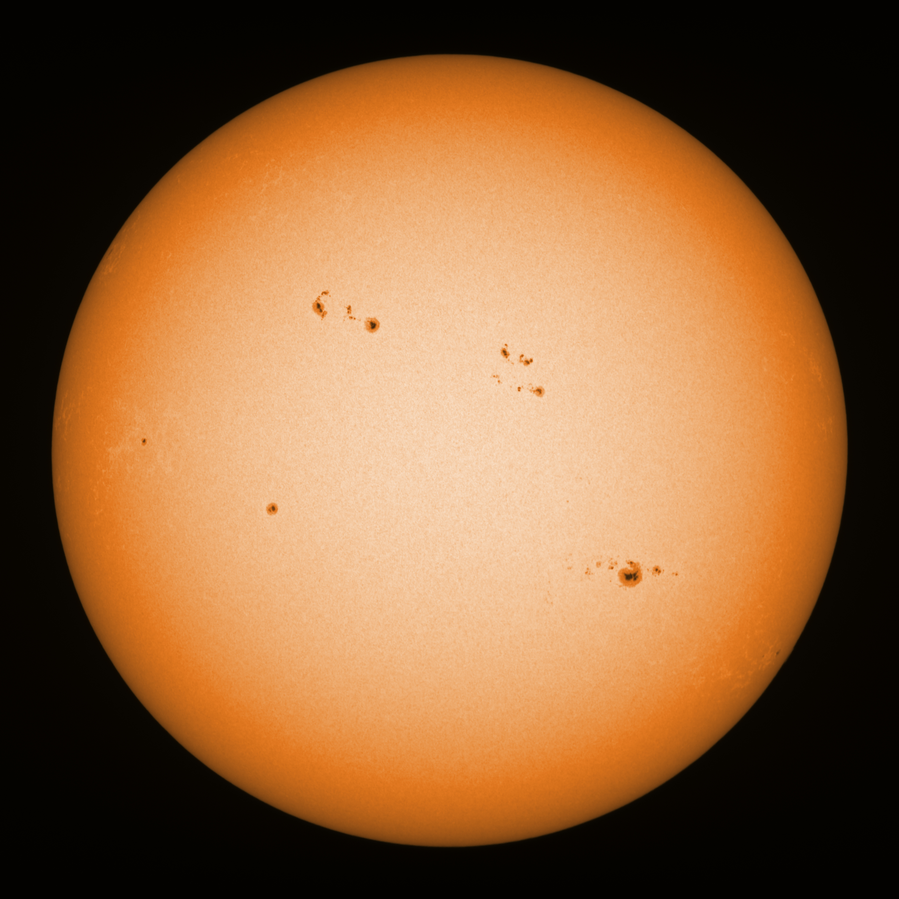 Observation date/time: 12 February 2024 15:10 UTC Telescope: GTT60 (Galileo Type Telescope) Focal length: 1490mm (plano convex singlet) Aperture: 60mm Stop: 30mm Eyepiece: -75mm (plano concave singlet, 24mm aperture) Observation type: projection (341mm distance, 80mm diameter) Reference: Earth's rotation axis Exposure (transparency): 0.900ms (using 82nm bandwidth green filter) Seeing (SSSMon): 2.0-3.0" (1.5" at best) =================================================================== Total number of sunspots: 39 | |