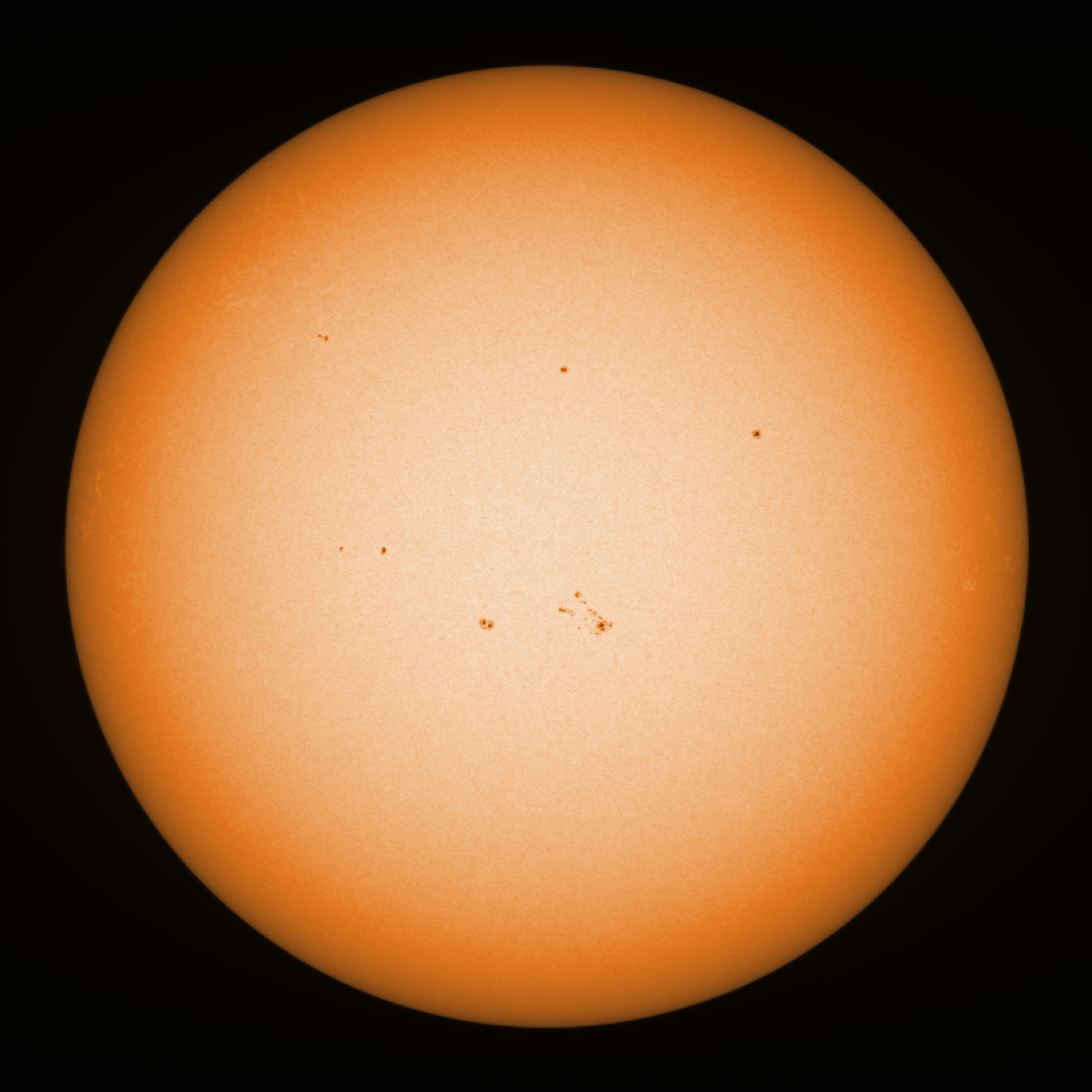 Observation date/time: 08 March 2024 10:41 UTC Telescope: GTT60 (Galileo Type Telescope) Focal length: 1490mm (plano convex singlet) Aperture: 60mm Stop: 30mm Eyepiece: -75mm (plano concave singlet, 24mm aperture) Observation type: projection (344mm distance, 80mm diameter) Reference: Earth's rotation axis Exposure (transparency): 0.550ms (using 82nm bandwidth green filter) Seeing (SSSMon): 3.5-4.0" (3.0" at best) =================================================================== Total number of sunspots: 21 | |