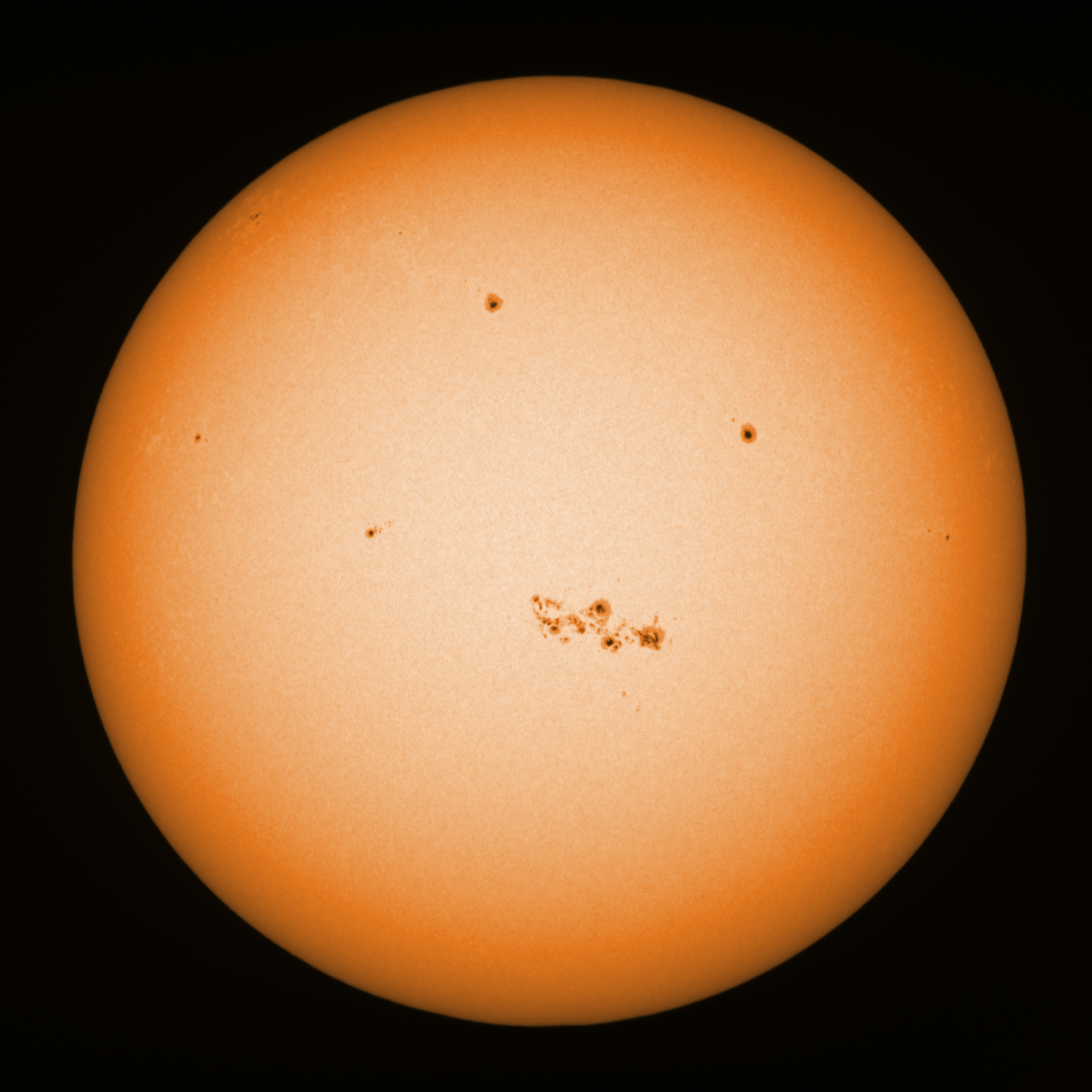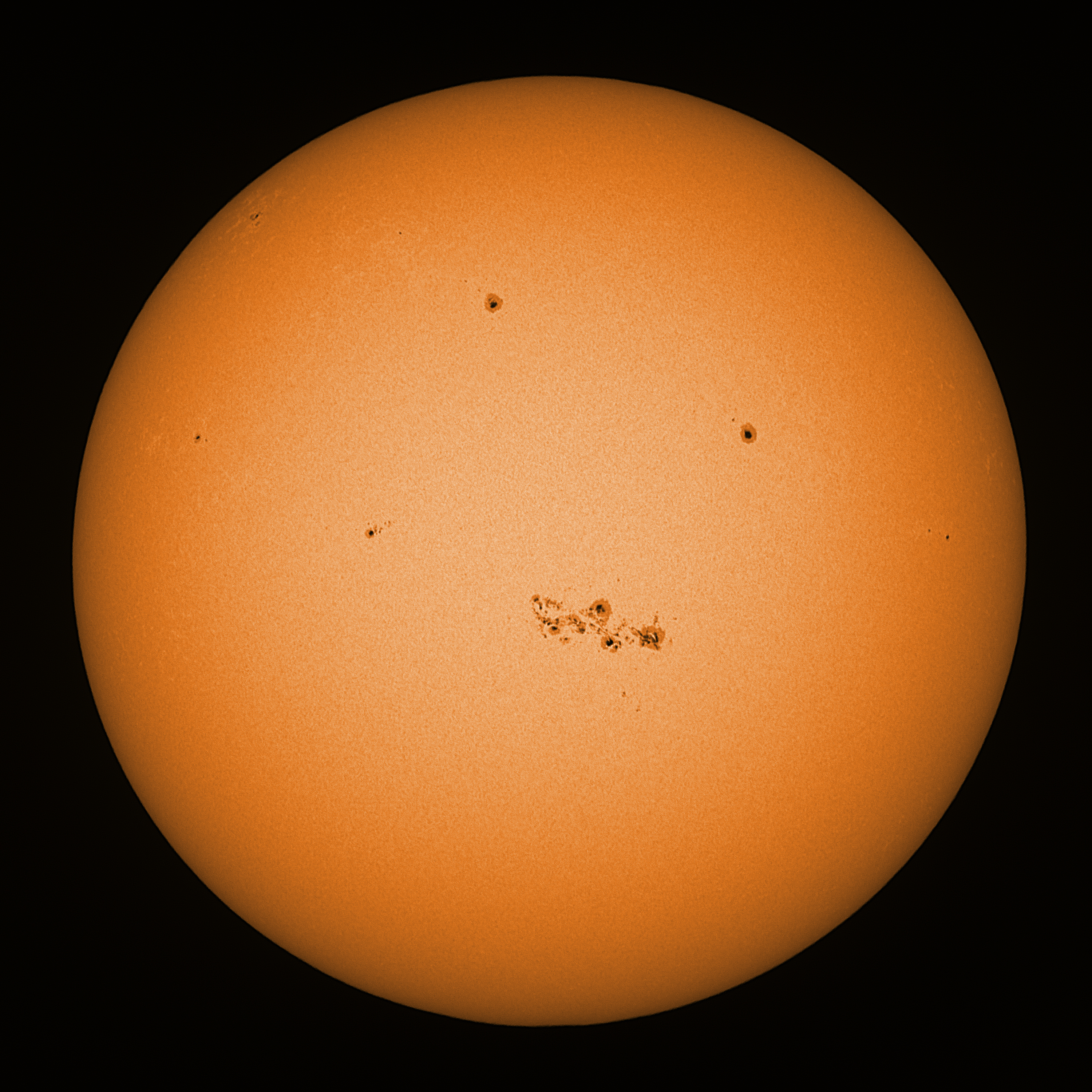 Observation date/time: 24 March 2024 16:52 UTC Telescope: GTT60 (Galileo Type Telescope) Focal length: 1490mm (plano convex singlet) Aperture: 60mm Stop: 30mm Eyepiece: -75mm (plano concave singlet, 24mm aperture) Observation type: projection (344mm distance, 80mm diameter) Reference: Earth's rotation axis Exposure (transparency): 2.050ms (using 82nm bandwidth green filter) Seeing (SSSMon): 1.5-2.0" (0.8" at best) =================================================================== Total number of sunspots: 48 | |