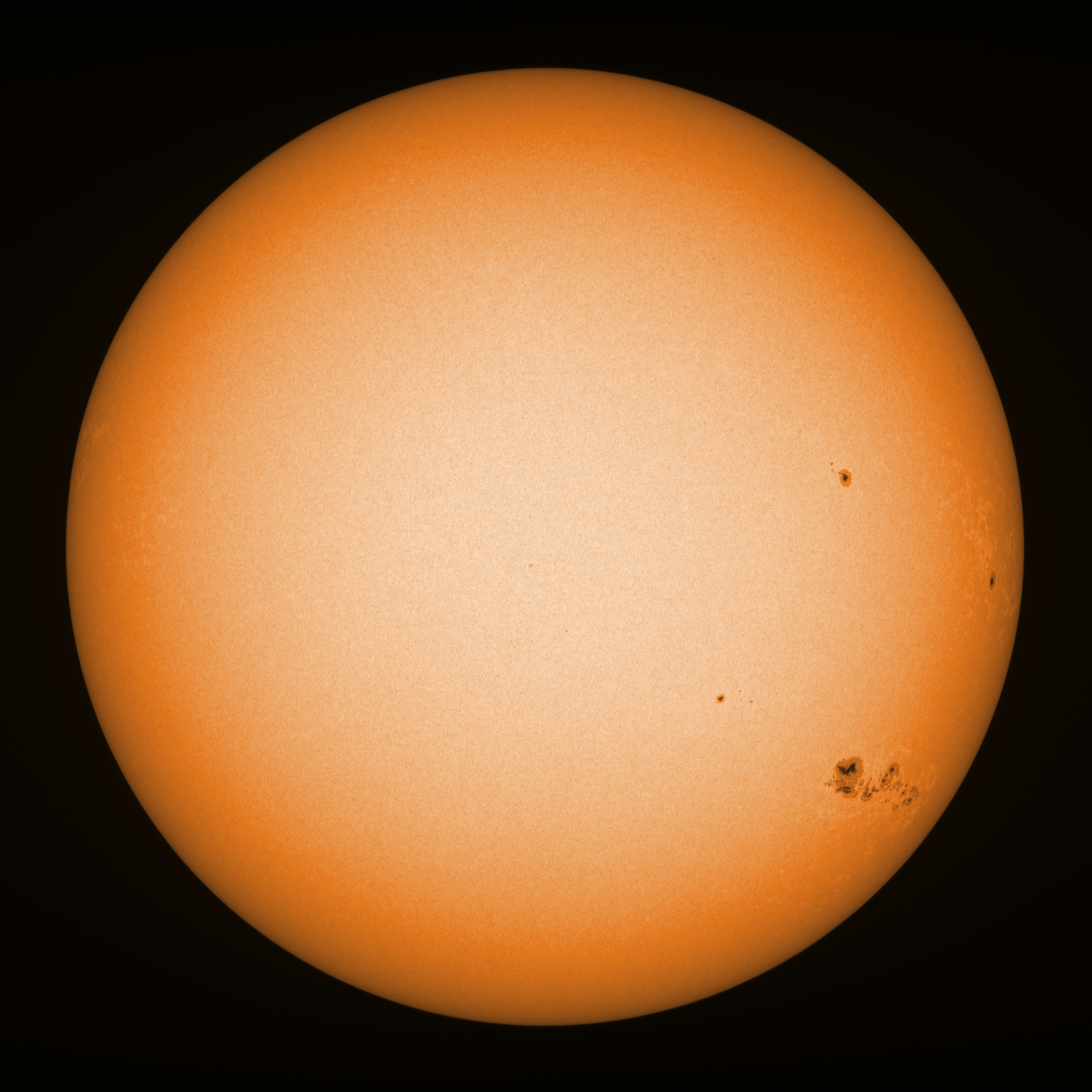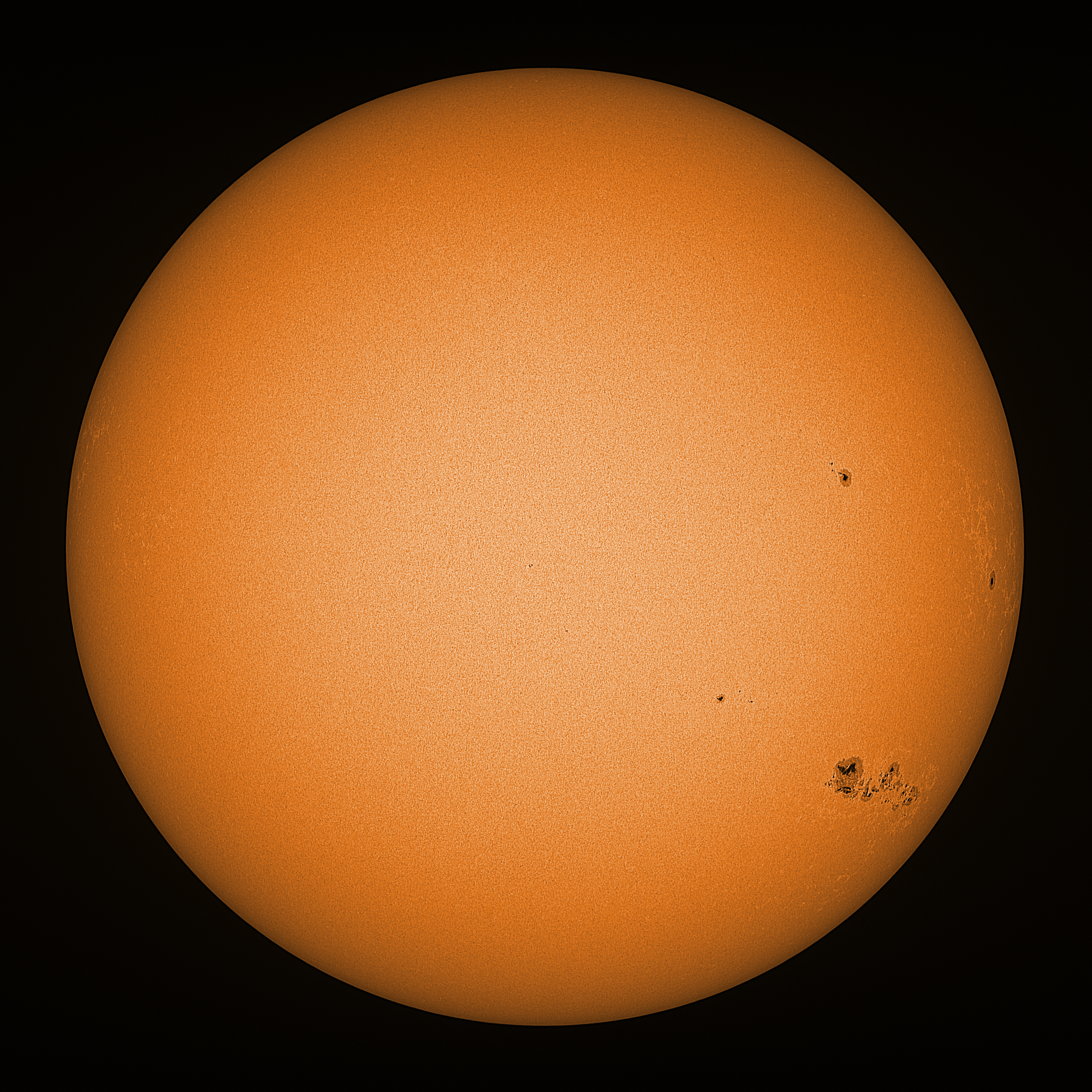 Observation date/time: 28 March 2024 13:19 UTC Telescope: GTT60 (Galileo Type Telescope) Focal length: 1490mm (plano convex singlet) Aperture: 60mm Stop: 30mm Eyepiece: -75mm (plano concave singlet, 24mm aperture) Observation type: projection (344mm distance, 80mm diameter) Reference: Earth's rotation axis Exposure (transparency): 0.450ms (using 82nm bandwidth green filter) Seeing (SSSMon): 2.0" (1.5" at best) =================================================================== Total number of sunspots: 20 | |
