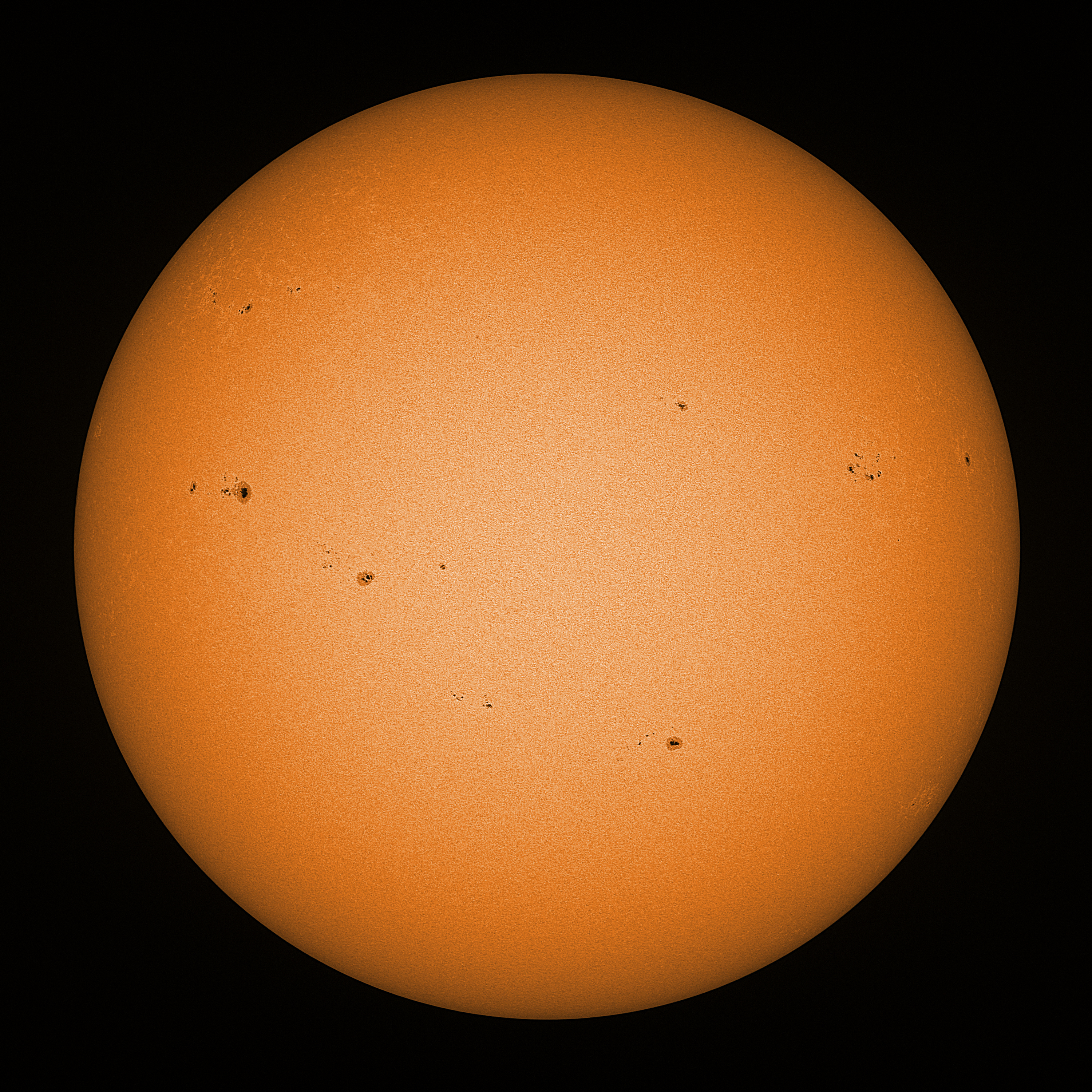 Observation date/time: 15 May 2024 07:54 UTC Telescope: GTT60 (Galileo Type Telescope) Focal length: 1490mm (plano convex singlet) Aperture: 60mm Stop: 30mm Eyepiece: -75mm (plano concave singlet, 24mm aperture) Observation type: projection (349mm distance, 80mm diameter) Reference: Earth's rotation axis Exposure (transparency): 0.600ms (using 82nm bandwidth green filter) Seeing (SSSMon): 4.0-4.5" (2.5" at best) =================================================================== Total number of sunspots: 42 | |