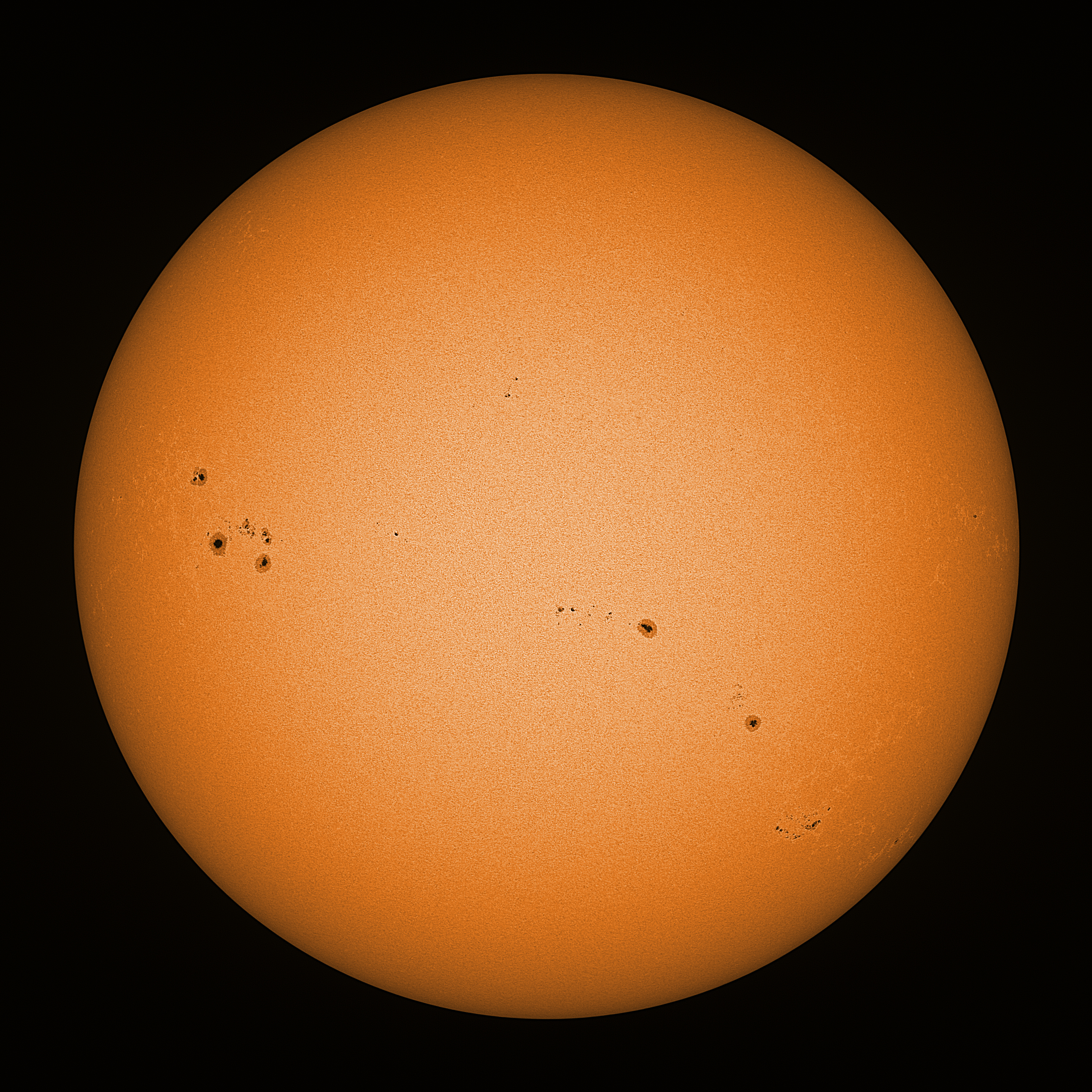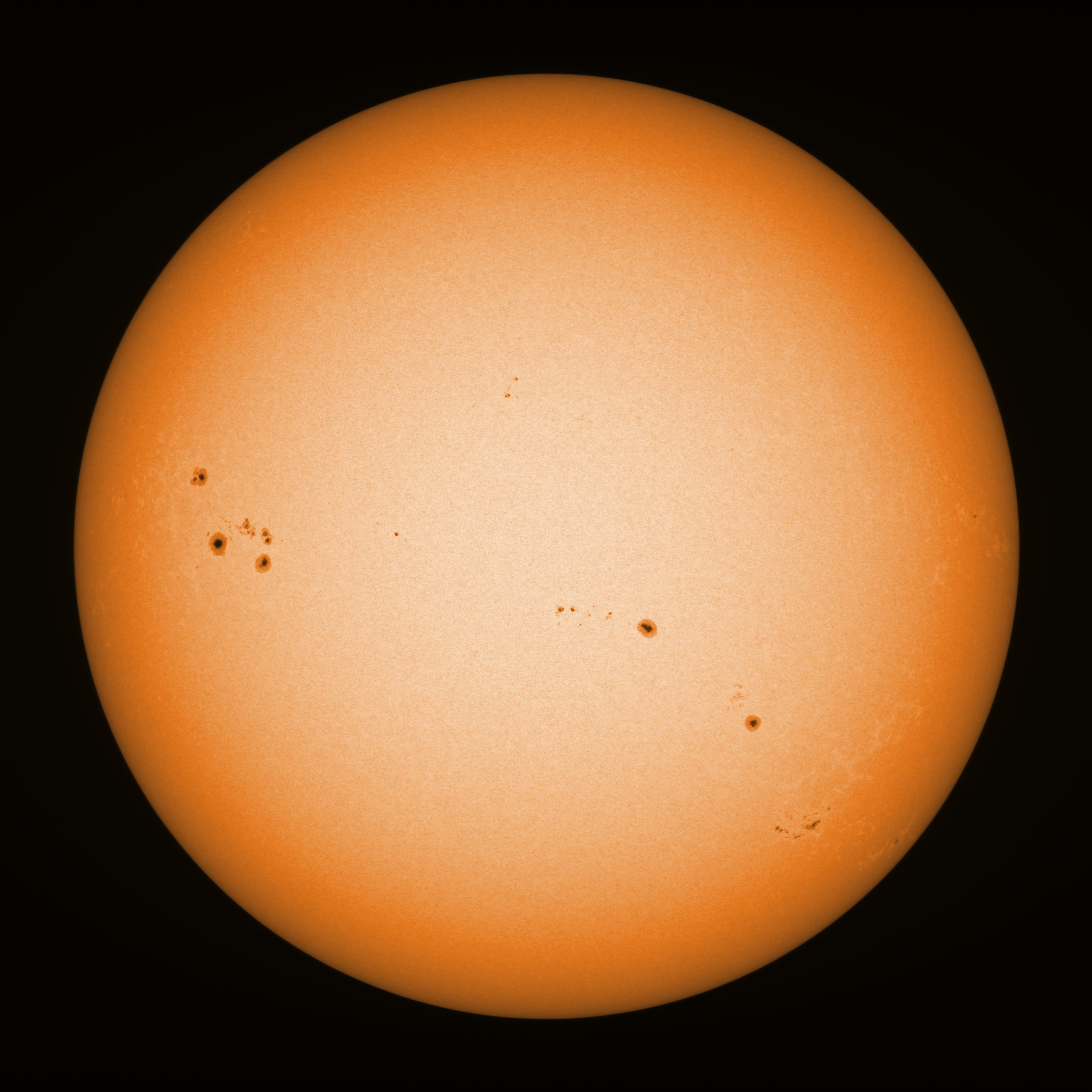 Observation date/time: 19 May 2024 08:04 UTC Telescope: GTT60 (Galileo Type Telescope) Focal length: 1490mm (plano convex singlet) Aperture: 60mm Stop: 30mm Eyepiece: -75mm (plano concave singlet, 24mm aperture) Observation type: projection (349mm distance, 80mm diameter) Reference: Earth's rotation axis Exposure (transparency): 0.450ms (using 82nm bandwidth green filter) Seeing (SSSMon): 4.0-5.0" (2.0" at best) =================================================================== Total number of sunspots: 44 | |