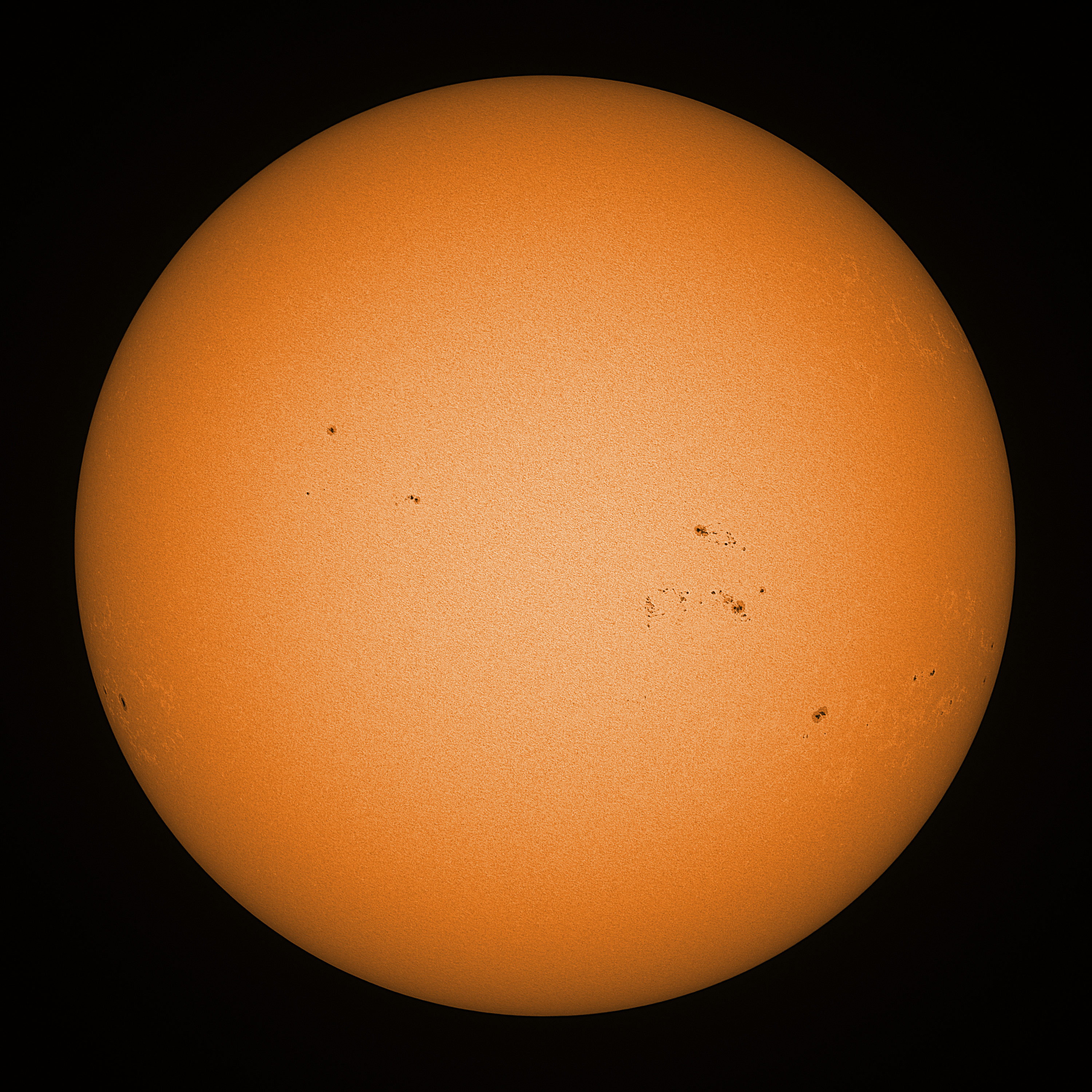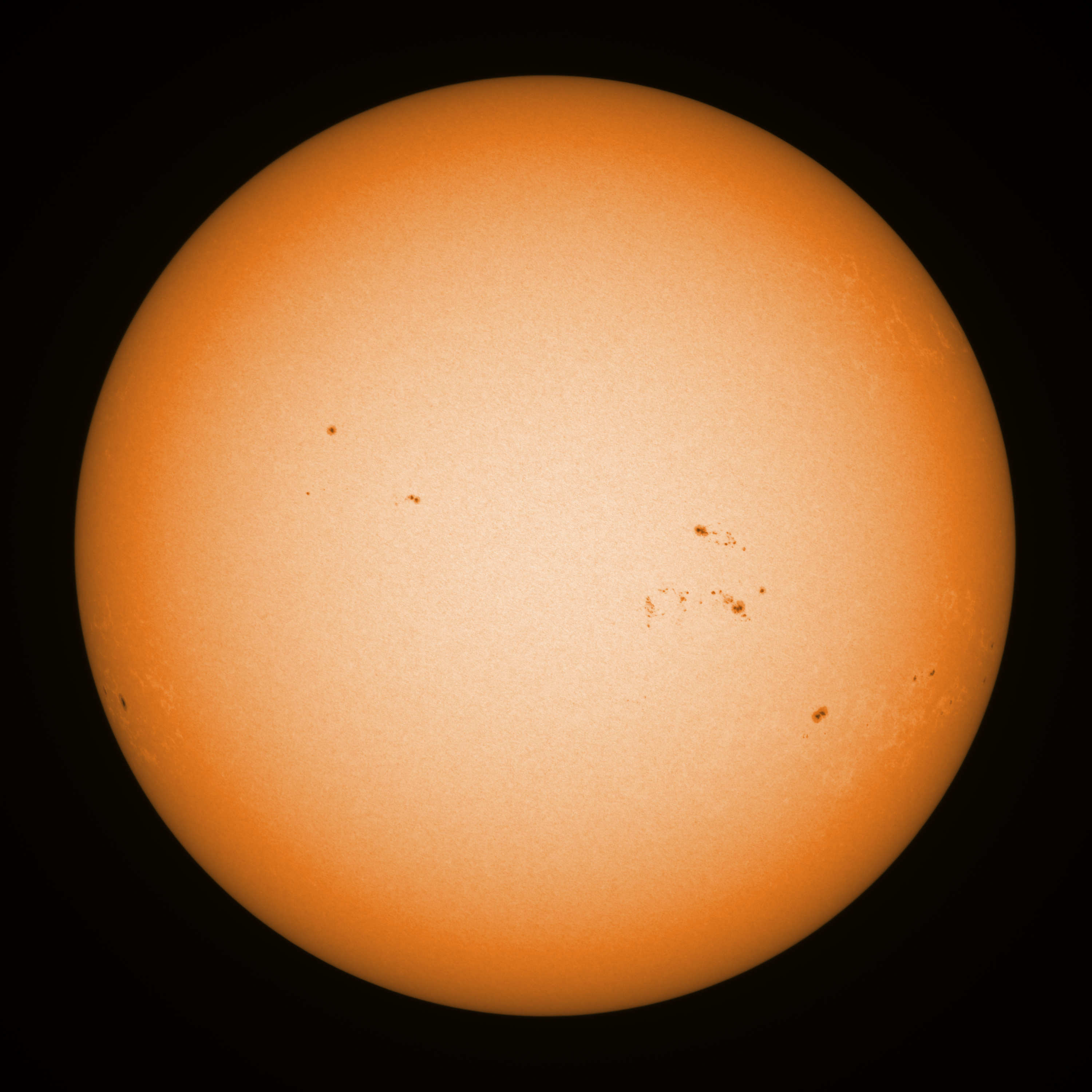 Observation date/time: 03 July 2024 12:21 UTC Telescope: GTT60 (Galileo Type Telescope) Focal length: 1490mm (plano convex singlet) Aperture: 60mm Stop: 30mm Eyepiece: -75mm (plano concave singlet, 24mm aperture) Observation type: projection (350mm distance, 80mm diameter) Reference: Earth's rotation axis Exposure (transparency): 0.380ms (using 82nm bandwidth green filter) Seeing (SSSMon): 4.0-4.5" (2.5" at best) =================================================================== Total number of sunspots: 38 | |
