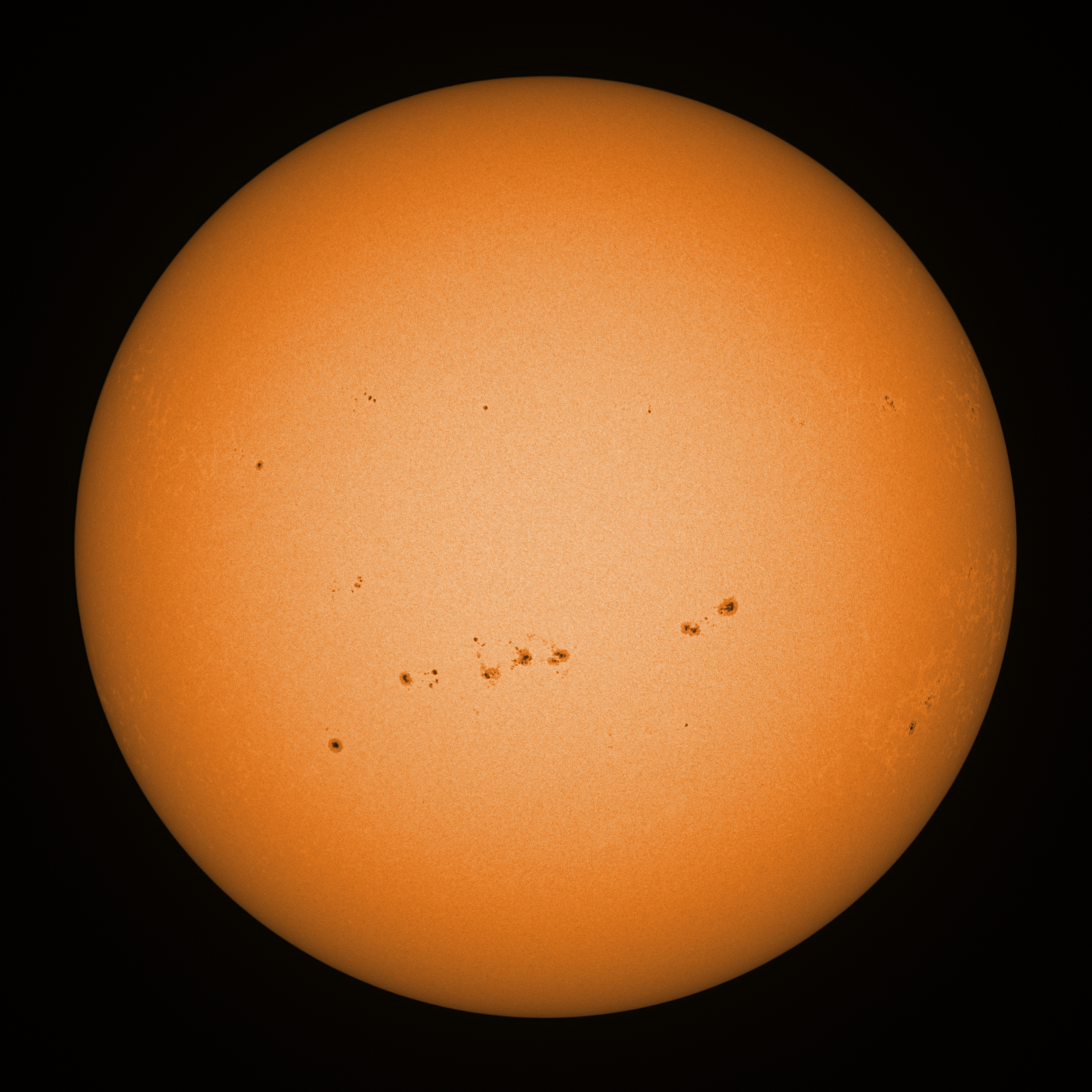 Observation date/time: 19 July 2024 17:11 UTC Telescope: GTT60 (Galileo Type Telescope) Focal length: 1490mm (plano convex singlet) Aperture: 60mm Stop: 30mm Eyepiece: -75mm (plano concave singlet, 24mm aperture) Observation type: projection (350mm distance, 80mm diameter) Reference: Earth's rotation axis Exposure (transparency): 0.800ms (using 82nm bandwidth green filter) Seeing (SSSMon): 6.5-7.0" (3.5" at best) =================================================================== Total number of sunspots: 38 | |
